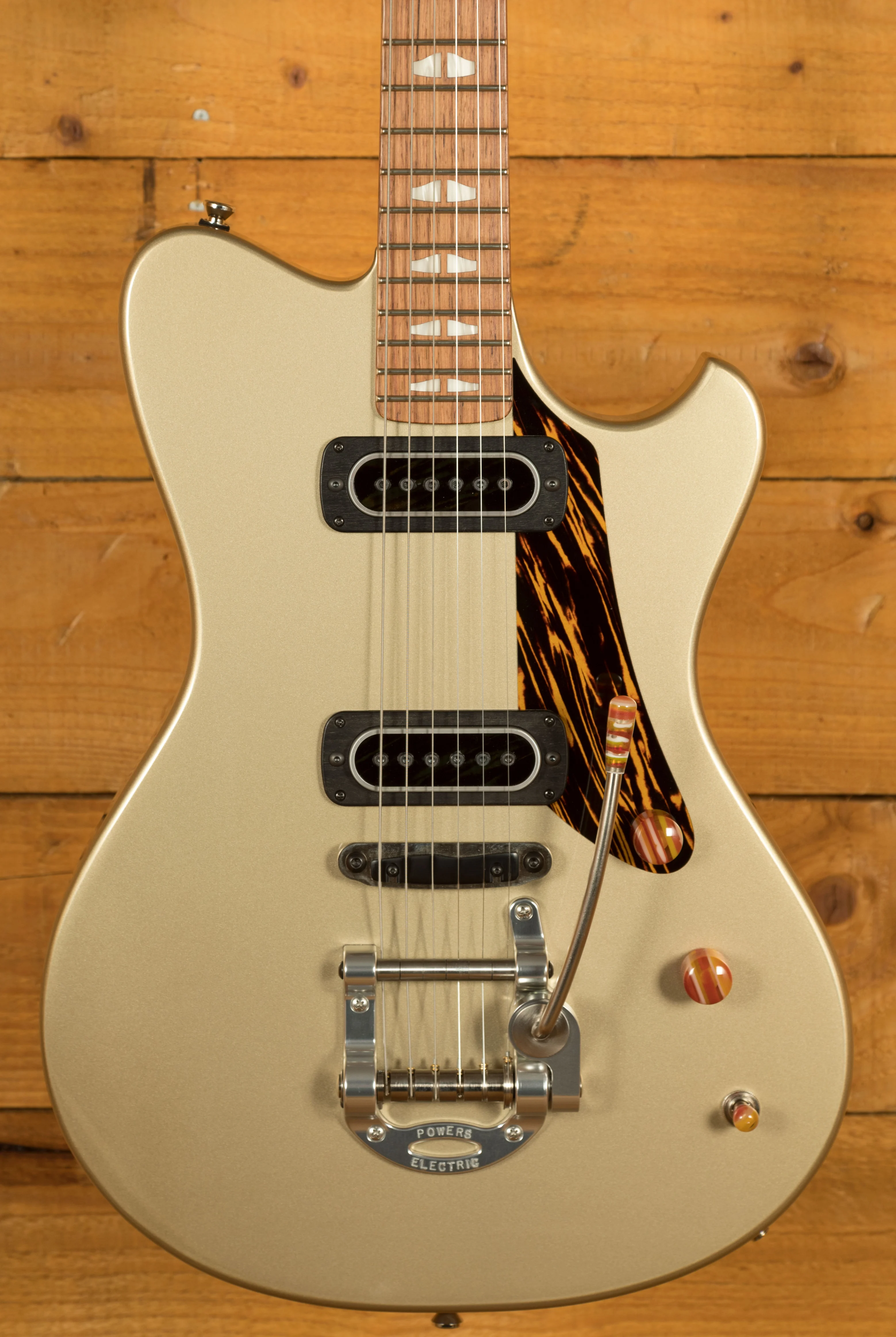 The Powers Electric A-Type prioritises player comfort and playability. Its lightweight, hollow body ensures effortless handling whether standing or sitting, while the contoured armrest and radiused body edges enhance the overall playing experience. The neck is a perfect blend of size, offering a smooth transition into the unique split radius fretboard. This asymmetrical fretboard, which is flatter on the treble side, allows for seamless string bending and maximum playability, encouraging players to explore new ideas and express their unique sound.