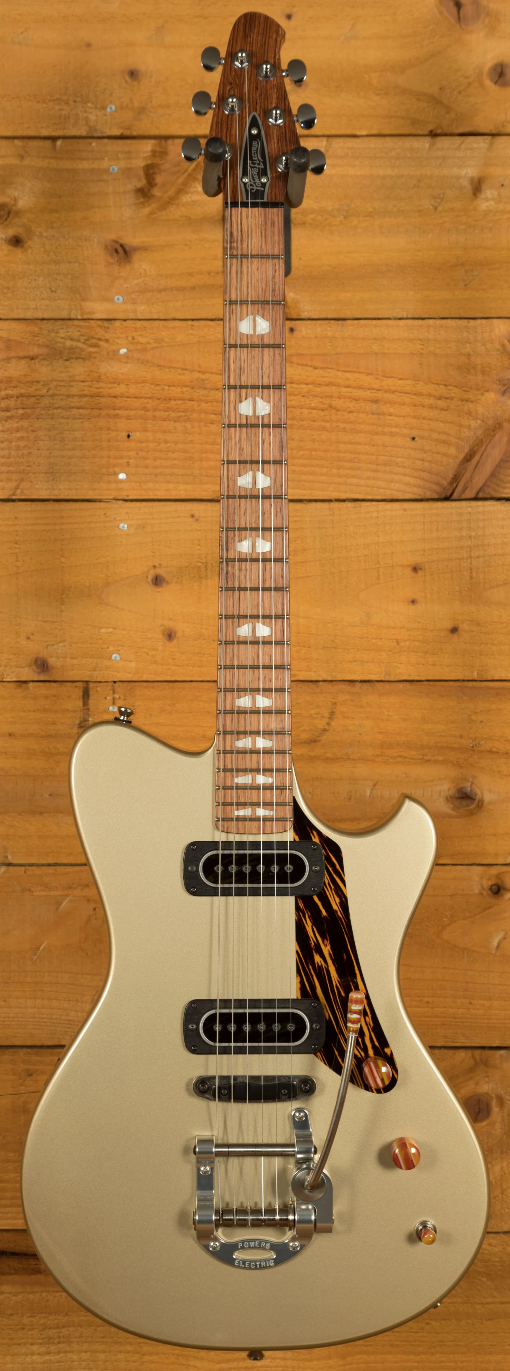 The A-Type's design is influenced by the sleek lines of classic cars, hot rods, and surfboards, reflecting the dynamic culture of San Diego's North County. This area, rich in surfing, skateboarding, auto craft, music, art, and architecture, has deeply influenced Powers' approach. The guitar's asymmetrical shape balances visual appeal with ergonomic efficiency, resulting in a fully enclosed, slim hollowbody design that is as beautiful as it is functional.