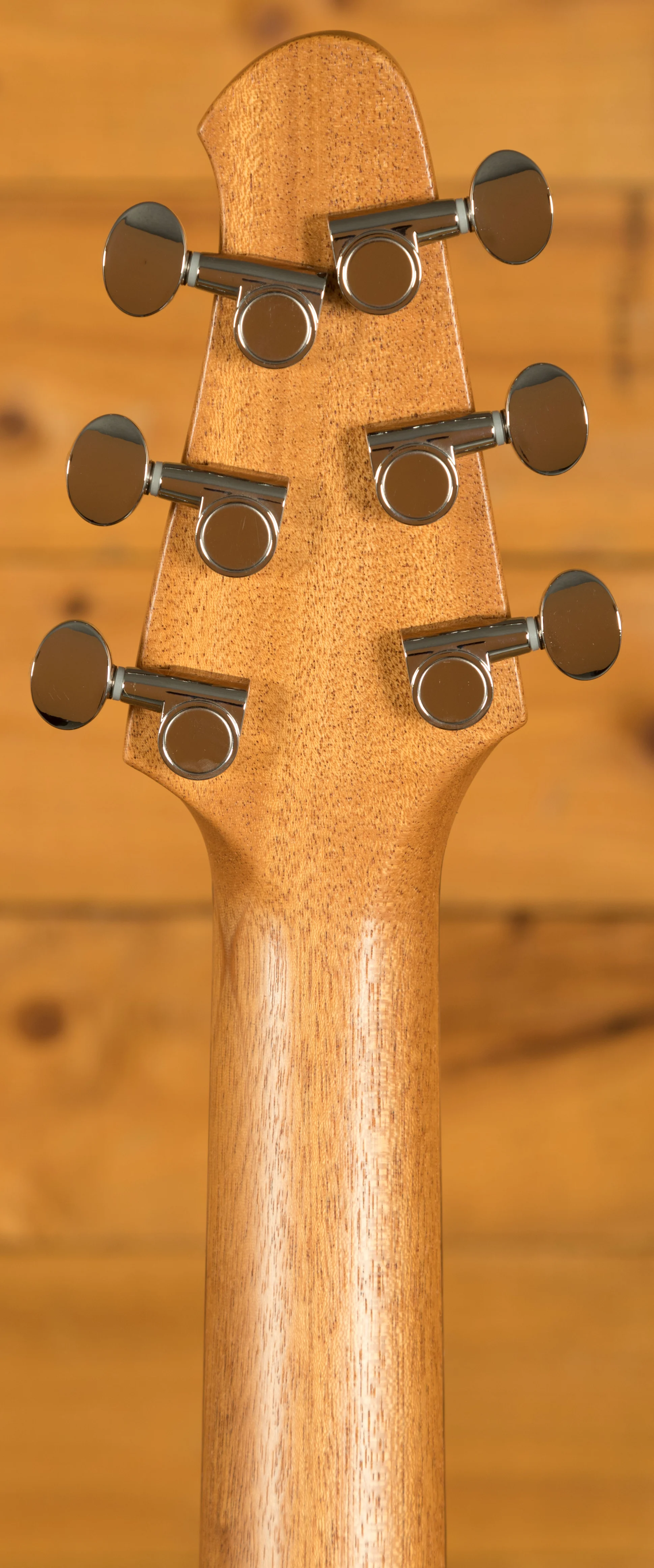 The A-Type features a top-loading hardtail bridge, which provides stability and ease of use, enhancing the guitar's tonal quality and ensuring consistent performance. The guitar's select figured flame maple top with a transparent finish adds a touch of elegance and sophistication, showcasing the natural beauty of the wood. The Firestripe pickguard complements the transparent finish, adding to the guitar's visual appeal. Ebony saddle material further enhances the guitar's durability and tonal richness.