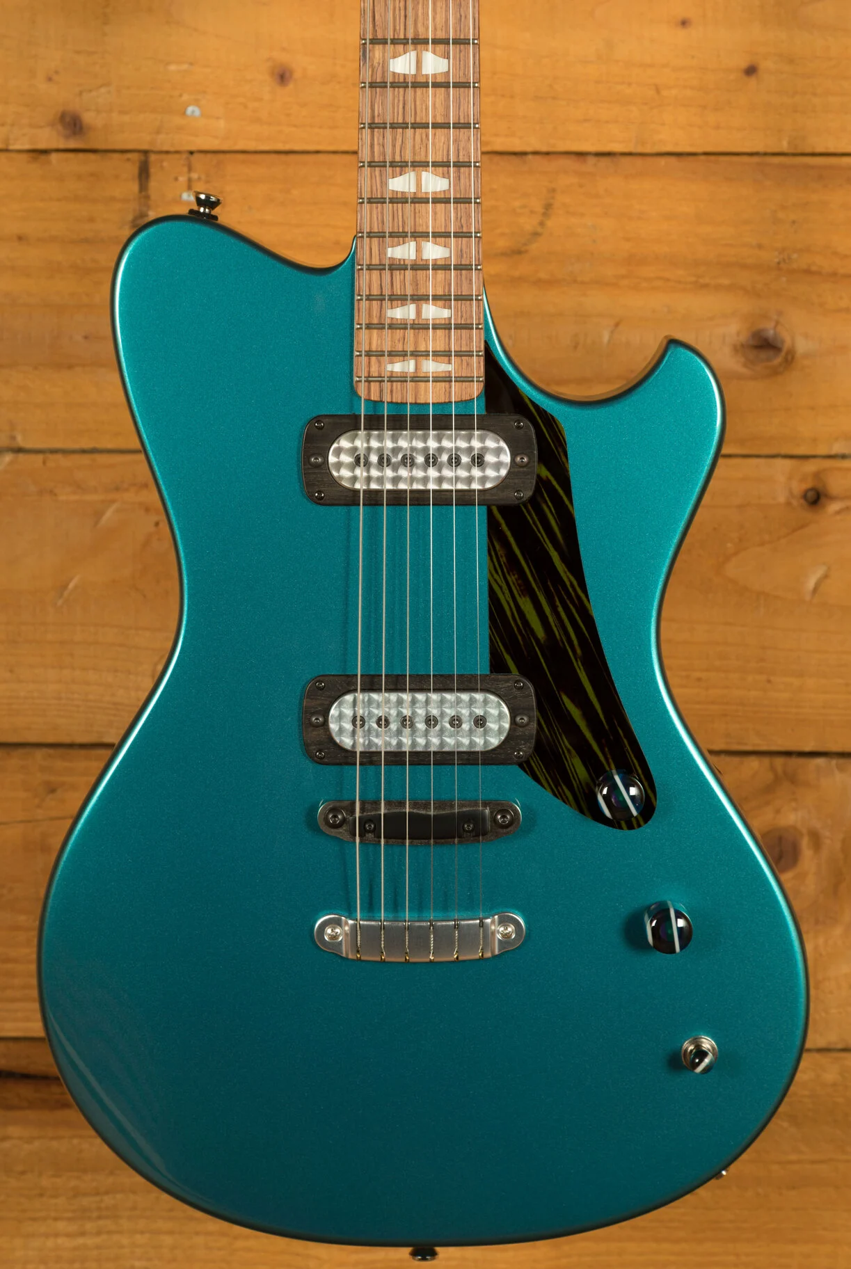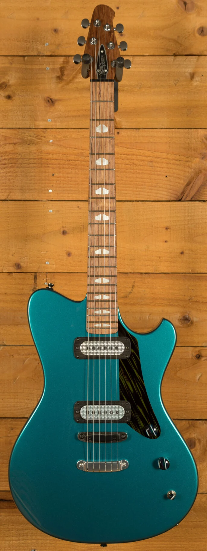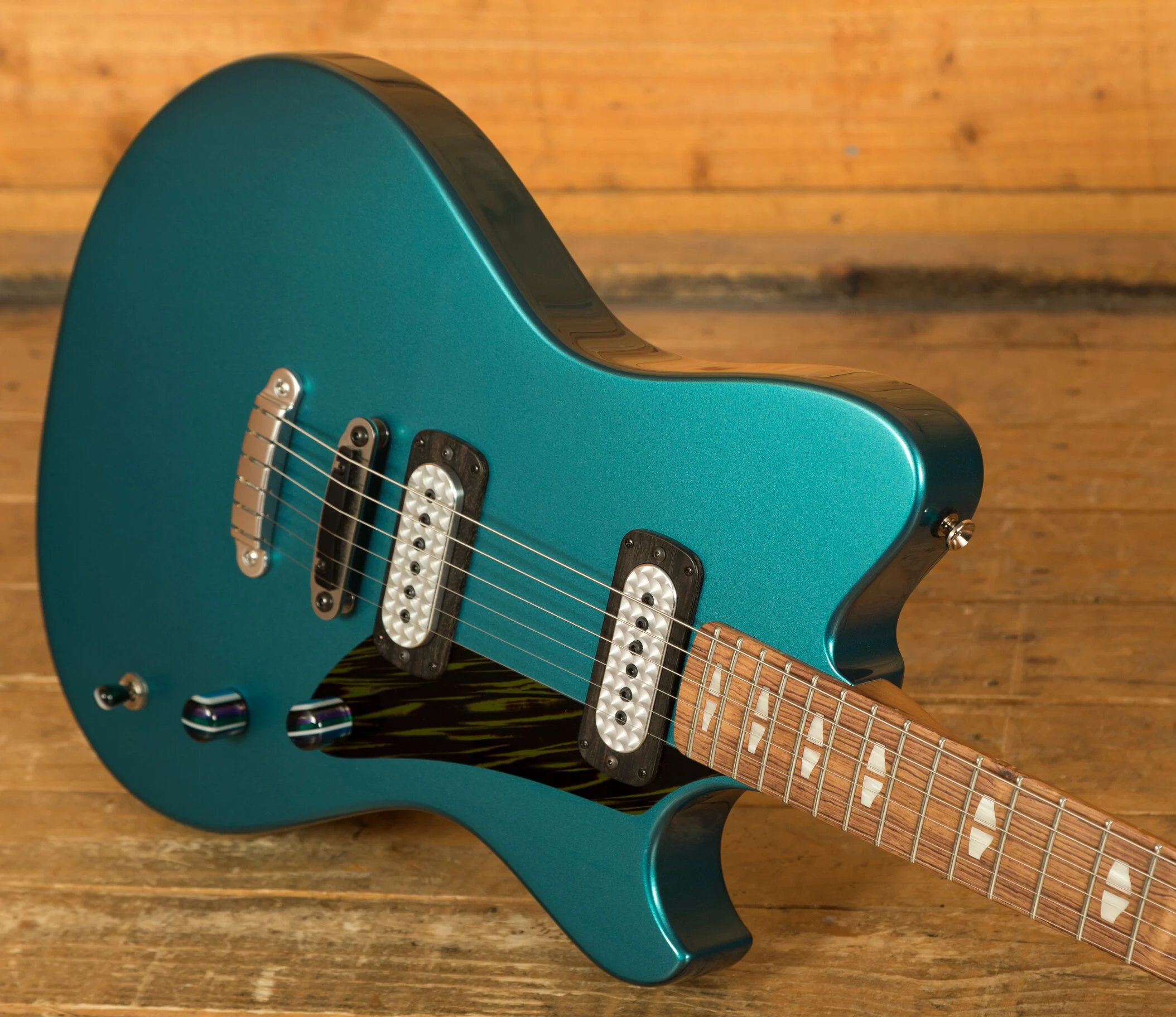 The A-Type's design is influenced by the sleek lines of classic cars, hot rods, and surfboards, reflecting the dynamic culture of San Diego's North County. This area, rich in surfing, skateboarding, auto craft, music, art, and architecture, has deeply influenced Powers' approach. The guitar's asymmetrical shape balances visual appeal with ergonomic efficiency, resulting in a fully enclosed, slim hollowbody design that is as beautiful as it is functional.