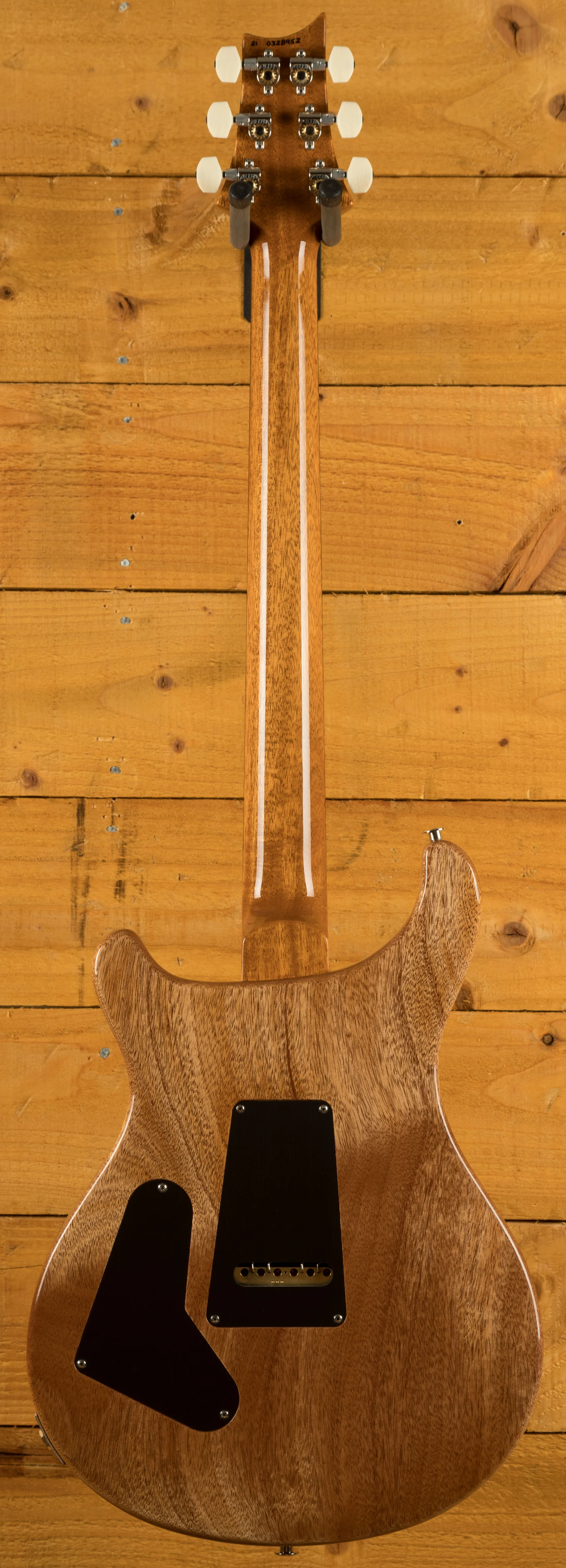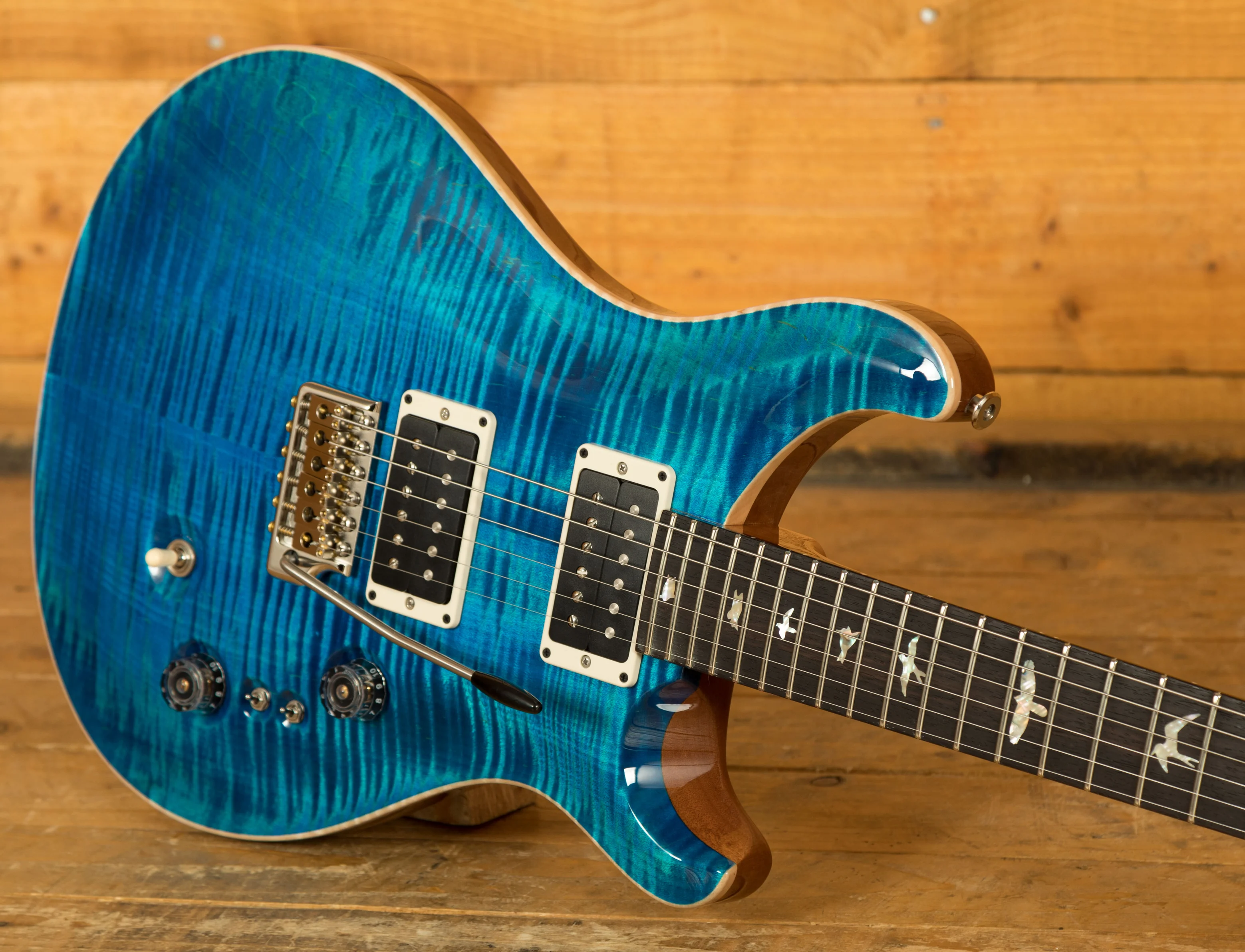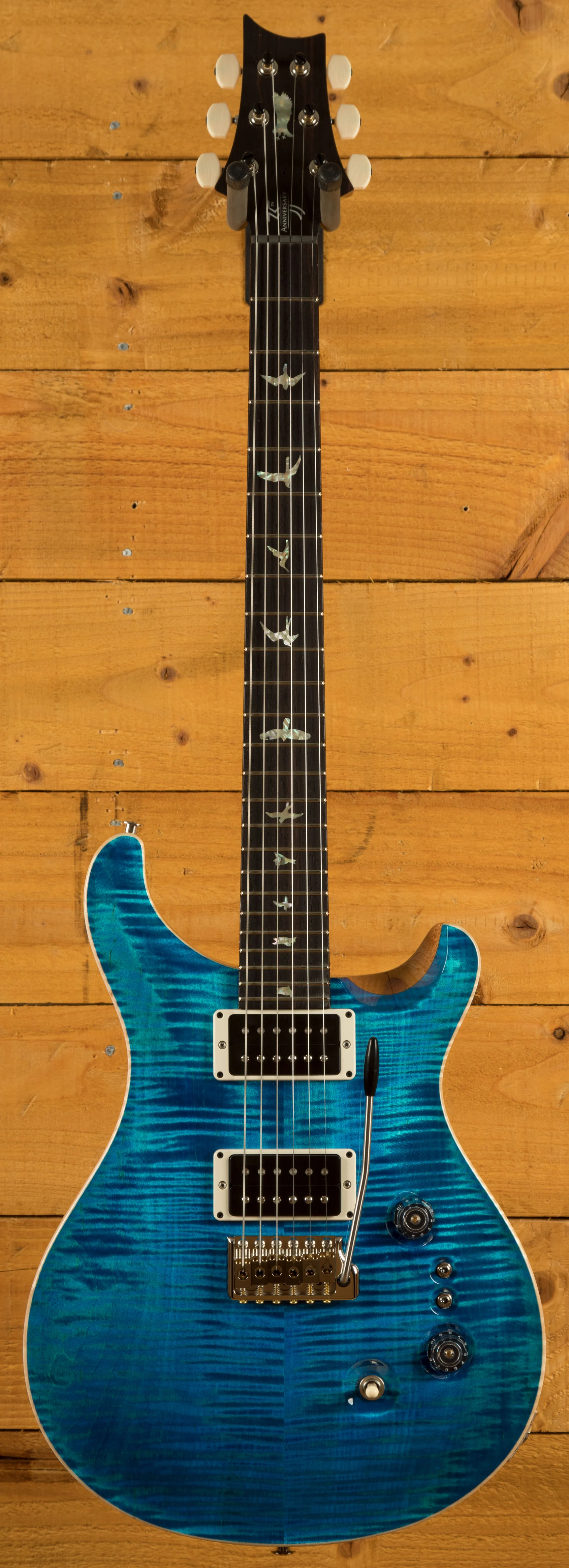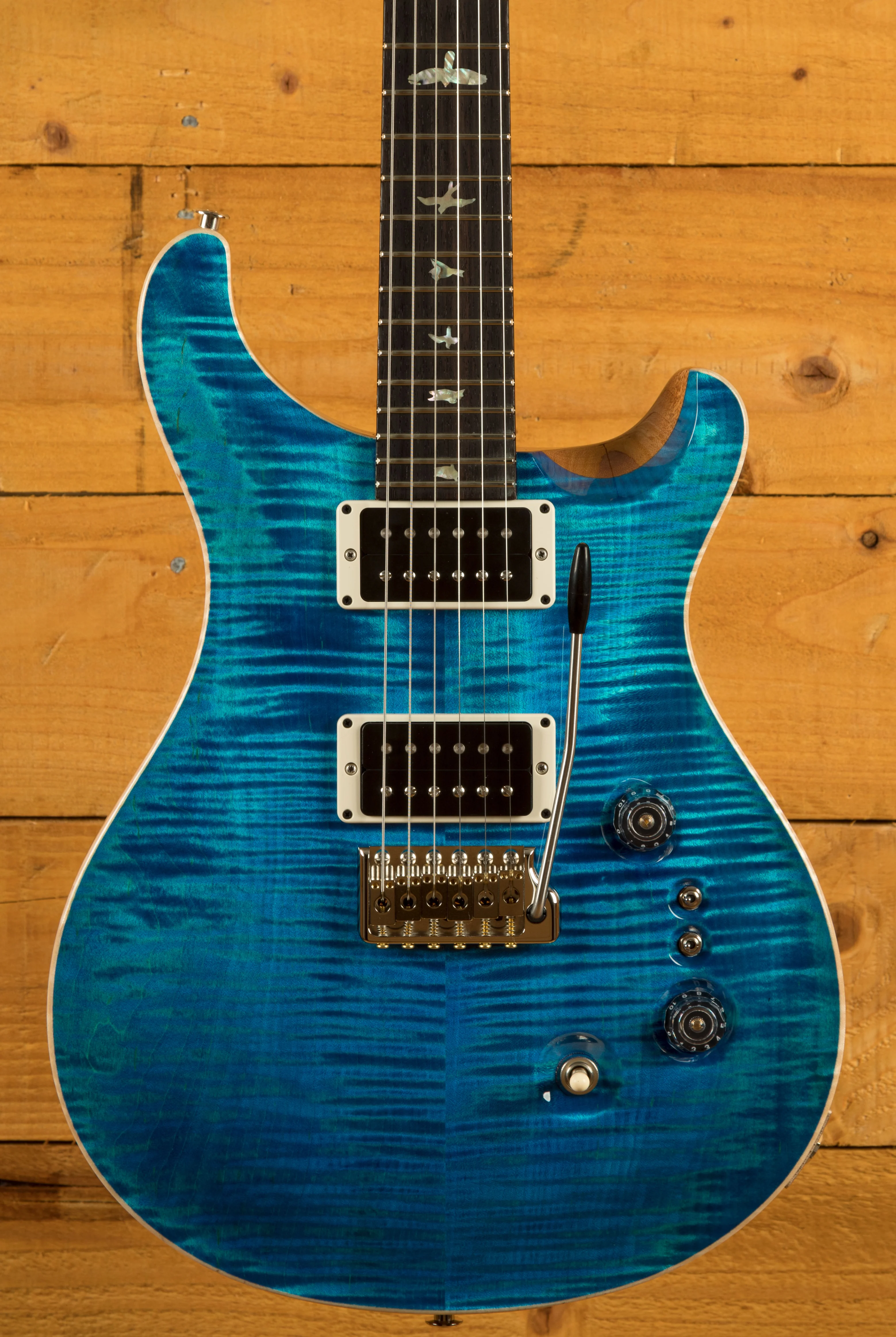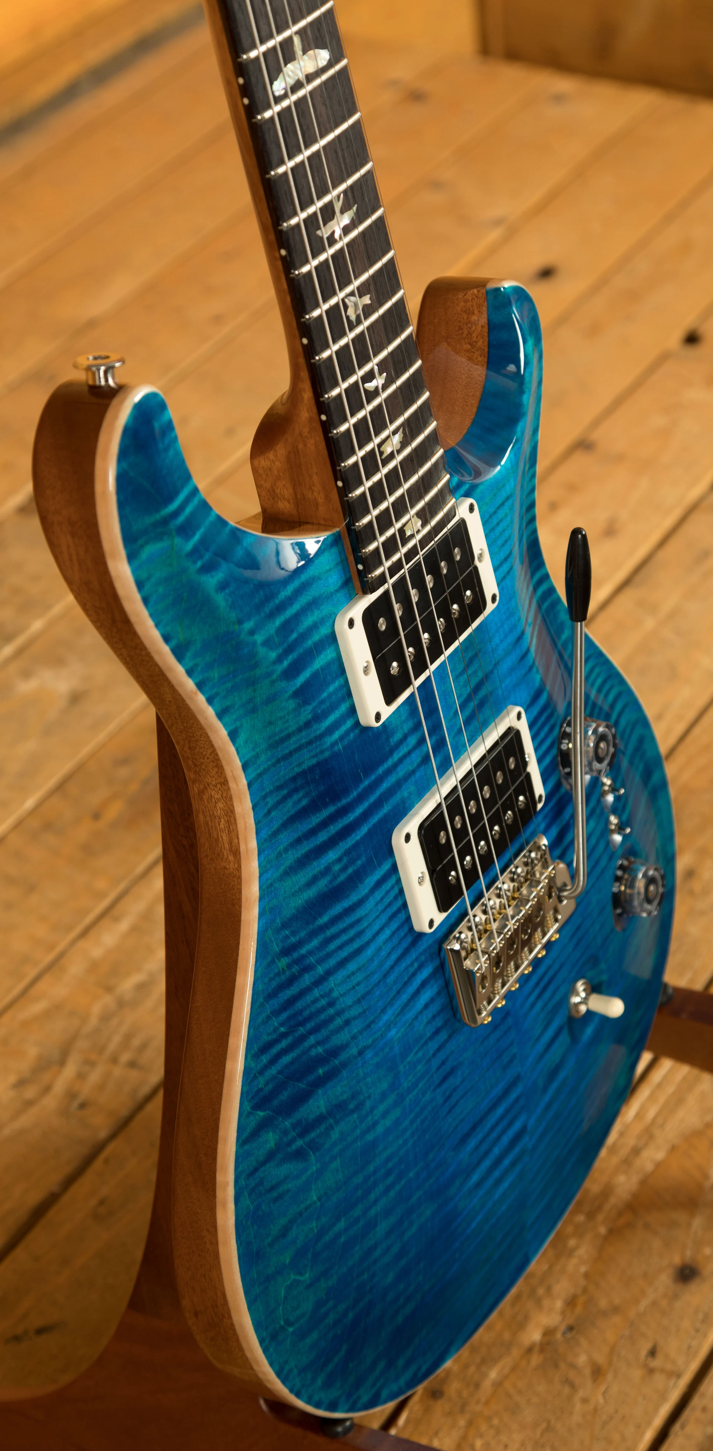The Mahogany body with carved figured Maple top a offers a rich warmth and depth that complements the beautiful Aquamarine finish. With a 25" scale length, Pattern Regular profile and of course, 24 frets, the Mahogany neck feels really comfortable and familiar. The iconic PRS birds sit proudly atop the Rosewood fingerboard for the definitive PRS experience.