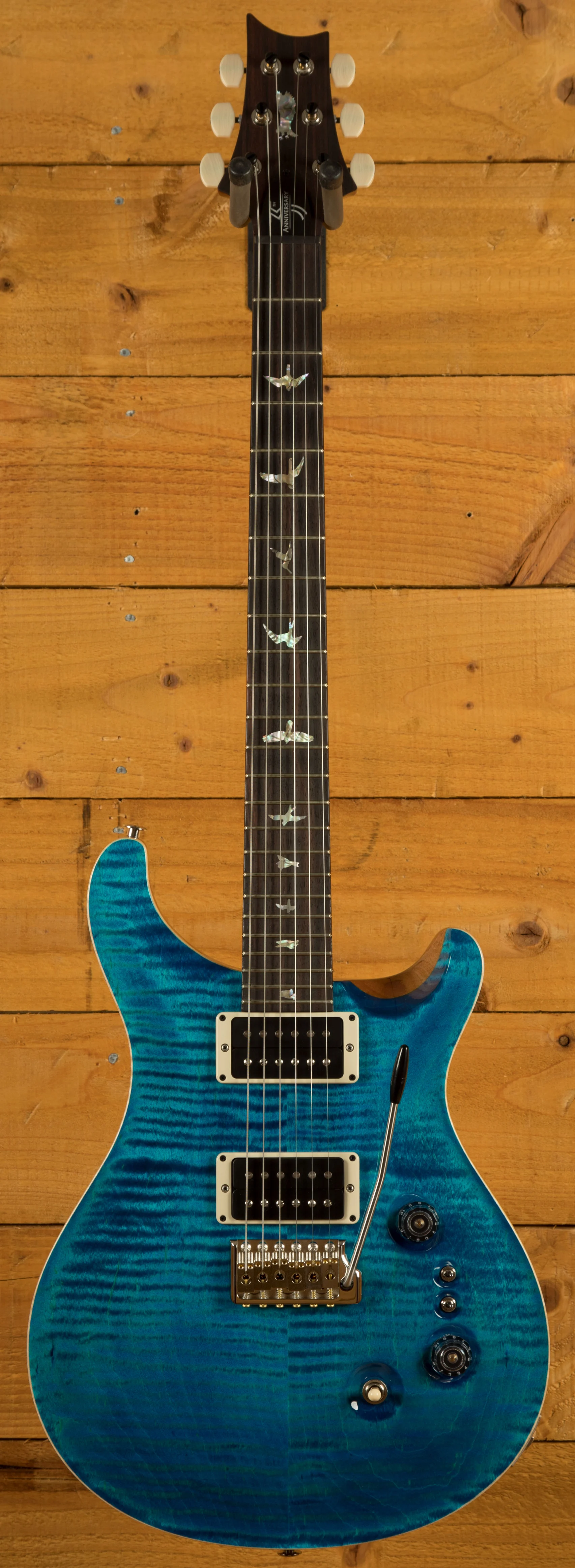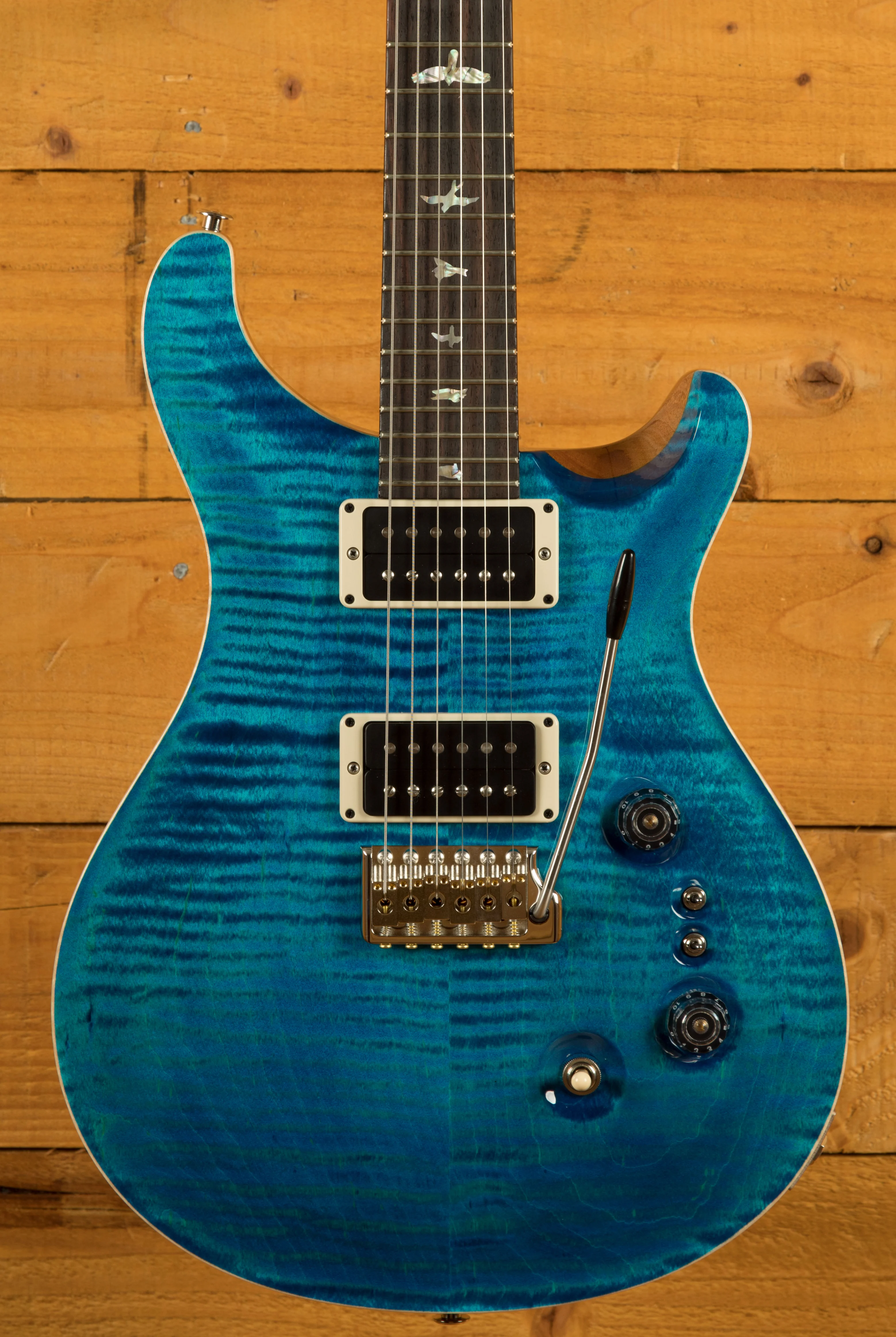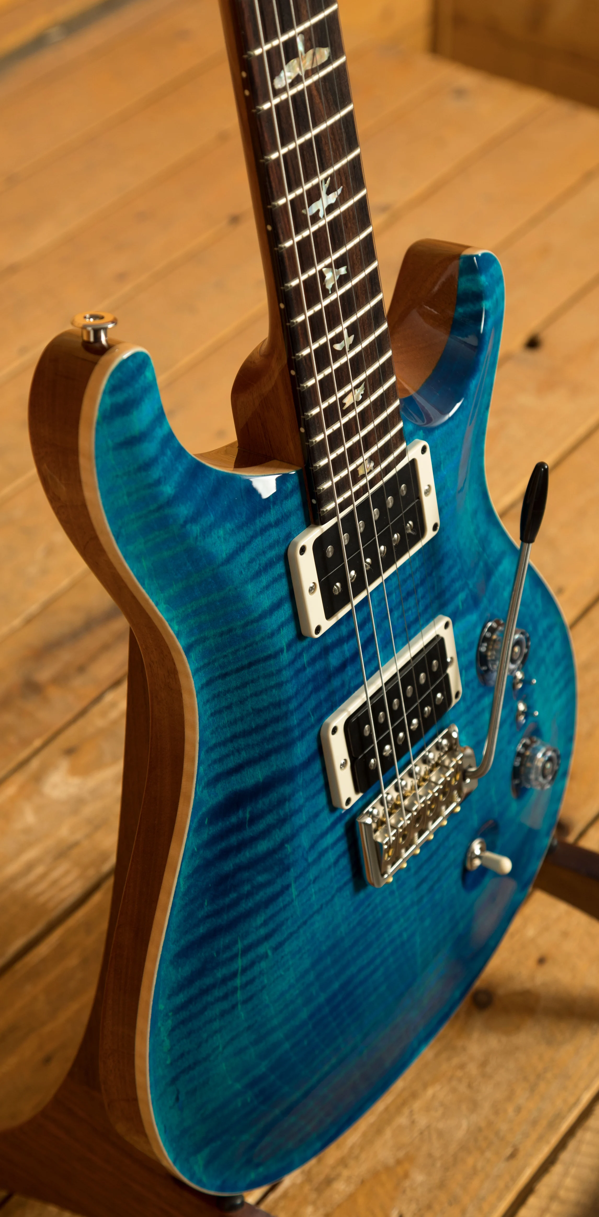 The Mahogany body with carved figured Maple top a offers a rich warmth and depth that complements the beautiful Aquamarine finish. With a 25" scale length, Pattern Regular profile and of course, 24 frets, the Mahogany neck feels really comfortable and familiar. The iconic PRS birds sit proudly atop the Rosewood fingerboard for the definitive PRS experience.
