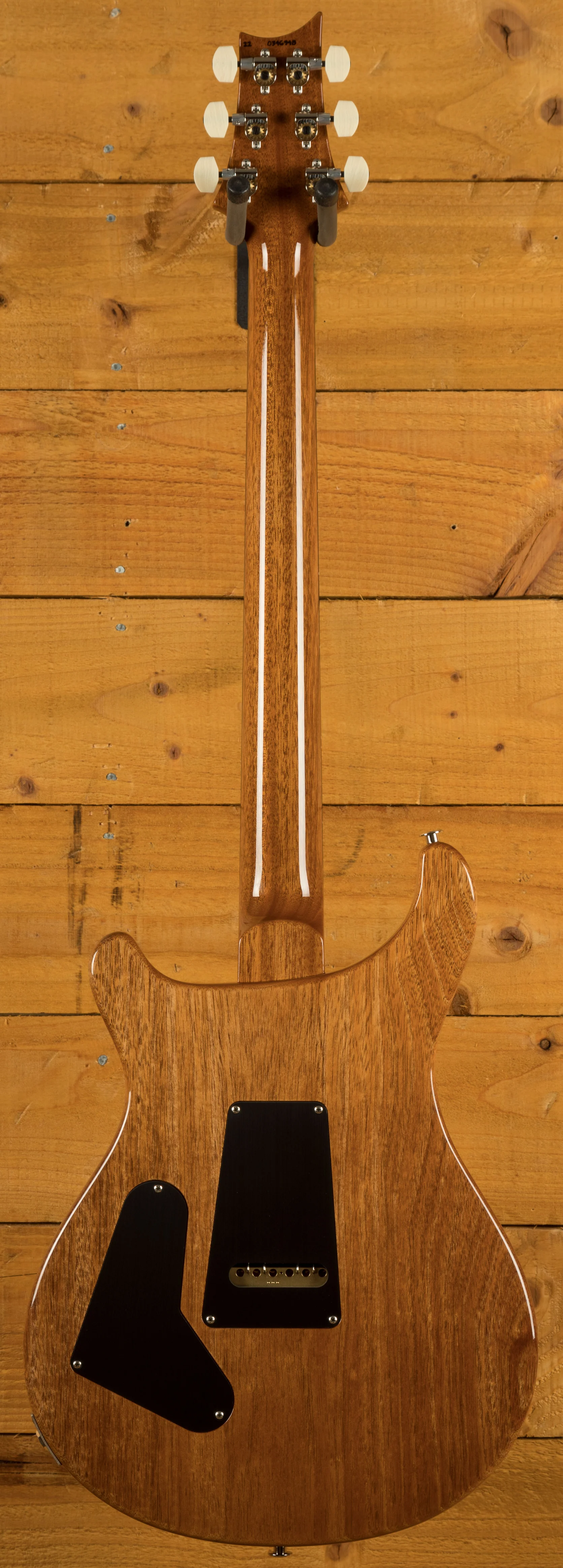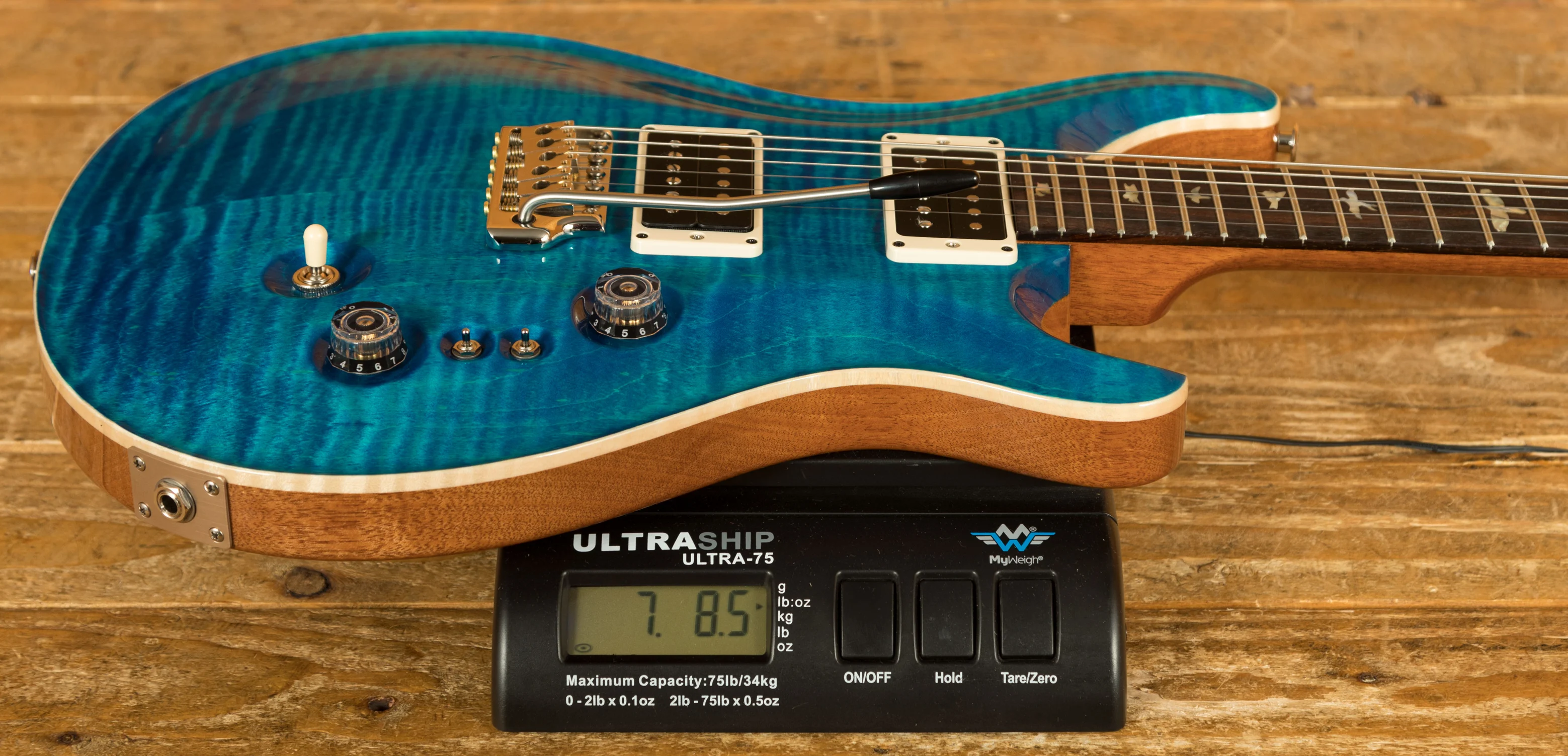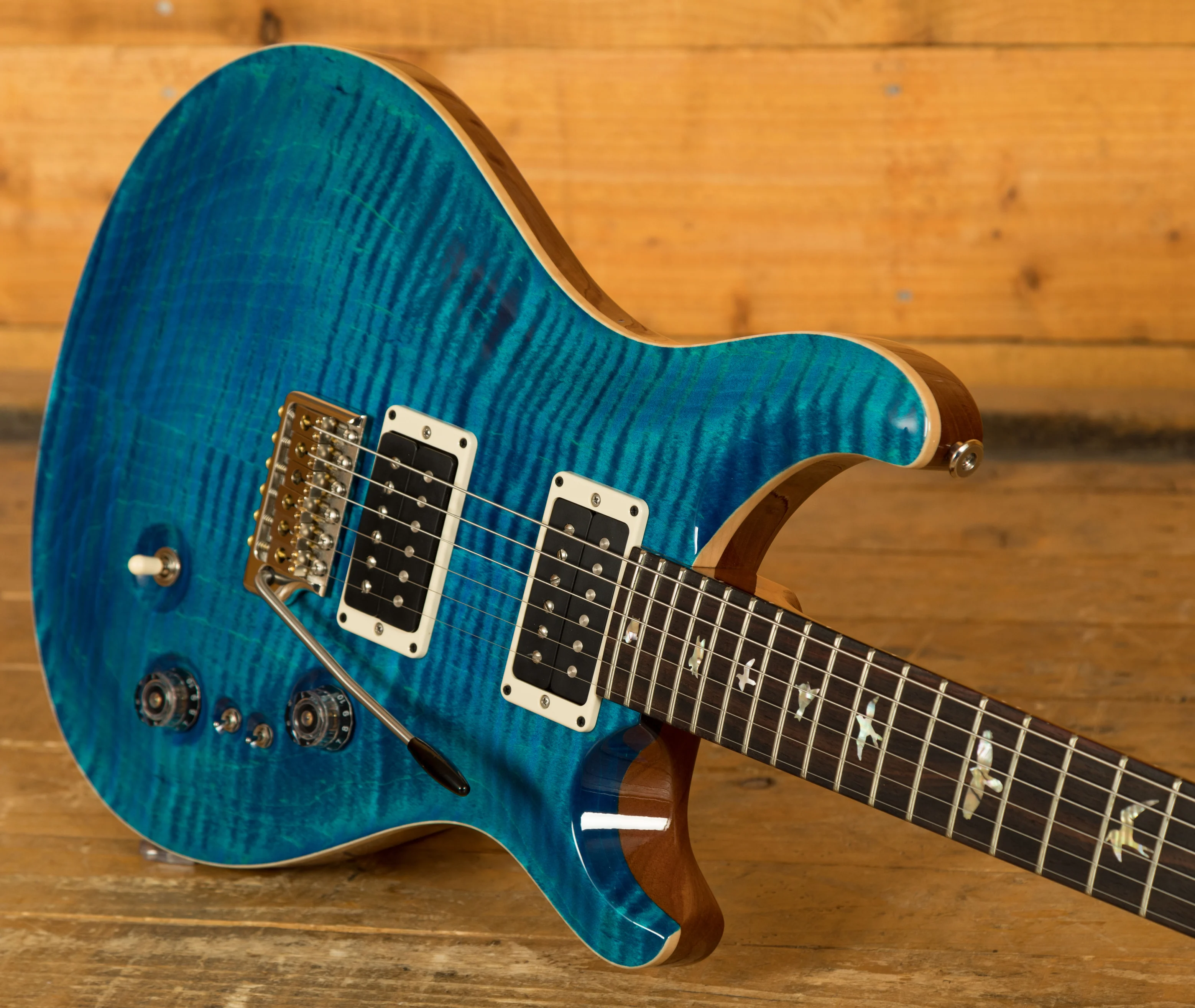 The Mahogany body with carved figured Maple top a offers a rich warmth and depth that complements the beautiful Aquamarine finish. With a 25" scale length, Pattern Regular profile and of course, 24 frets, the Mahogany neck feels really comfortable and familiar. The iconic PRS birds sit proudly atop the Rosewood fingerboard for the definitive PRS experience.