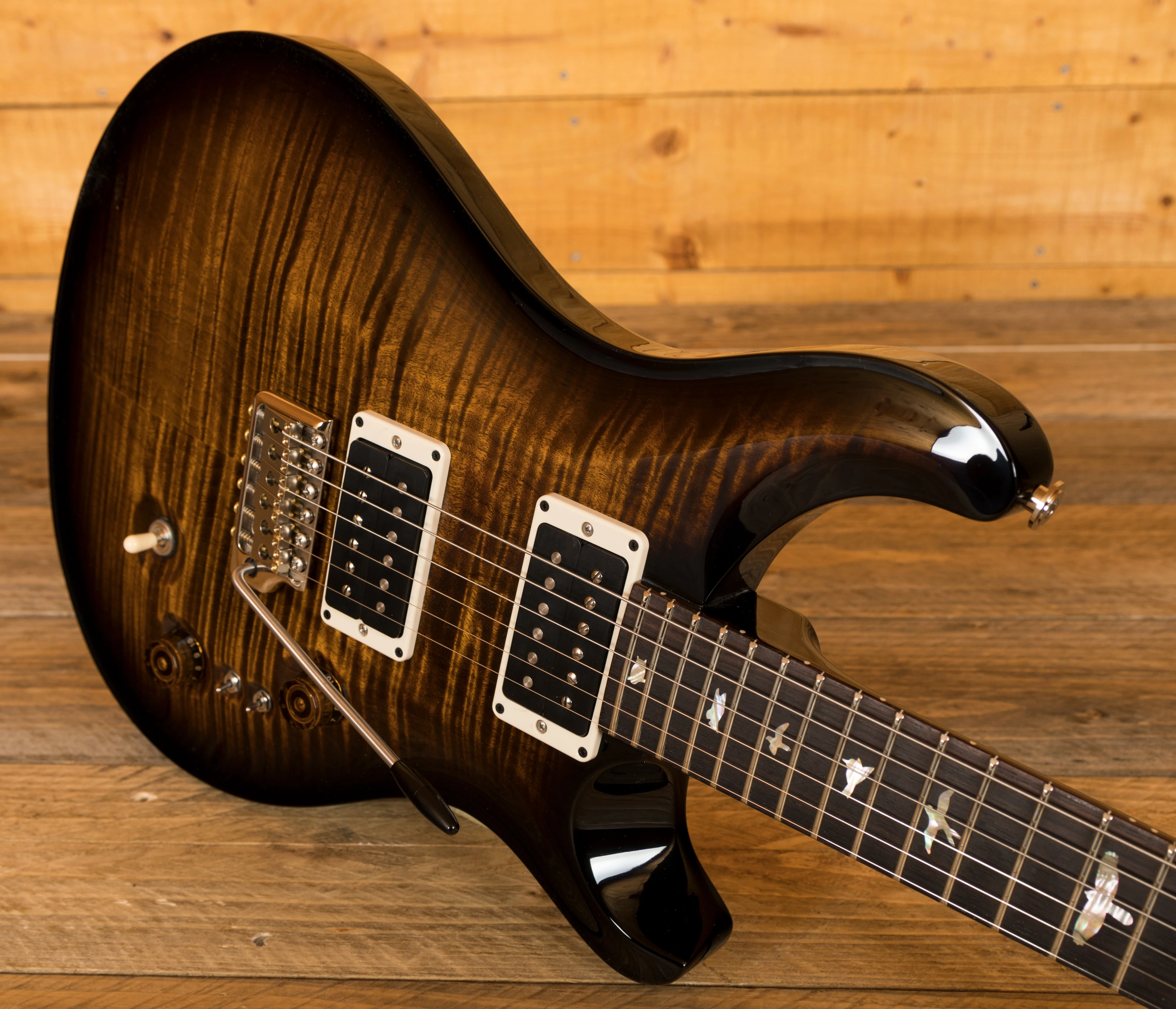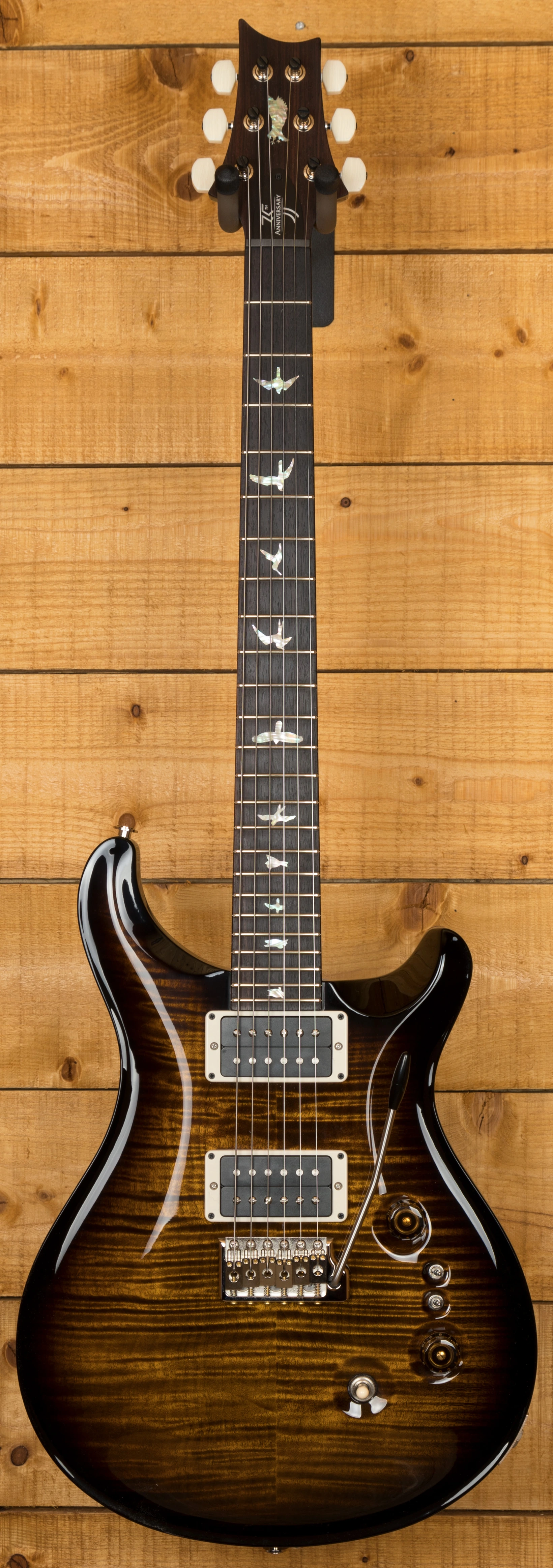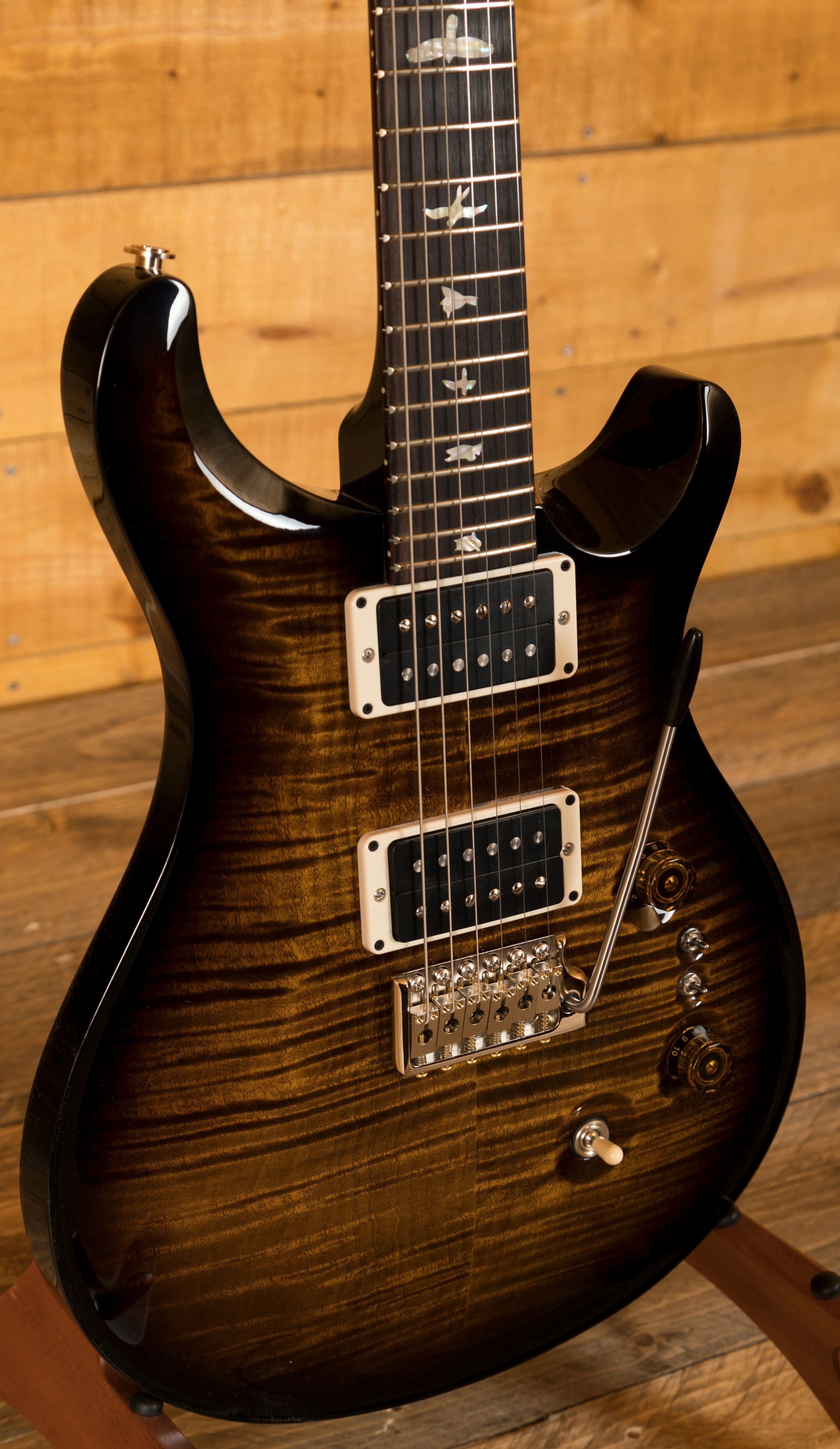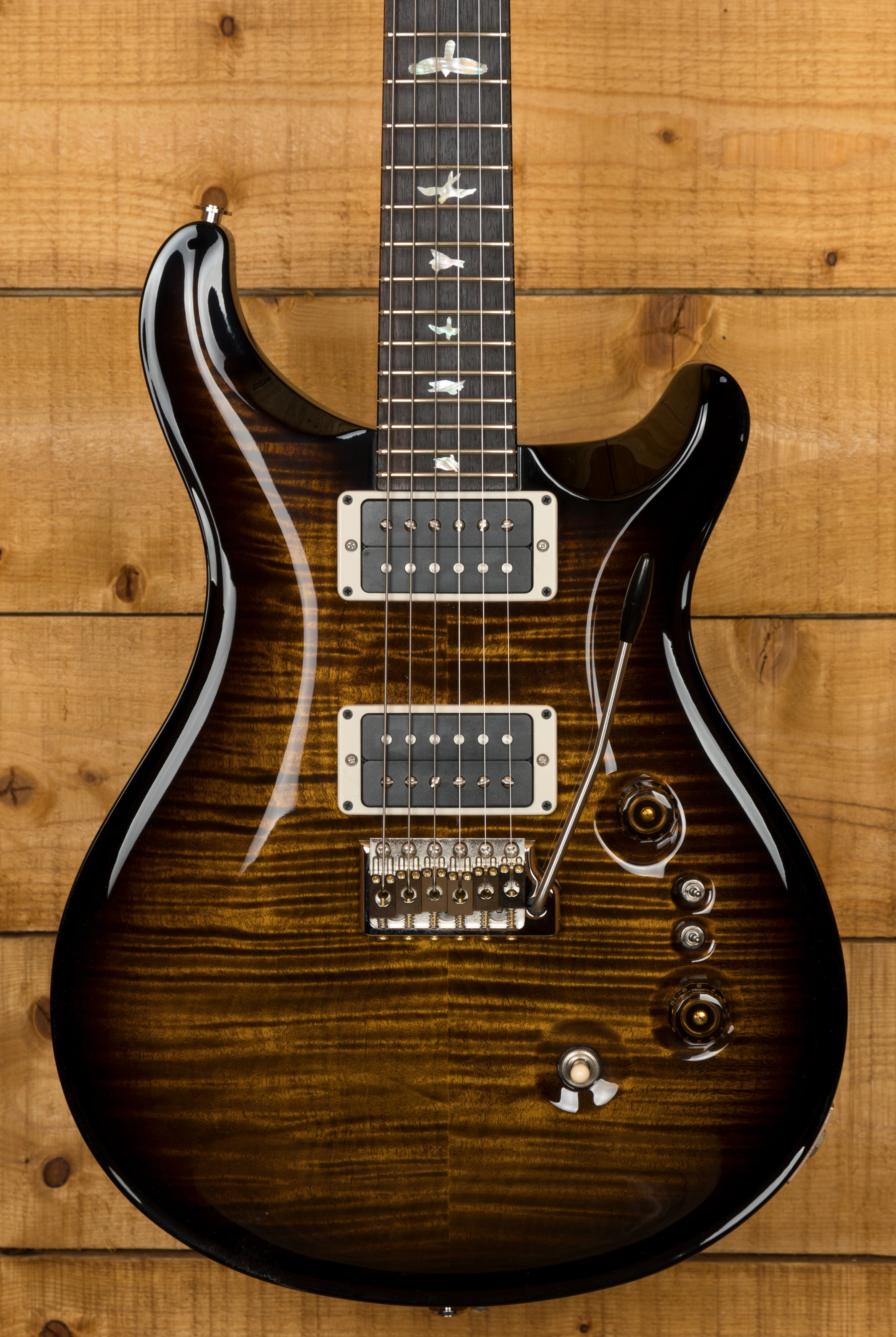 The Mahogany body with carved figured Maple top a offers a rich warmth and depth that complements the beautiful Yellow Tiger Smokeburst Custom Colour finish. With a 25" scale length, Pattern Regular profile and of course, 24 frets, the Mahogany neck feels really comfortable and familiar. The iconic PRS birds sit proudly atop the Rosewood fingerboard for the definitive PRS experience.