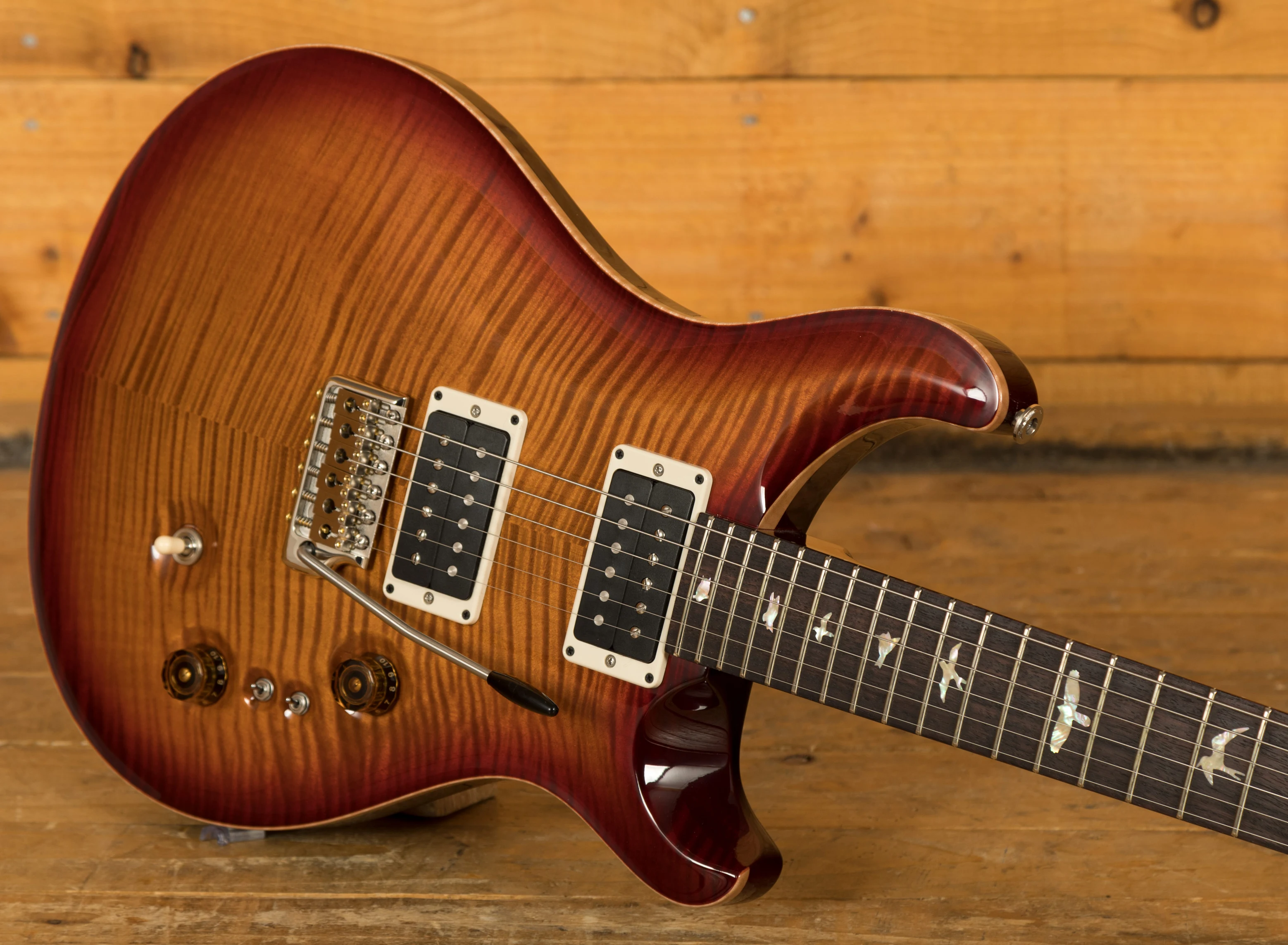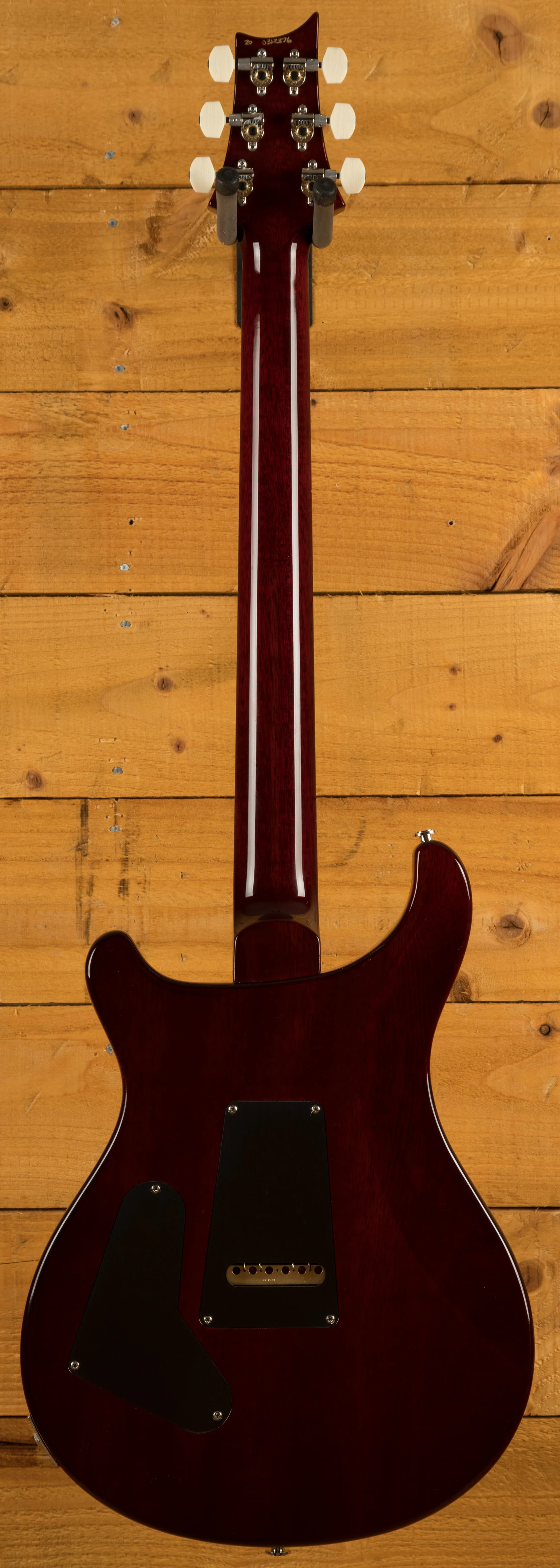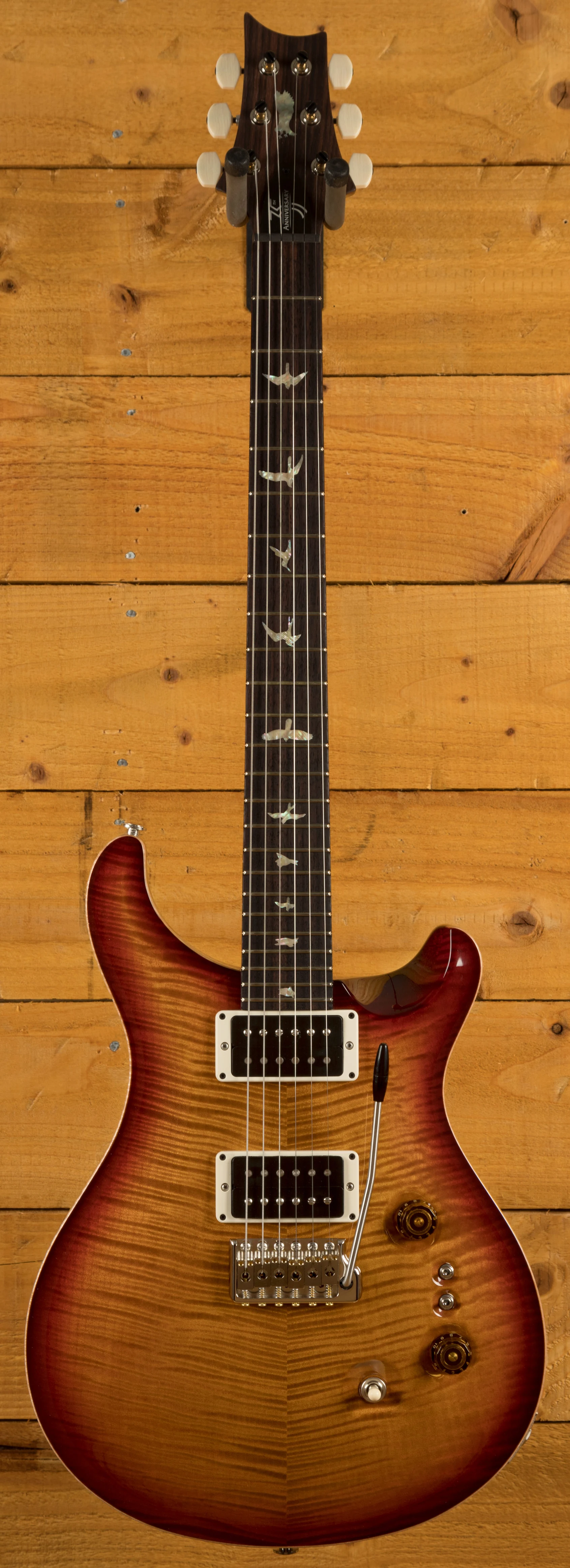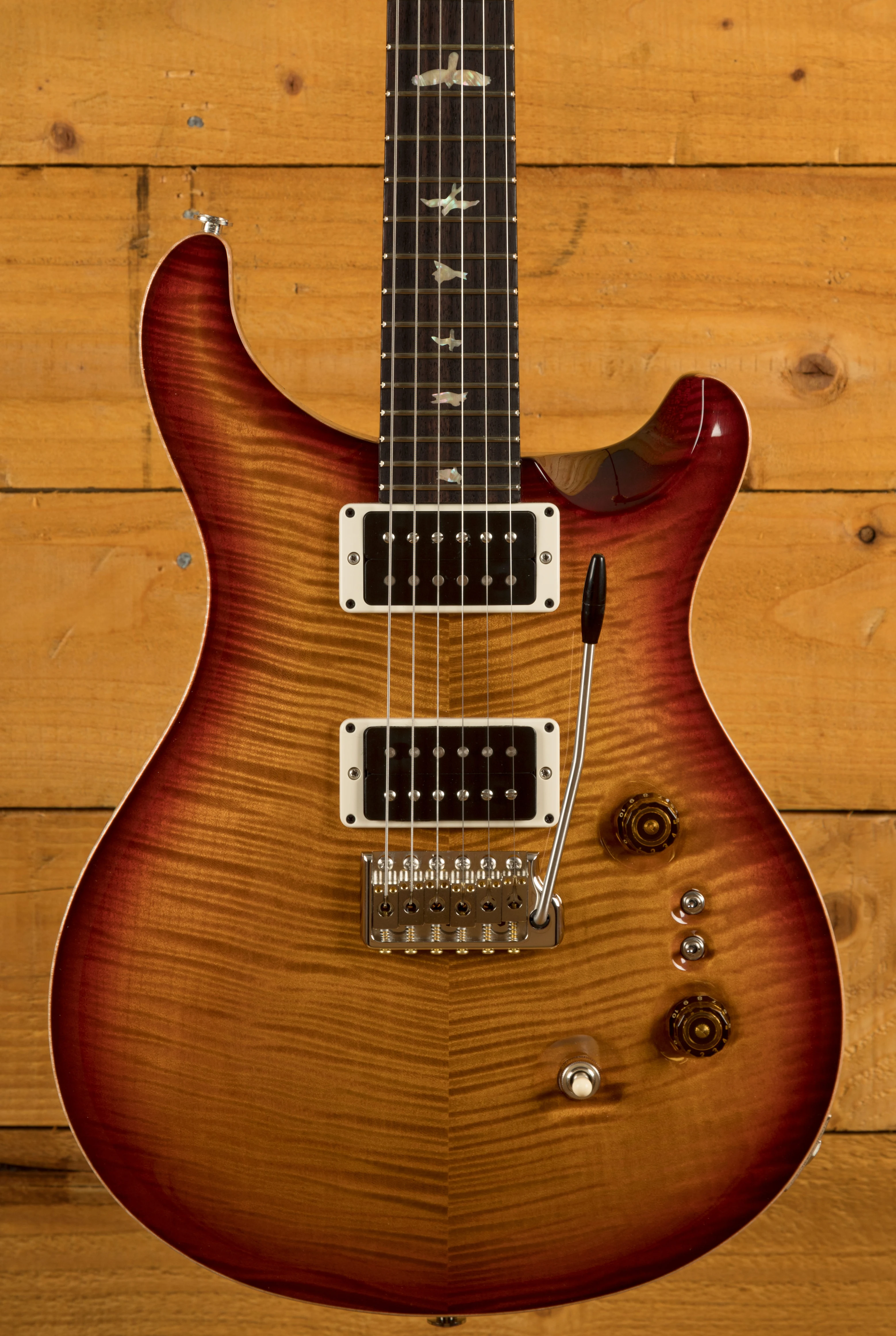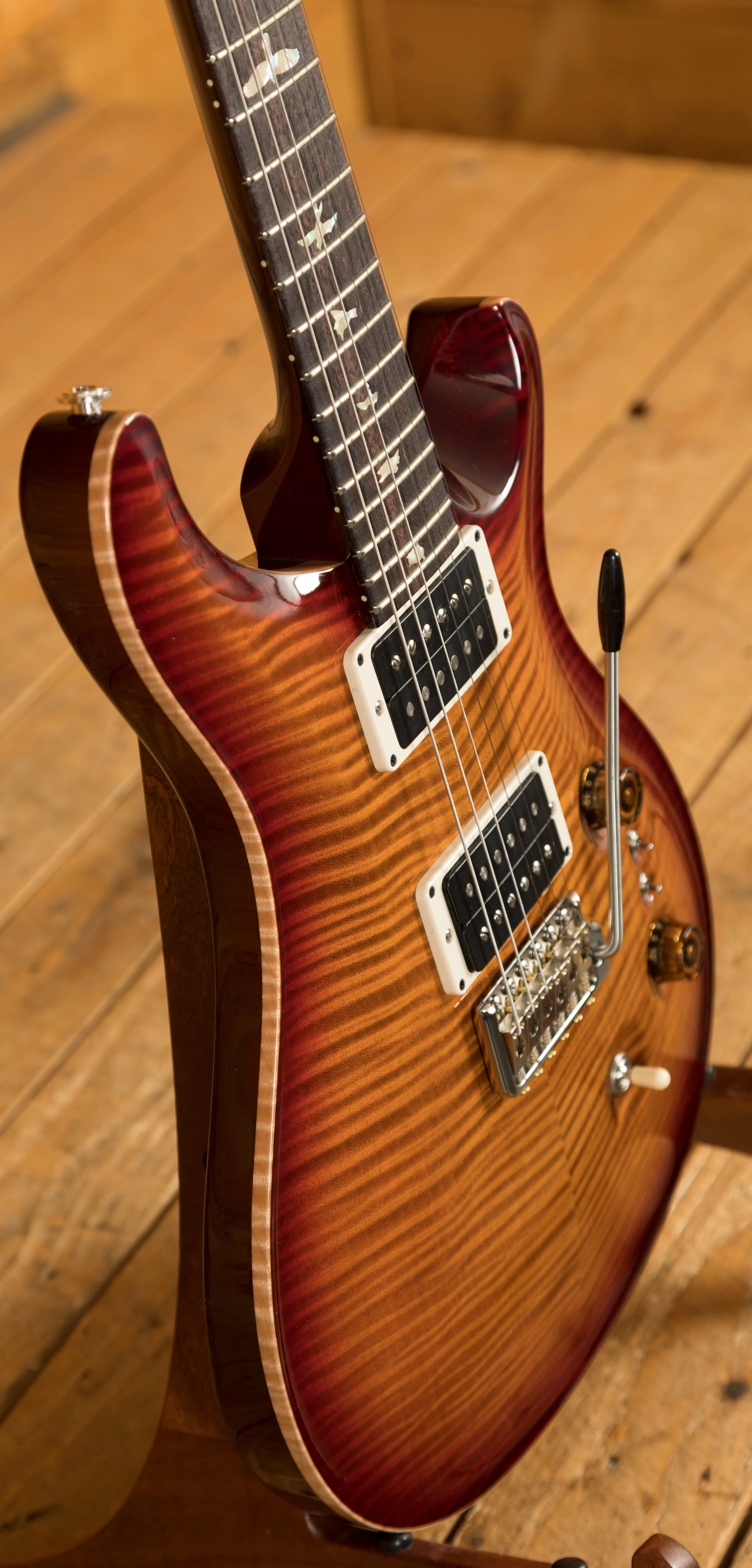 The Mahogany body with carved figured Maple top a offers a rich warmth and depth that complements the beautiful Dark Cherry Sunburst finish. With a 25" scale length, Pattern Thin profile and of course, 24 frets, the Mahogany neck feels really comfortable and familiar. The iconic PRS birds sit proudly atop the Rosewood fingerboard for the definitive PRS experience.