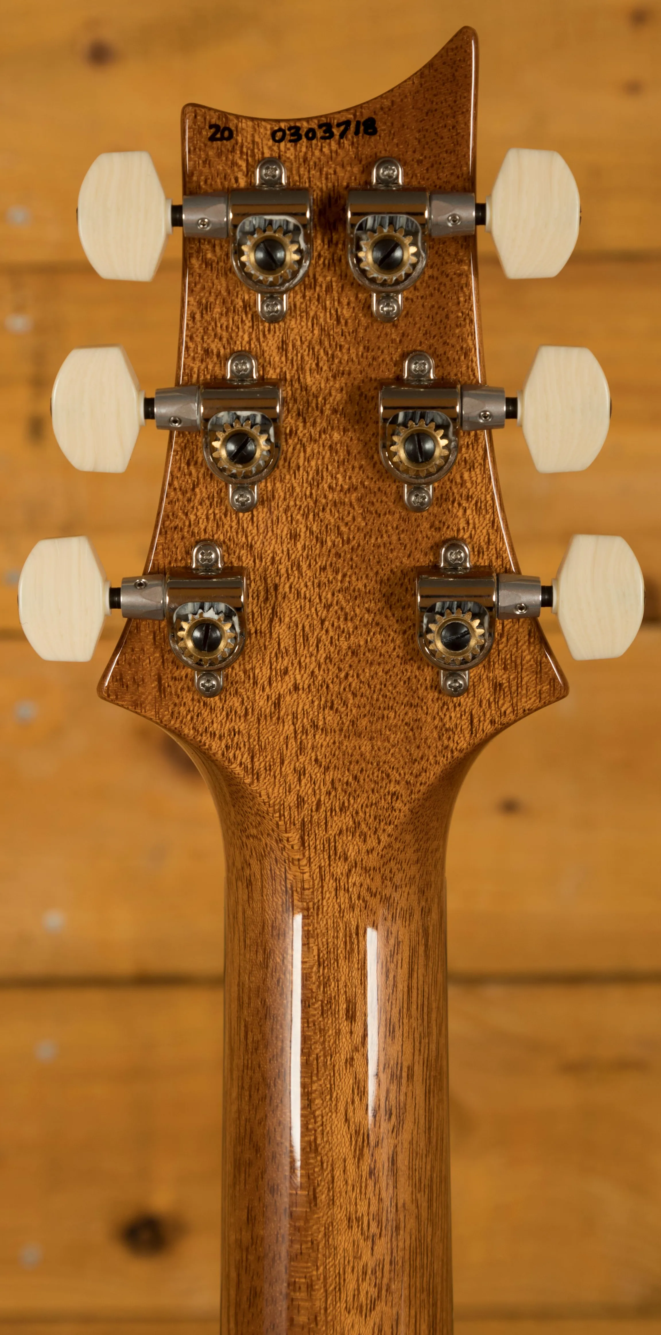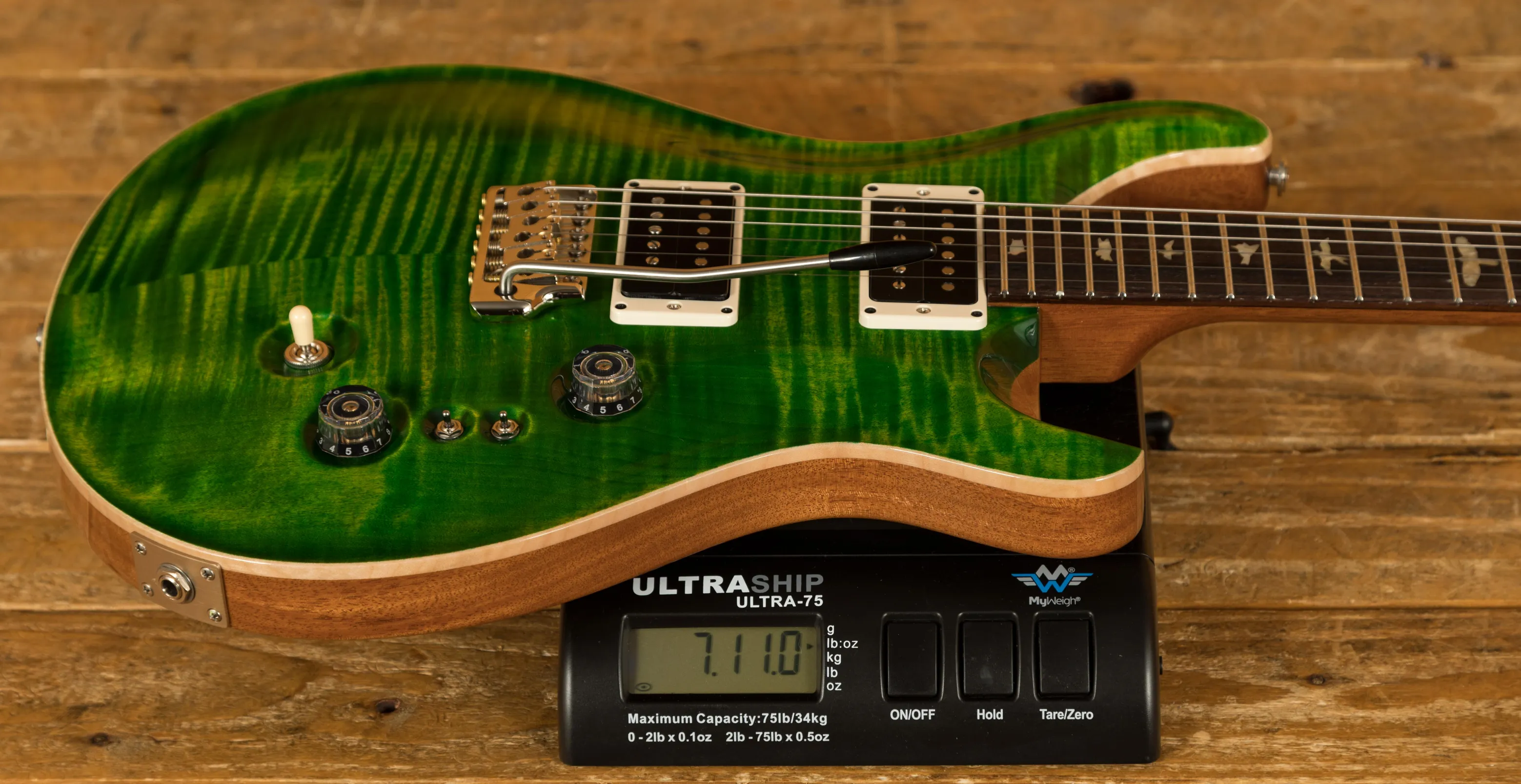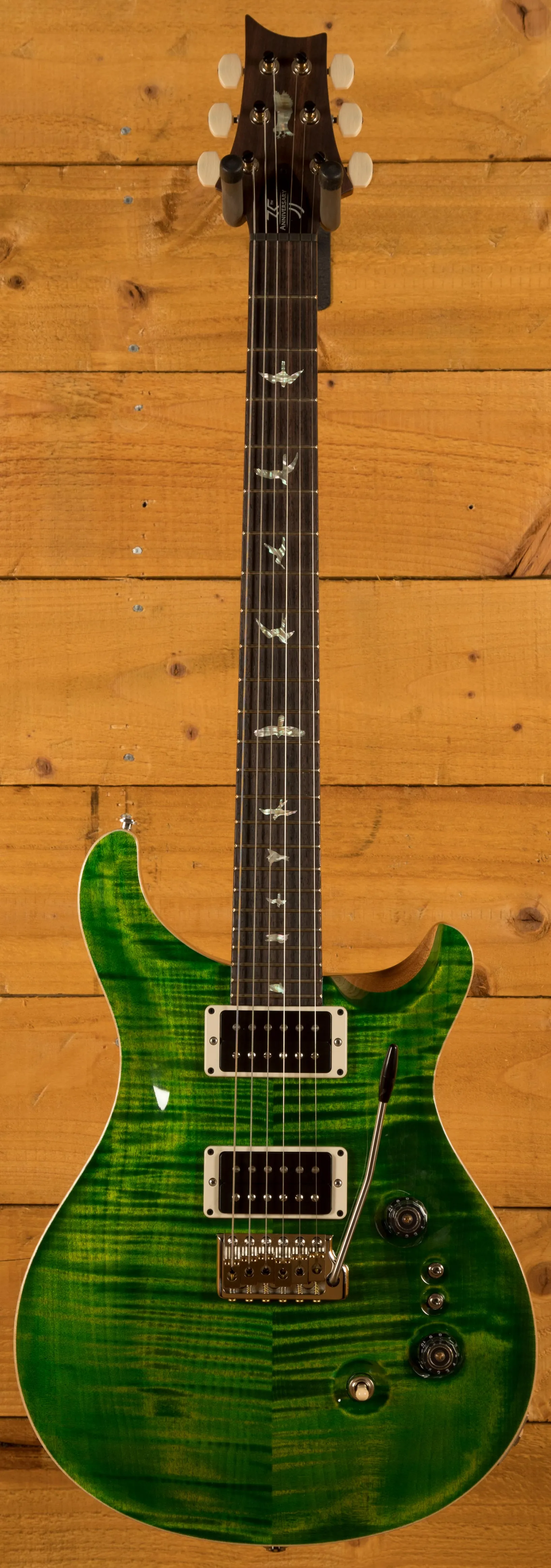 The Mahogany body with carved figured Maple top a offers a rich warmth and depth that complements the beautiful Emerald finish. With a 25" scale length, Pattern Thin profile and of course, 24 frets, the Mahogany neck feels really comfortable and familiar. The iconic PRS birds sit proudly atop the Rosewood fingerboard for the definitive PRS experience.