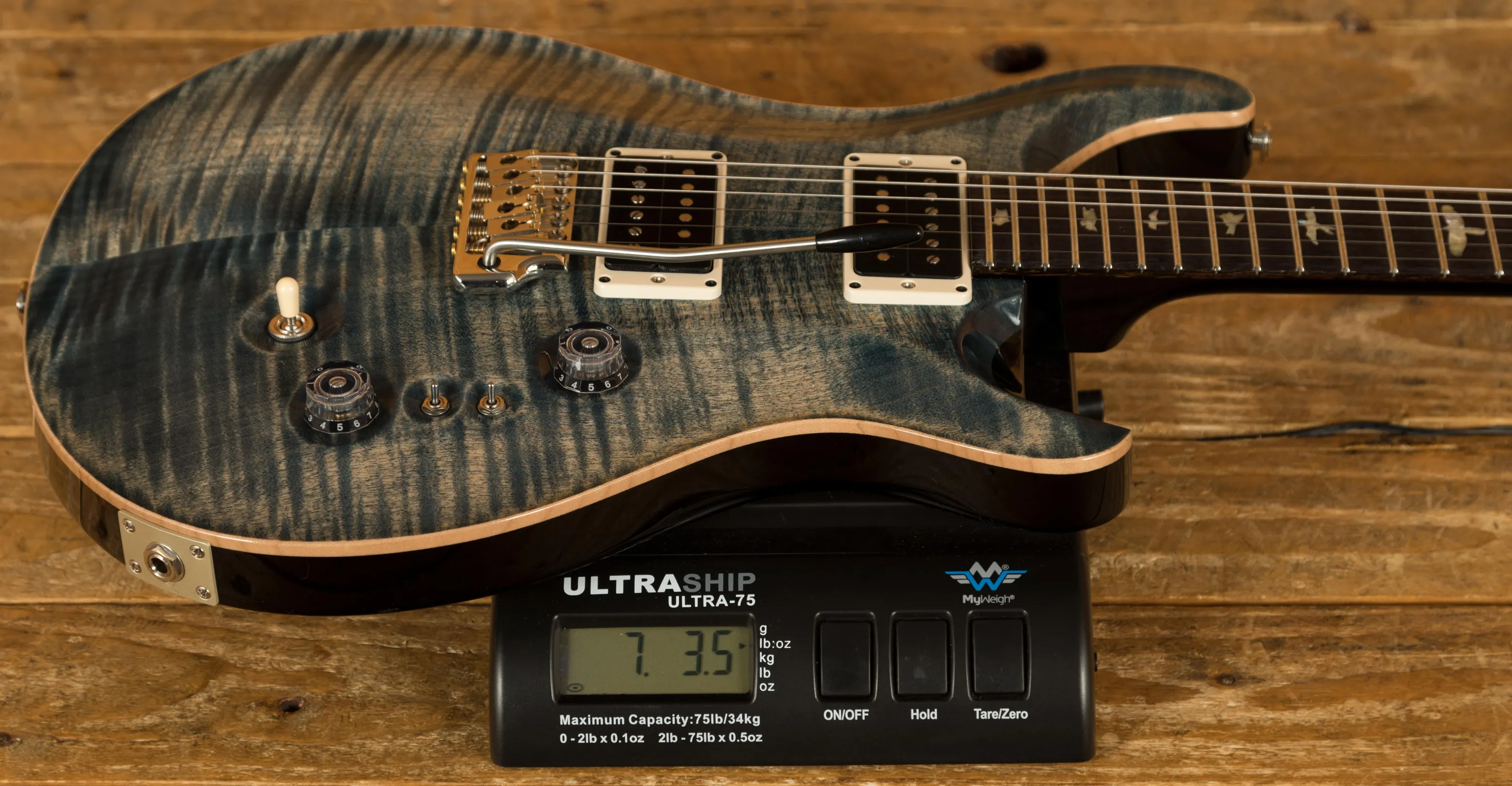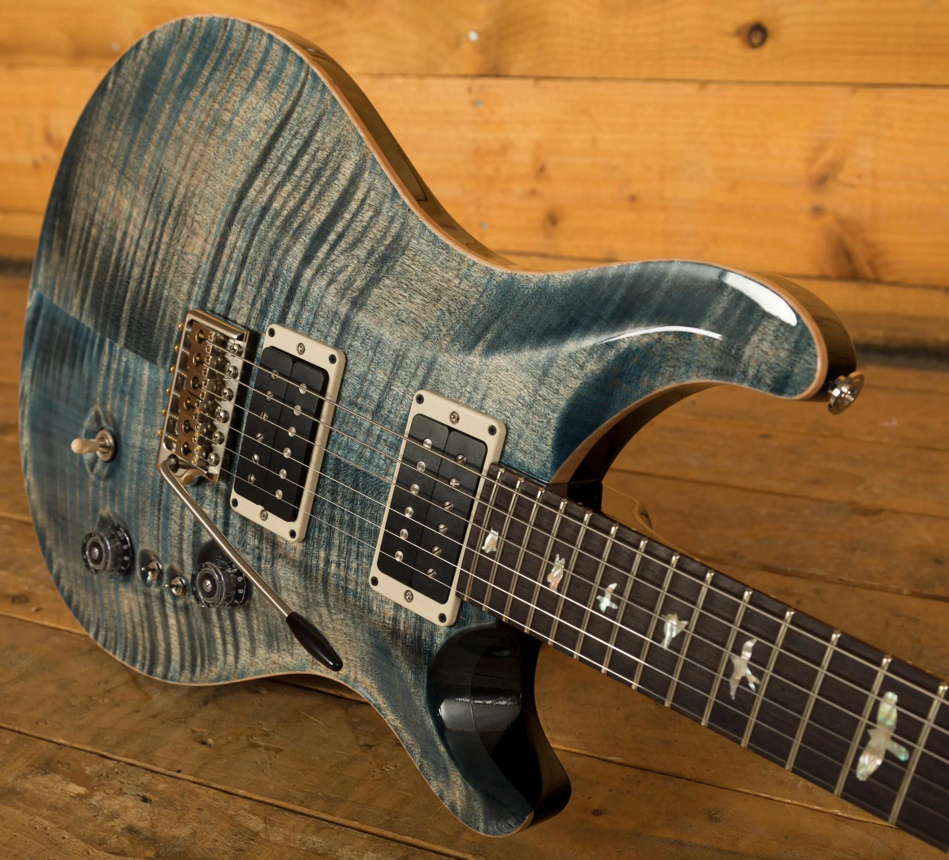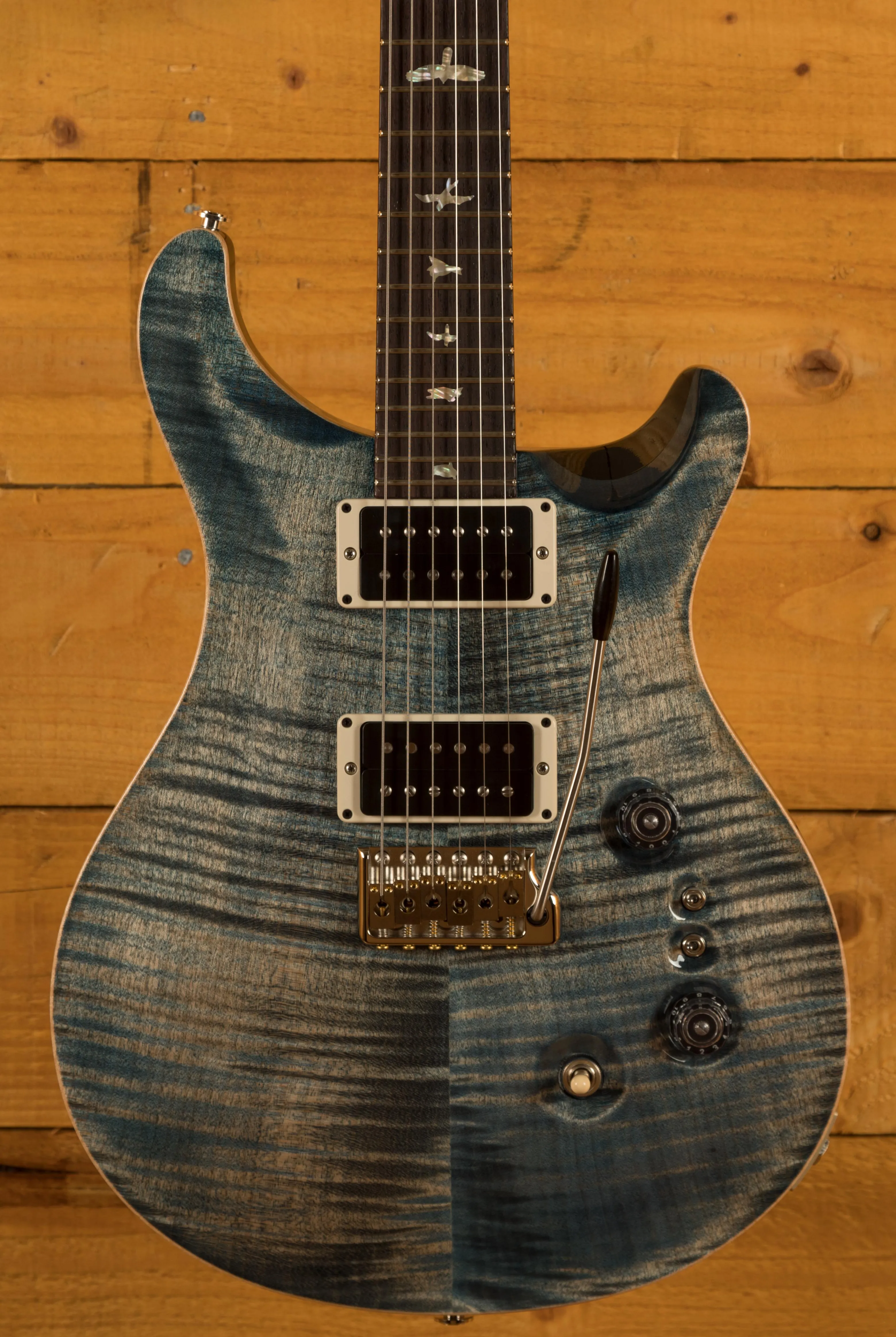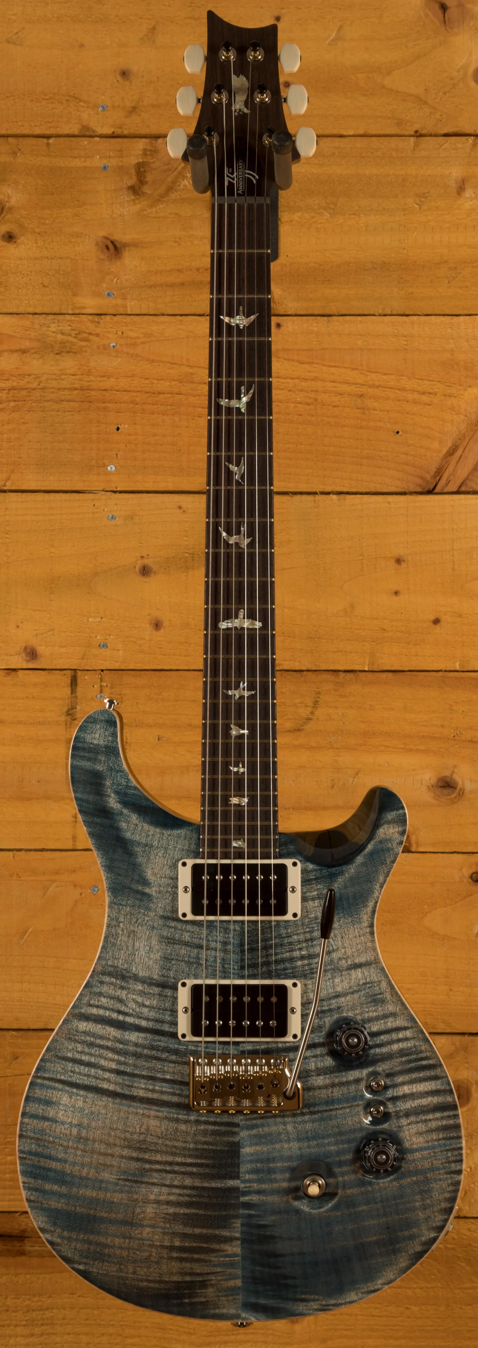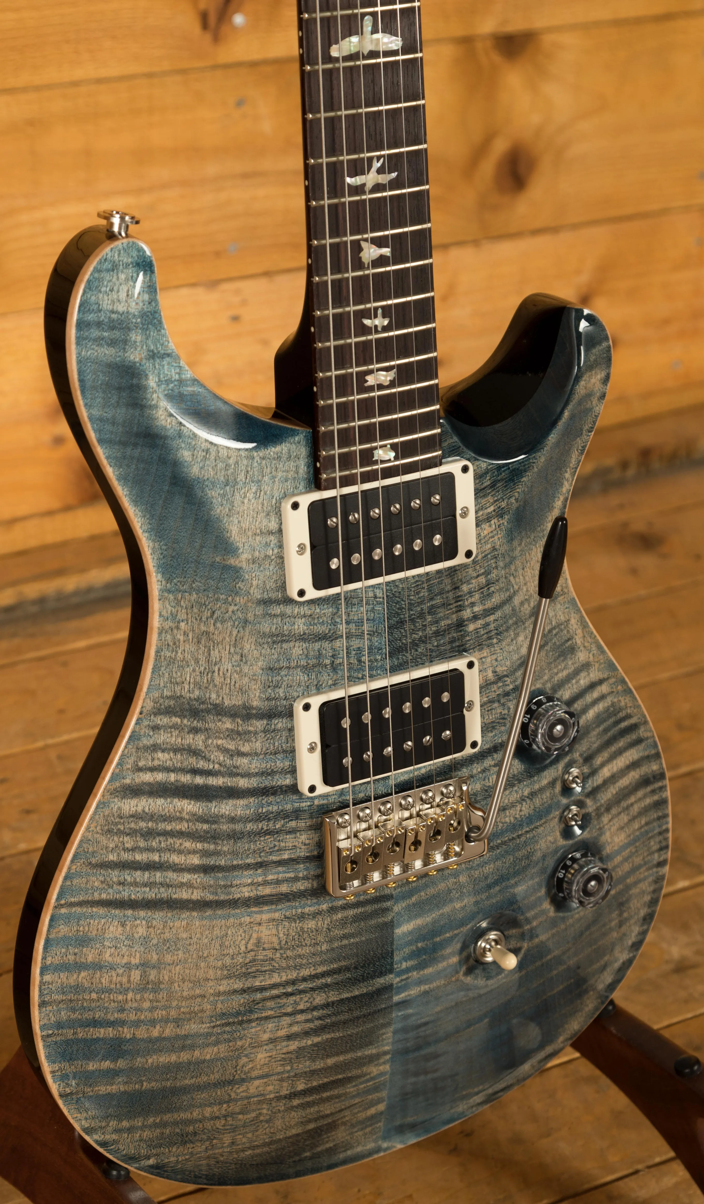 The Mahogany body with carved figured Maple top offers a rich warmth and depth that complements the beautiful Faded Whale Blue finish. With a 25" scale length, Pattern Thin profile and of course, 24 frets, the Mahogany neck feels really comfortable and familiar. The iconic PRS birds sit proudly atop the Rosewood fingerboard for the definitive PRS experience.