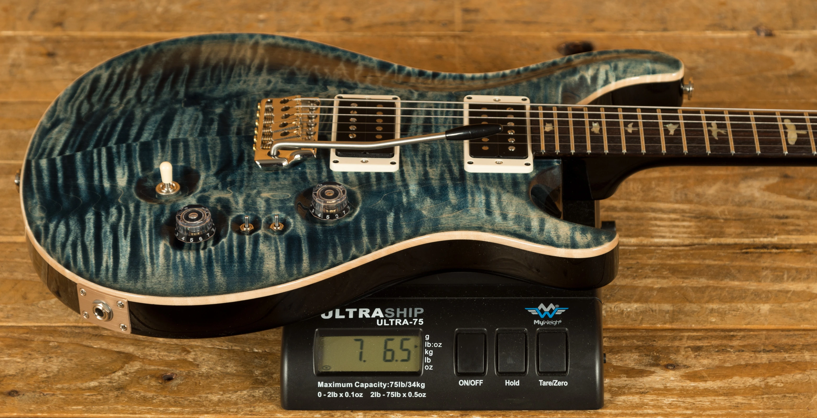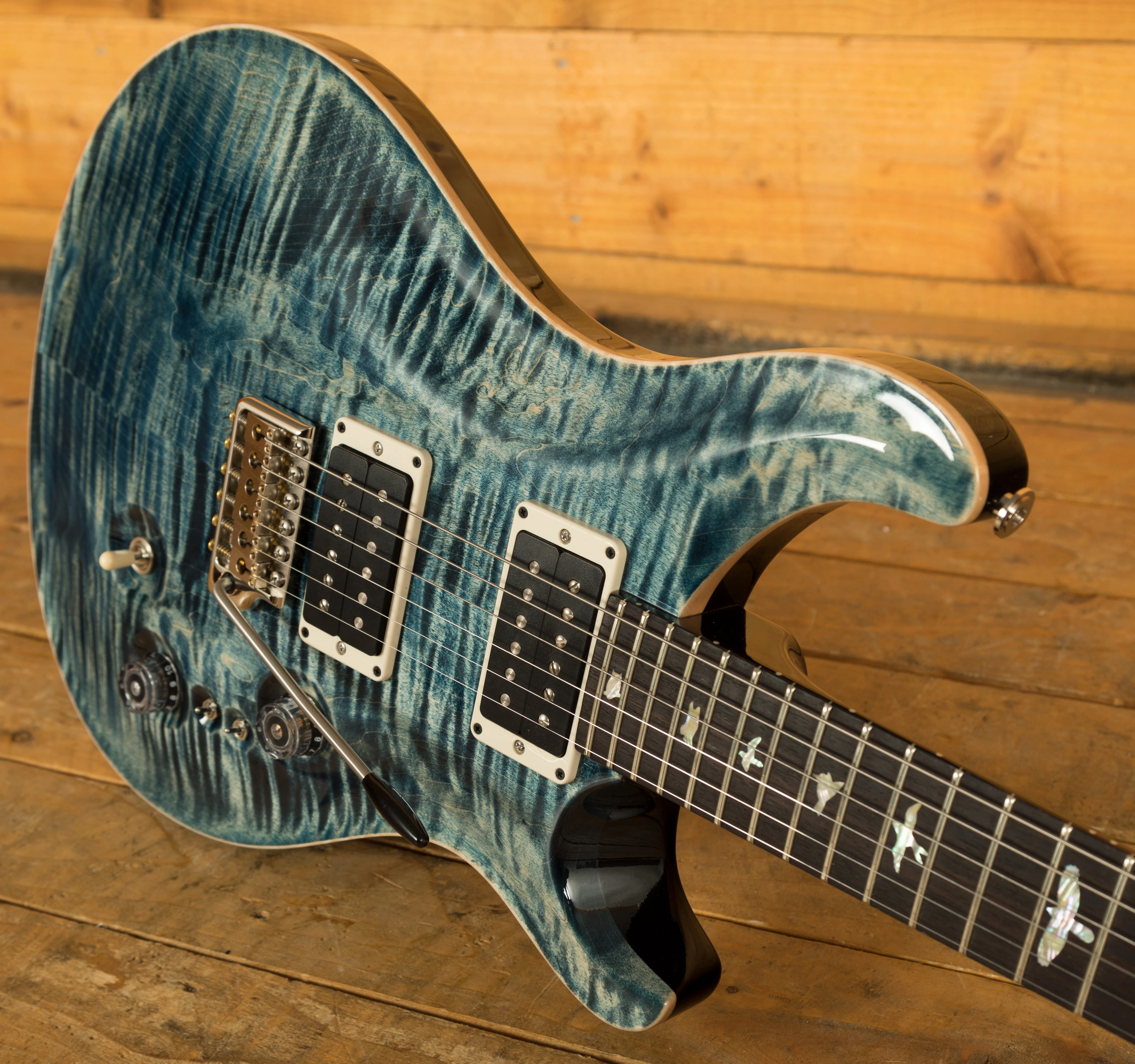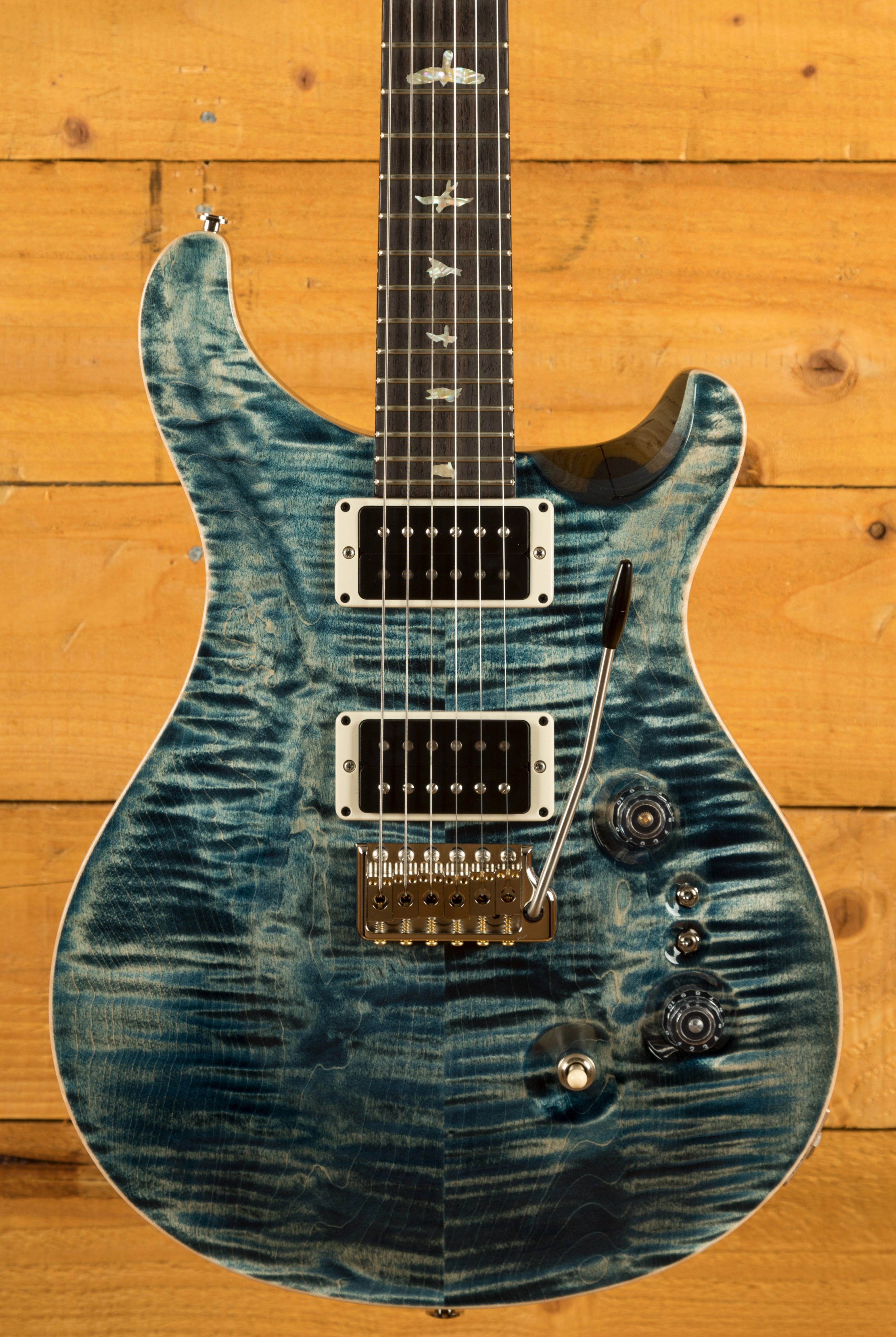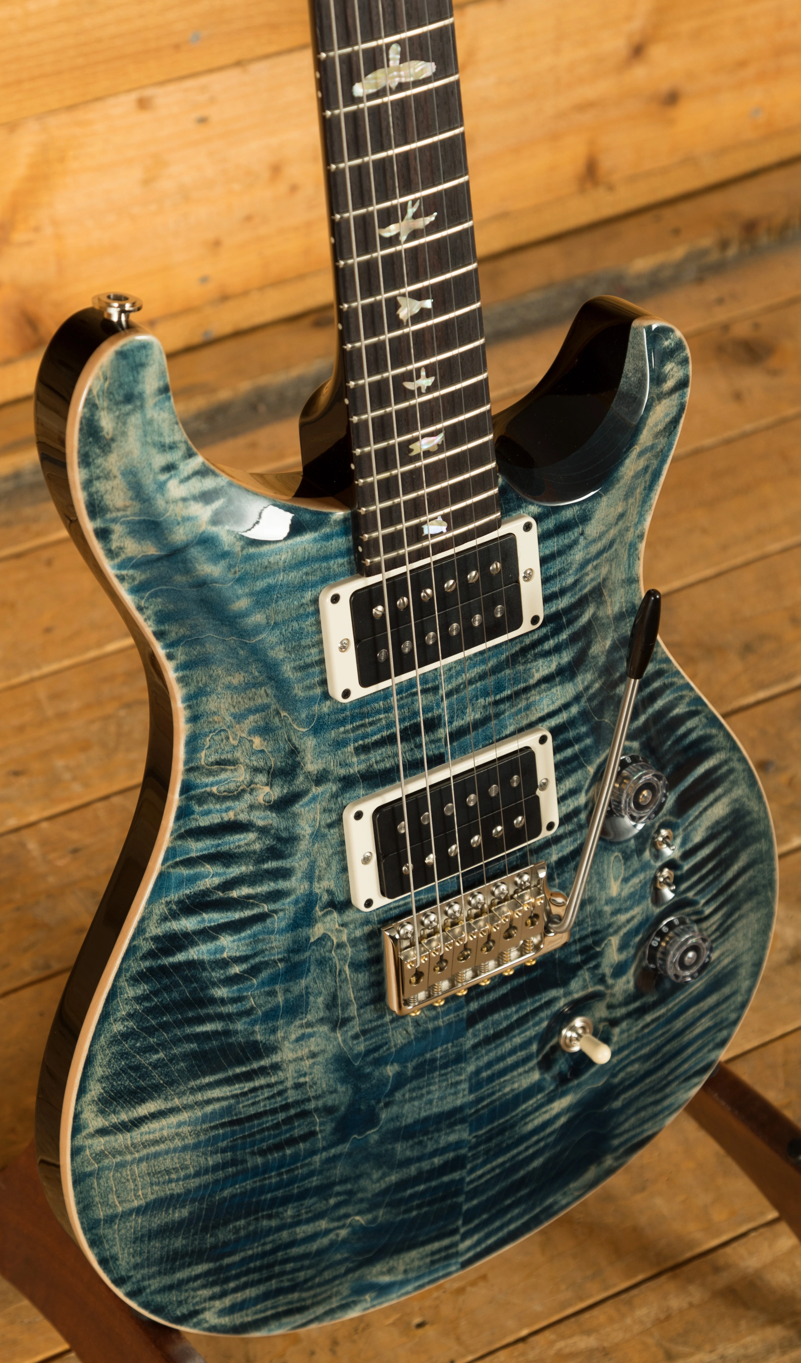 The Mahogany body with carved figured Maple top offers a rich warmth and depth that complements the beautiful Faded Whale Blue finish. With a 25" scale length, Pattern Thin profile and of course, 24 frets, the Mahogany neck feels really comfortable and familiar. The iconic PRS birds sit proudly atop the Rosewood fingerboard for the definitive PRS experience.