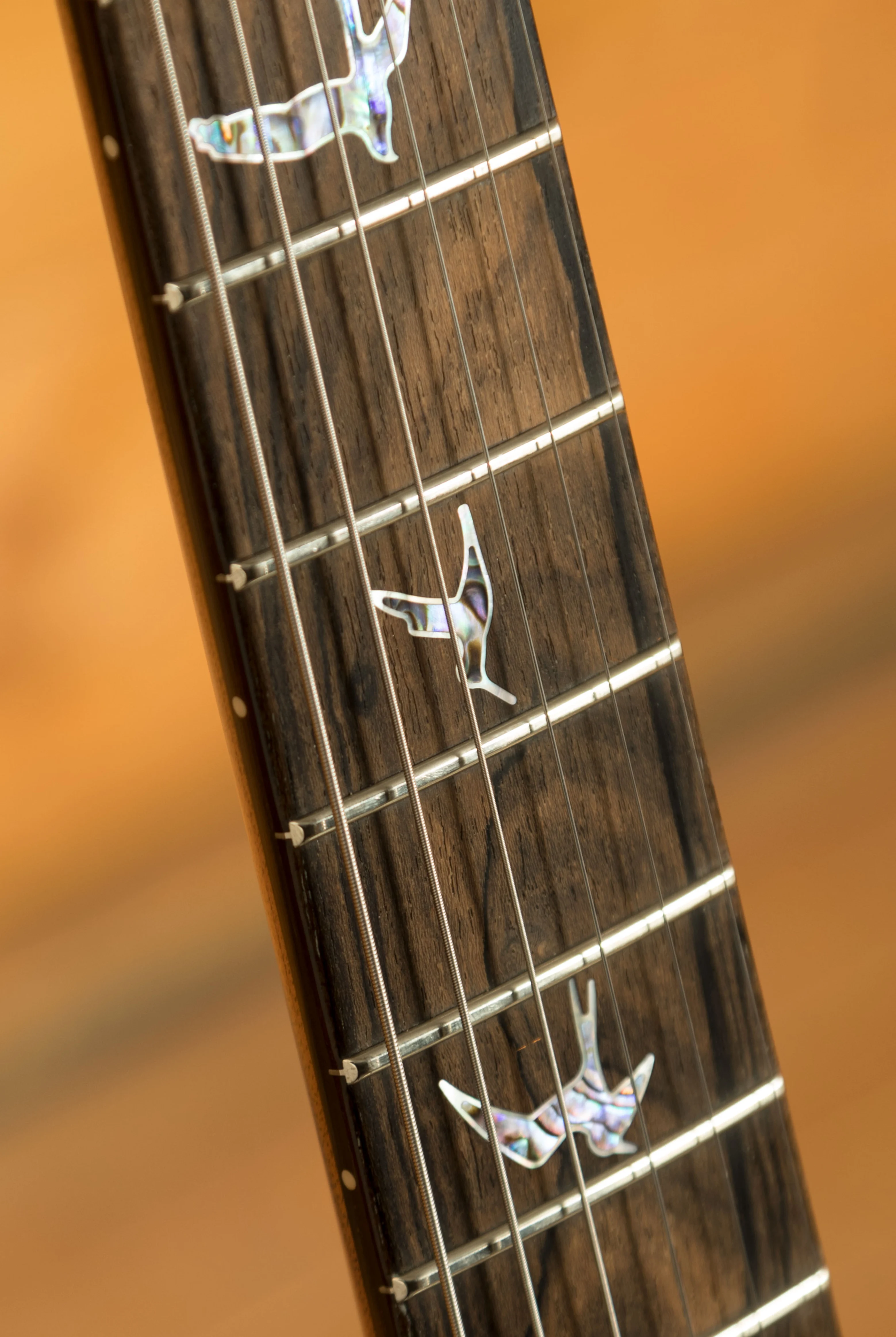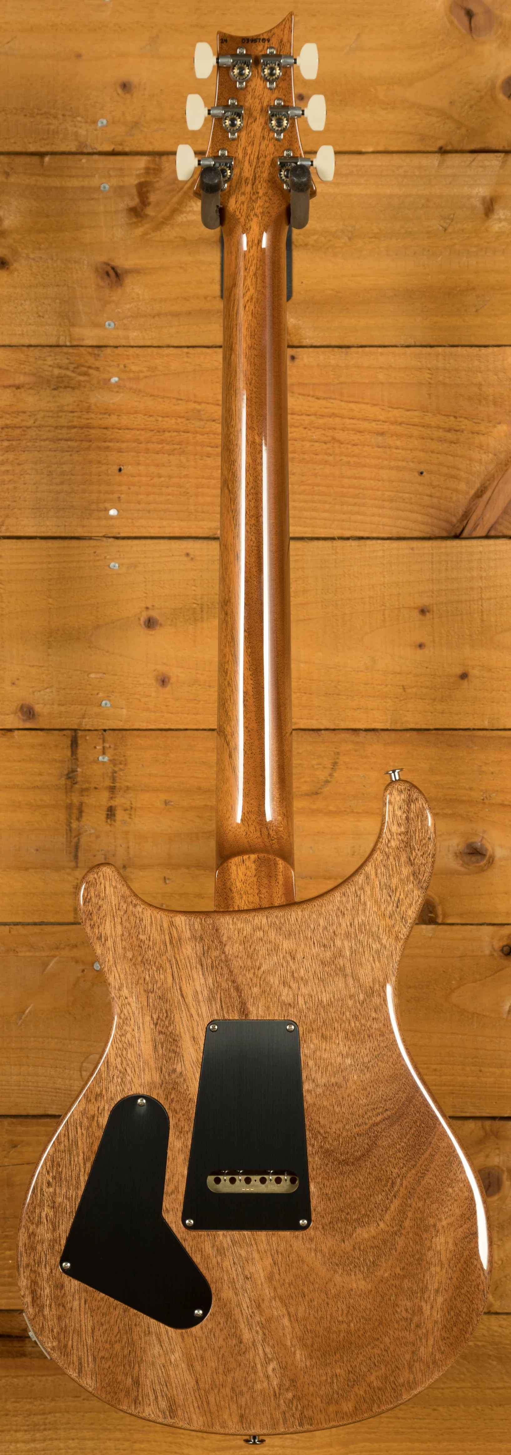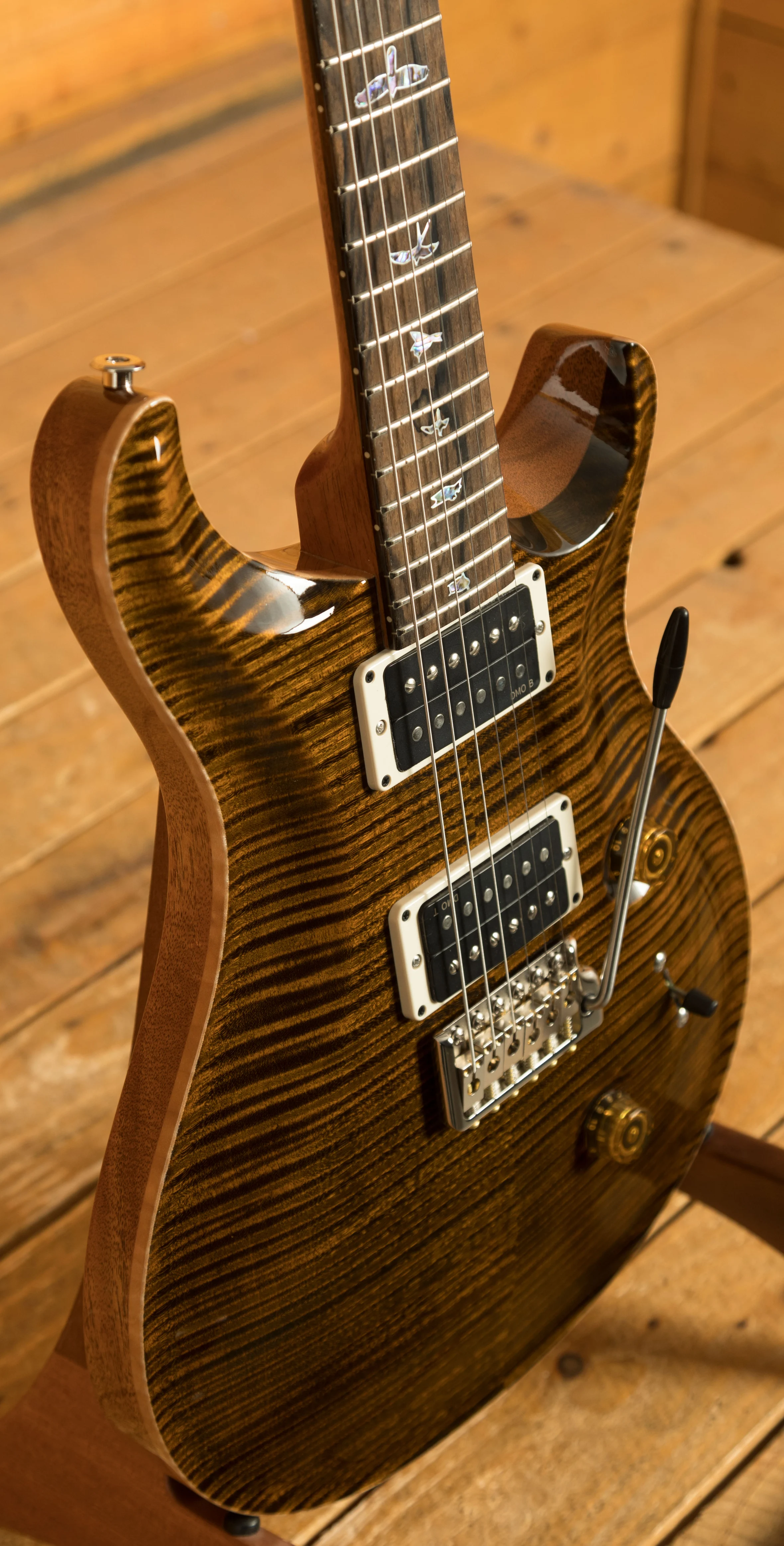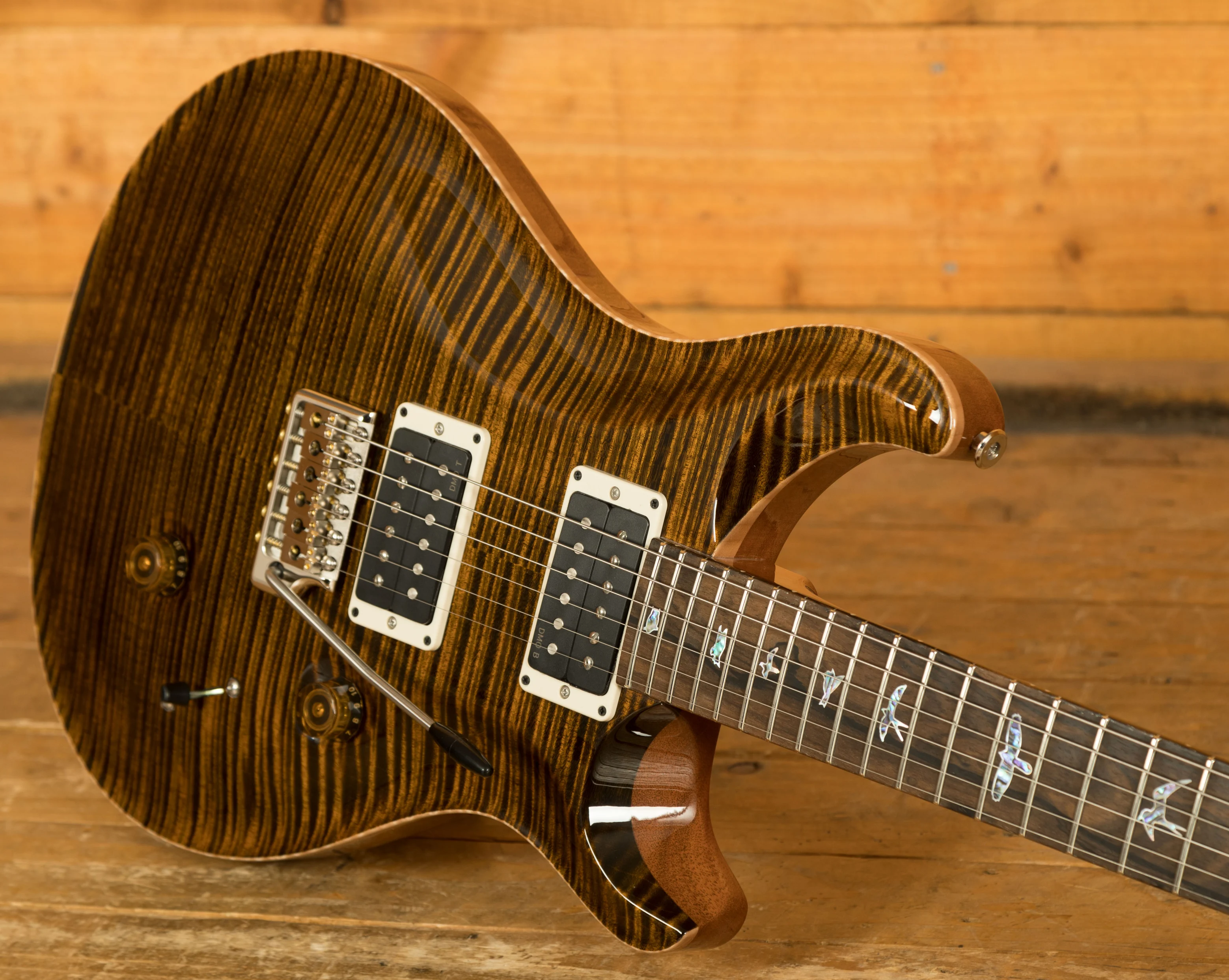 At its core, this Custom 24 model maintains PRS's trusted construction with a mahogany back and neck, paired with an artist-grade figured maple top. A nod to PRS's roots, the top has a "retro violin" carve, while the fretboard and headstock feature premium ziricote wood, delivering a distinctive tonal and visual character. The fretboard inlays are styled as "Old School" bird outlines, reminiscent of early PRS designs, and the headstock boasts a "Pre-Factory" eagle logo that celebrates the brand's heritage.
