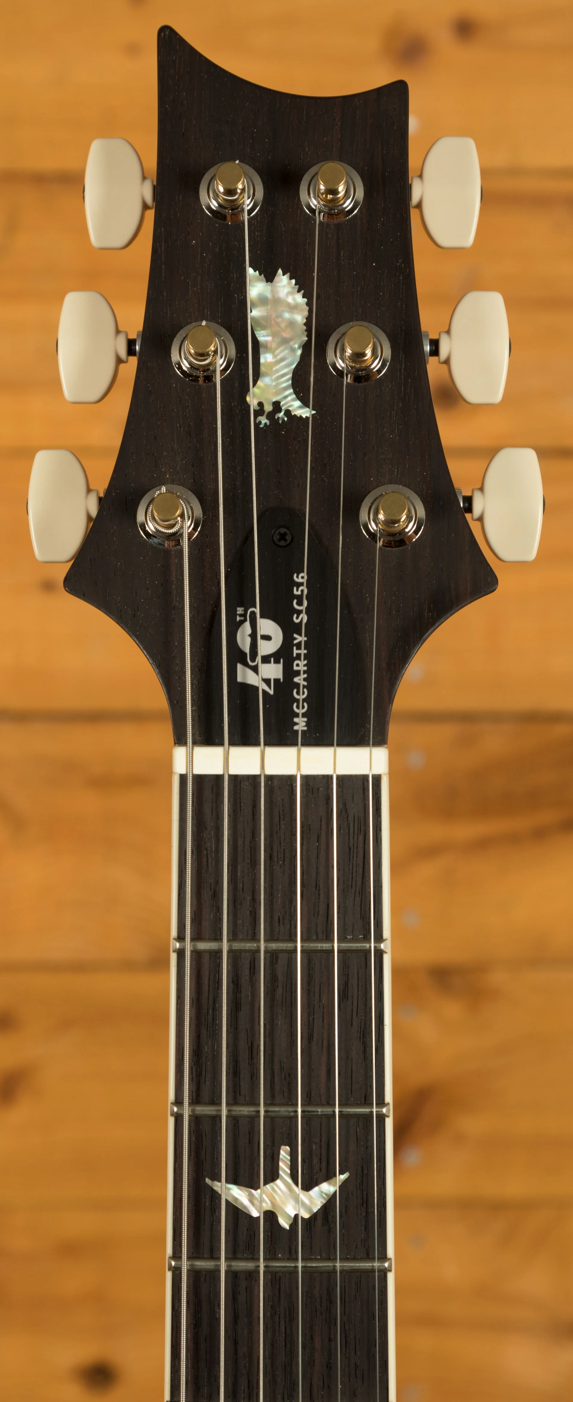 Discover the timeless elegance of this PRS 40th Anniversary McCarty SC56 Limited Edition, crafted in 2025 at PRSs Stevensville, Maryland facility to mark four decades of the companys legacy. A tribute to tradition and a modern performers dream, this limited run of just 400 pieces features a classic single-cutaway body with a carved maple top over a slightly thicker mahogany back, enhanced by a weight-relief design that trims approximately two-thirds of a pound for improved comfort without sacrificing tone. Finished in a vintage-inspired nitrocellulose lacquer, the McCarty SC56 exudes heritage with its bound fretboard, classic bird inlays, and a 24.594 scale length Pattern Vintage neck, offering a warm, woody voice and effortless playability. The 22-fret rosewood fingerboard and Phase III non-locking tuners with brass shafts add to its resonant sustain and vintage feel.