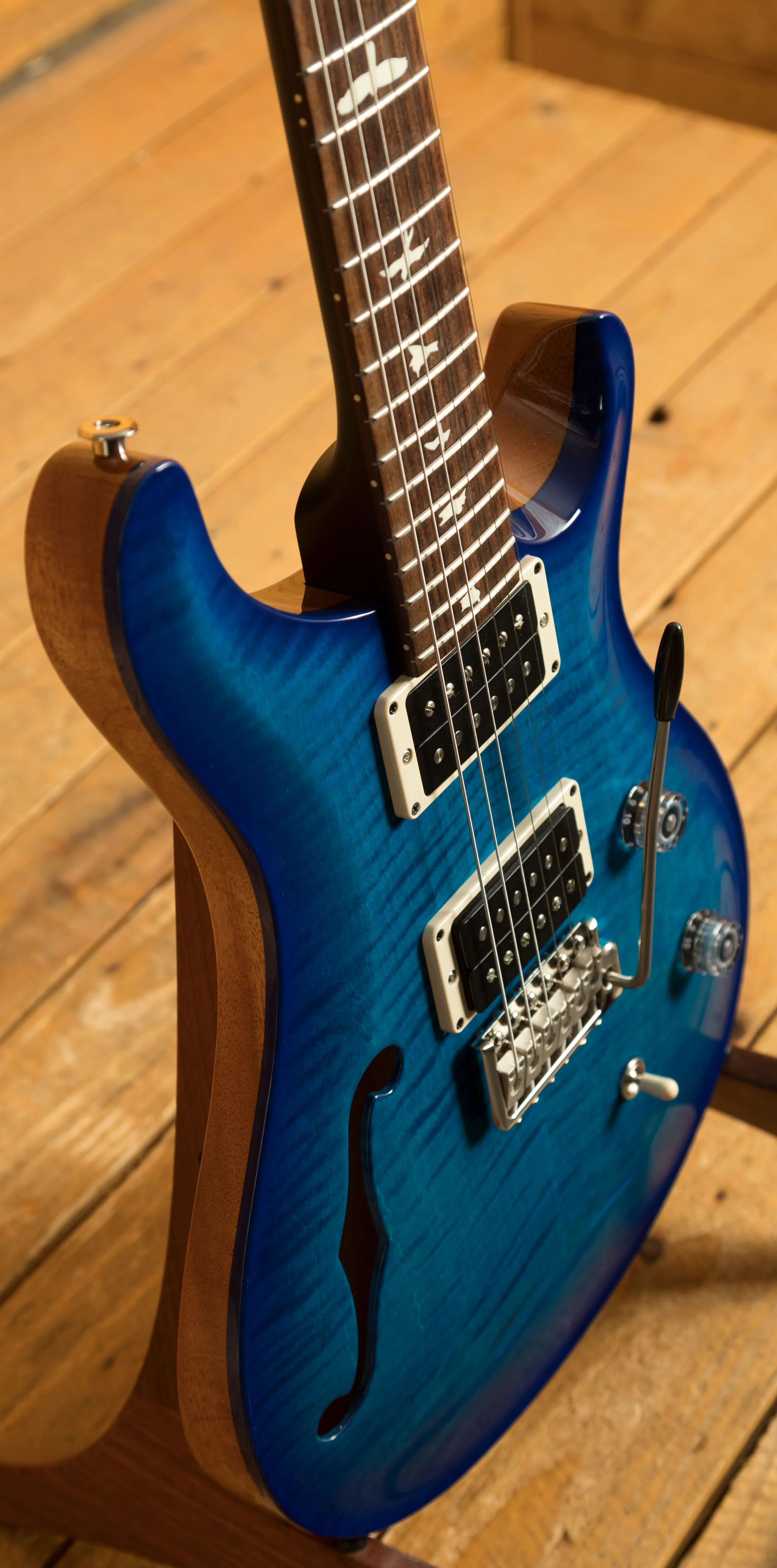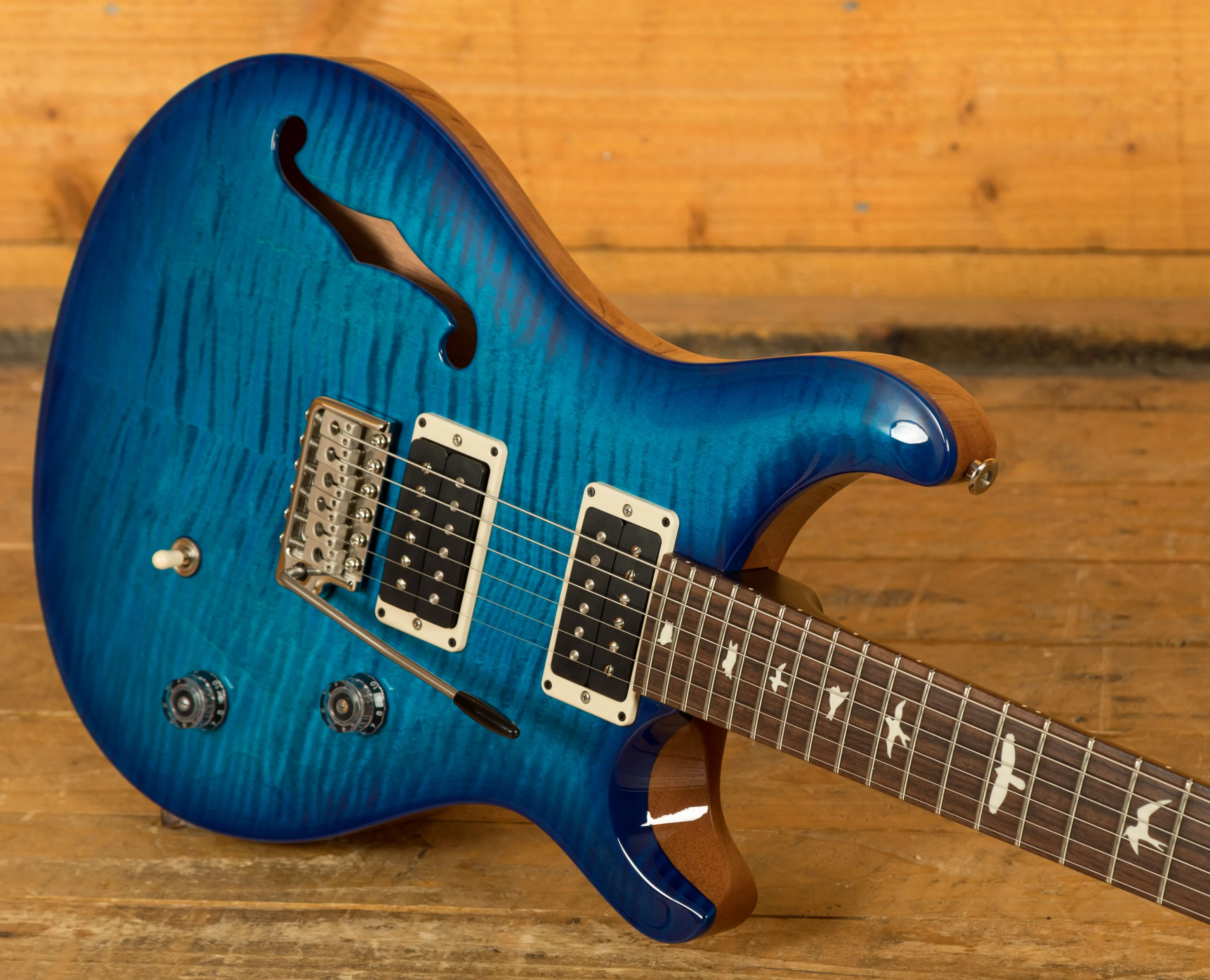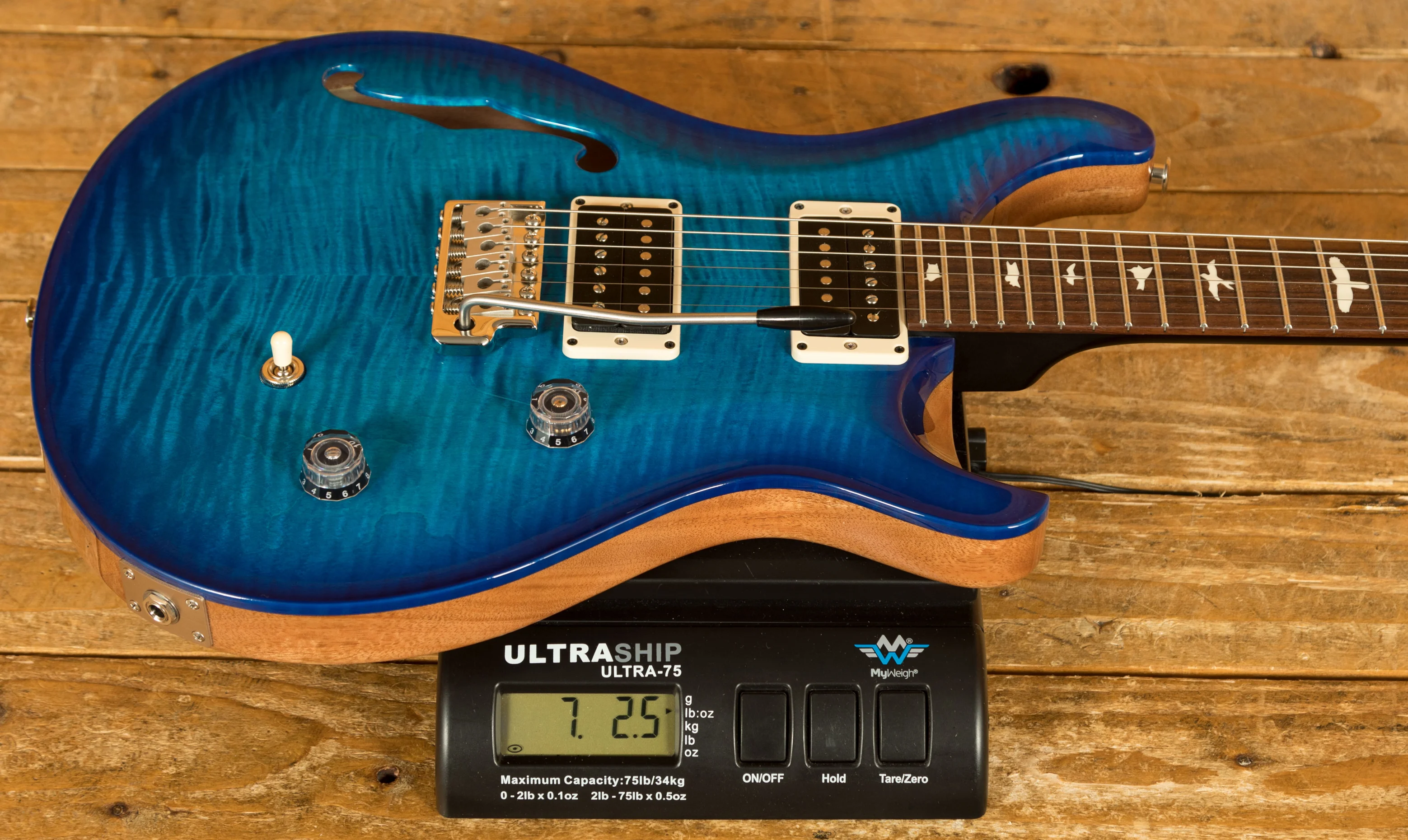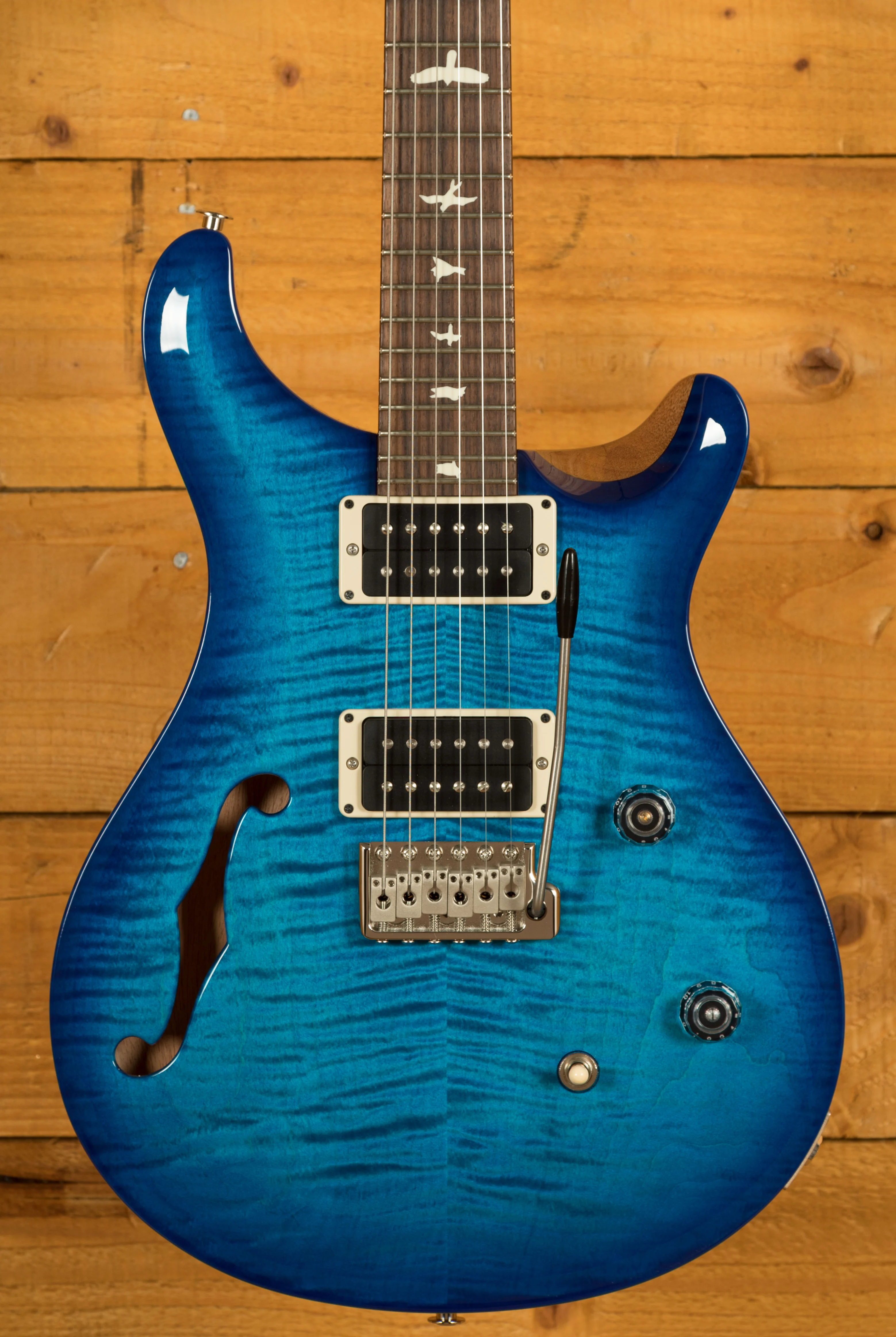 The Semi-Hollow Mahogany body, with a carved Maple top, offers a rich warmth and depth that complements the snappy response of the bolt on Maple neck. With a Pattern Thin profile, 25" scale length and of course, 24 frets, the Maple neck feels really comfortable and familiar. The iconic PRS birds sit proudly atop the Rosewood fingerboard for the definitive PRS experience. This particular model features an awesome Blackout neck, creating a really unique aesthetic
