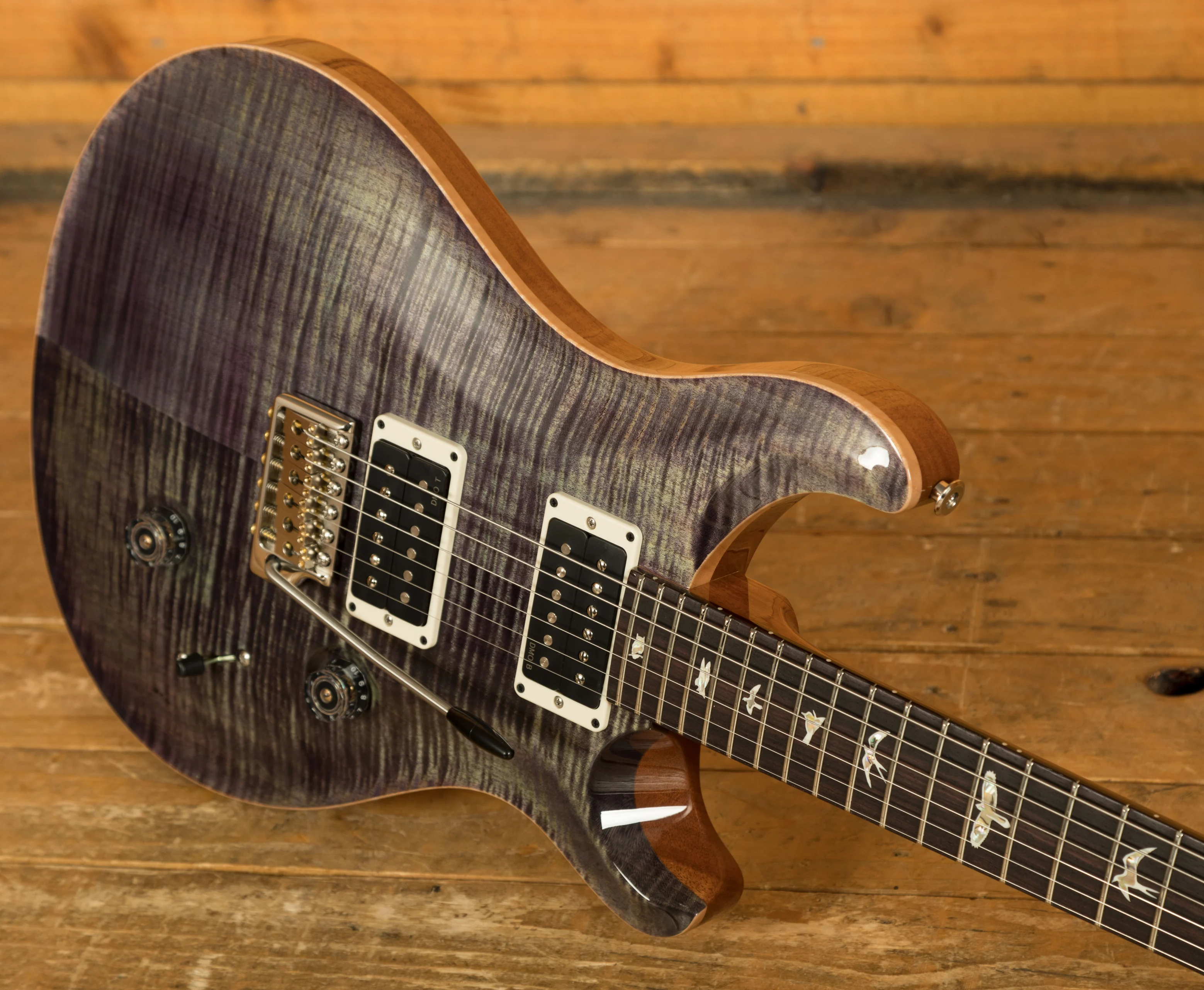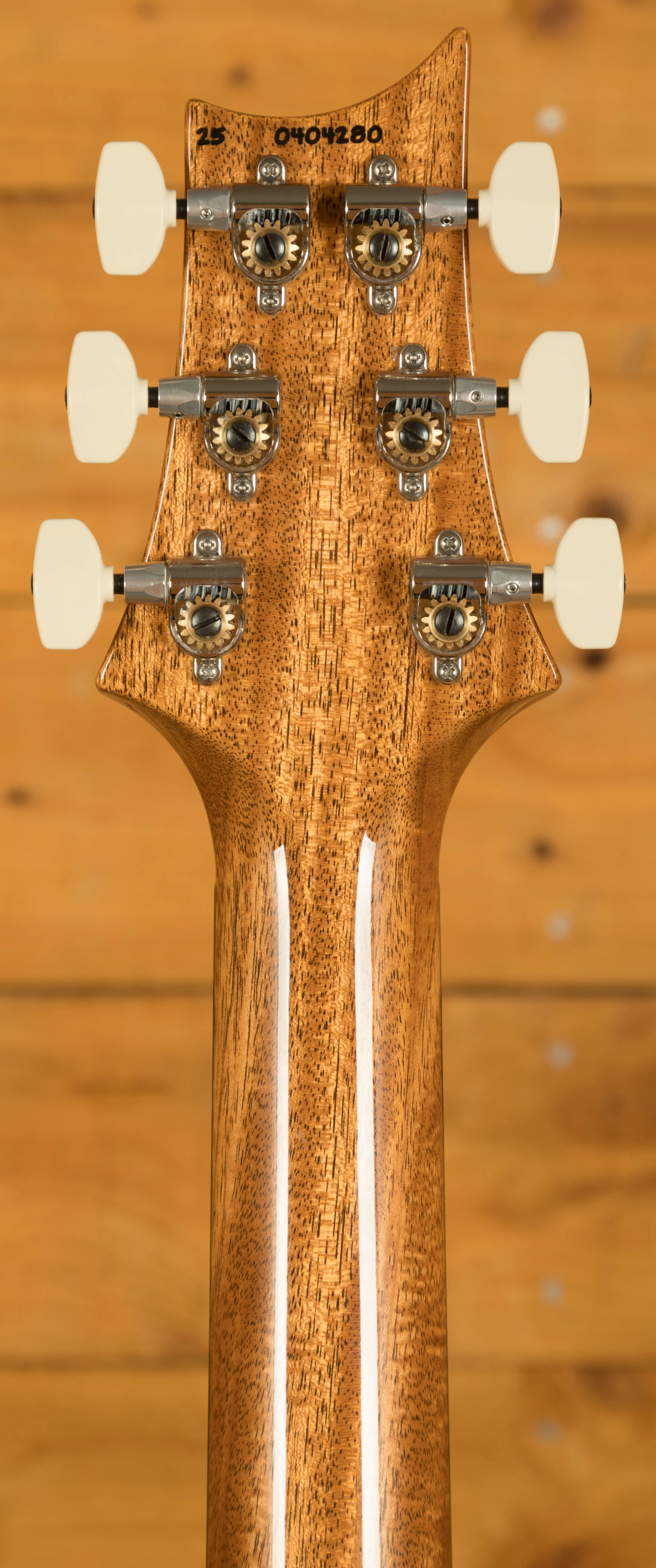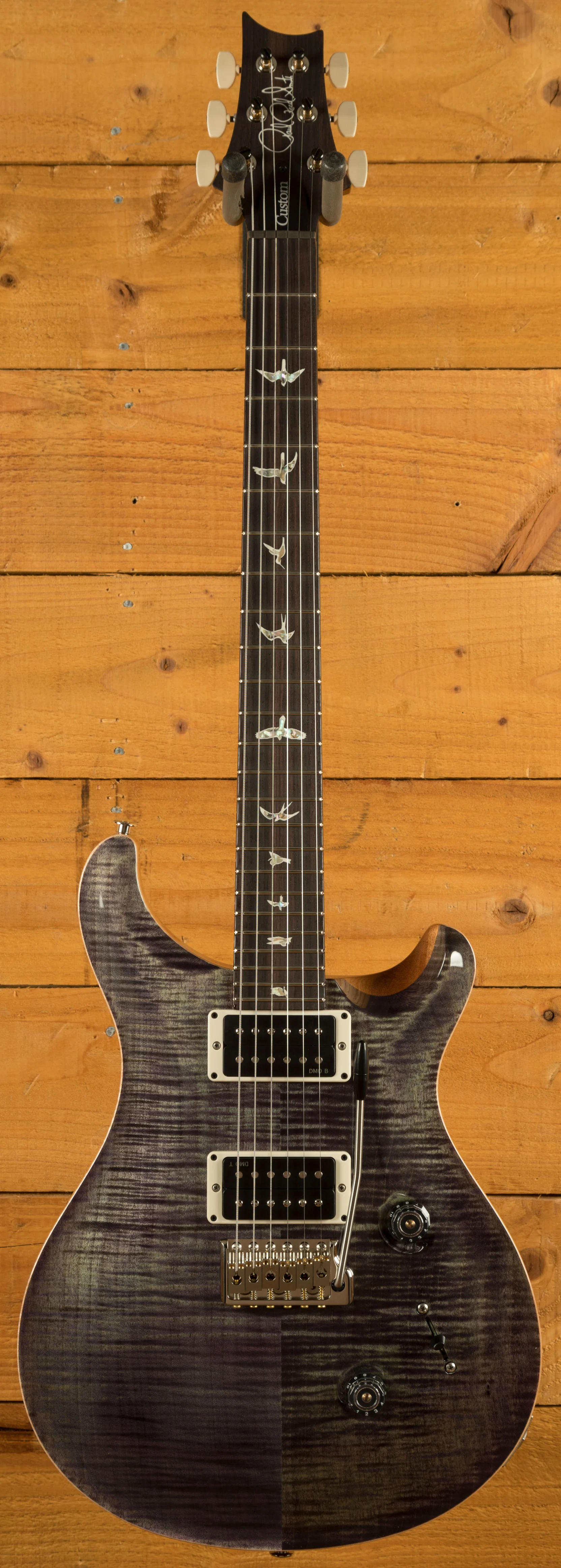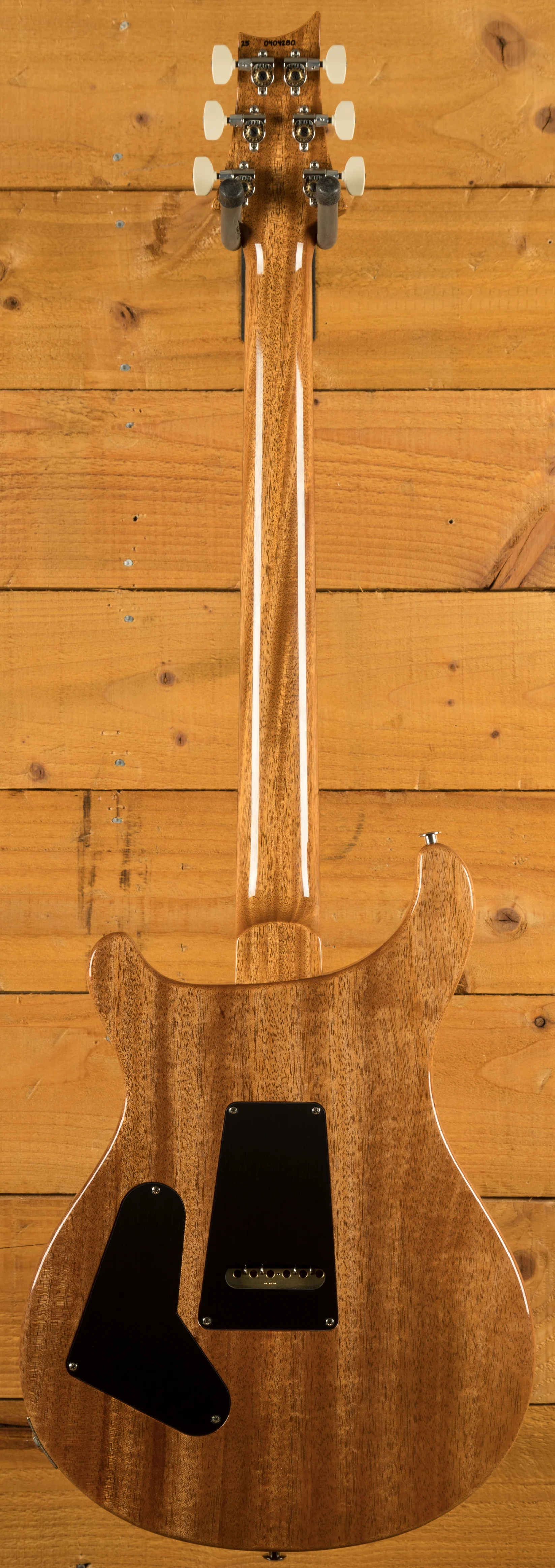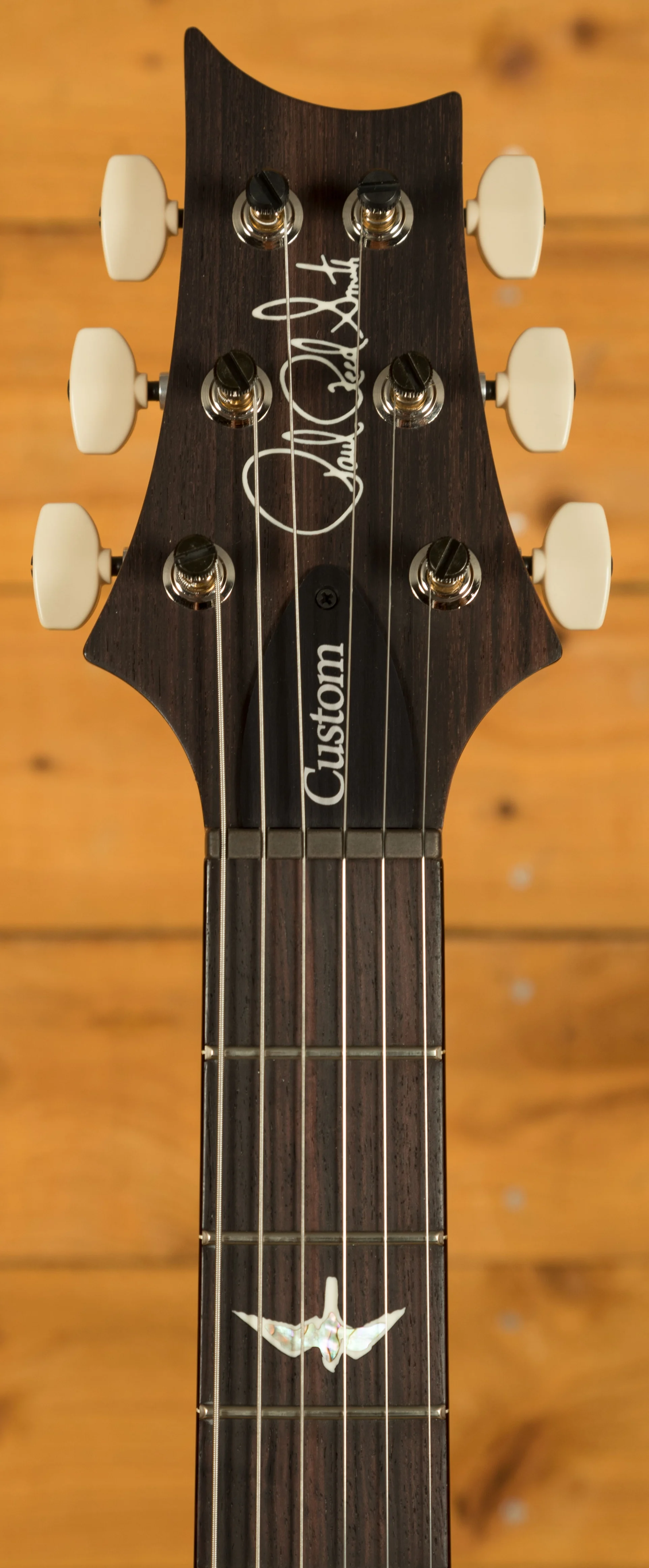 The 25" scale-length, 10" radius, 24-fret Rosewood fingerboard stoically rises up the set, one-piece, Mahogany neck as it makes a home for the iconic PRS Bird inlays that hold such a status. Reaching the headstock, one can fine the beautiful grain of the top piece that houses the inlay of the PRS founder's name. The PRS Phase III Locking Tuners prominently line up on either side - ever diligent in their duty to keep sturdy and accurate tuning.