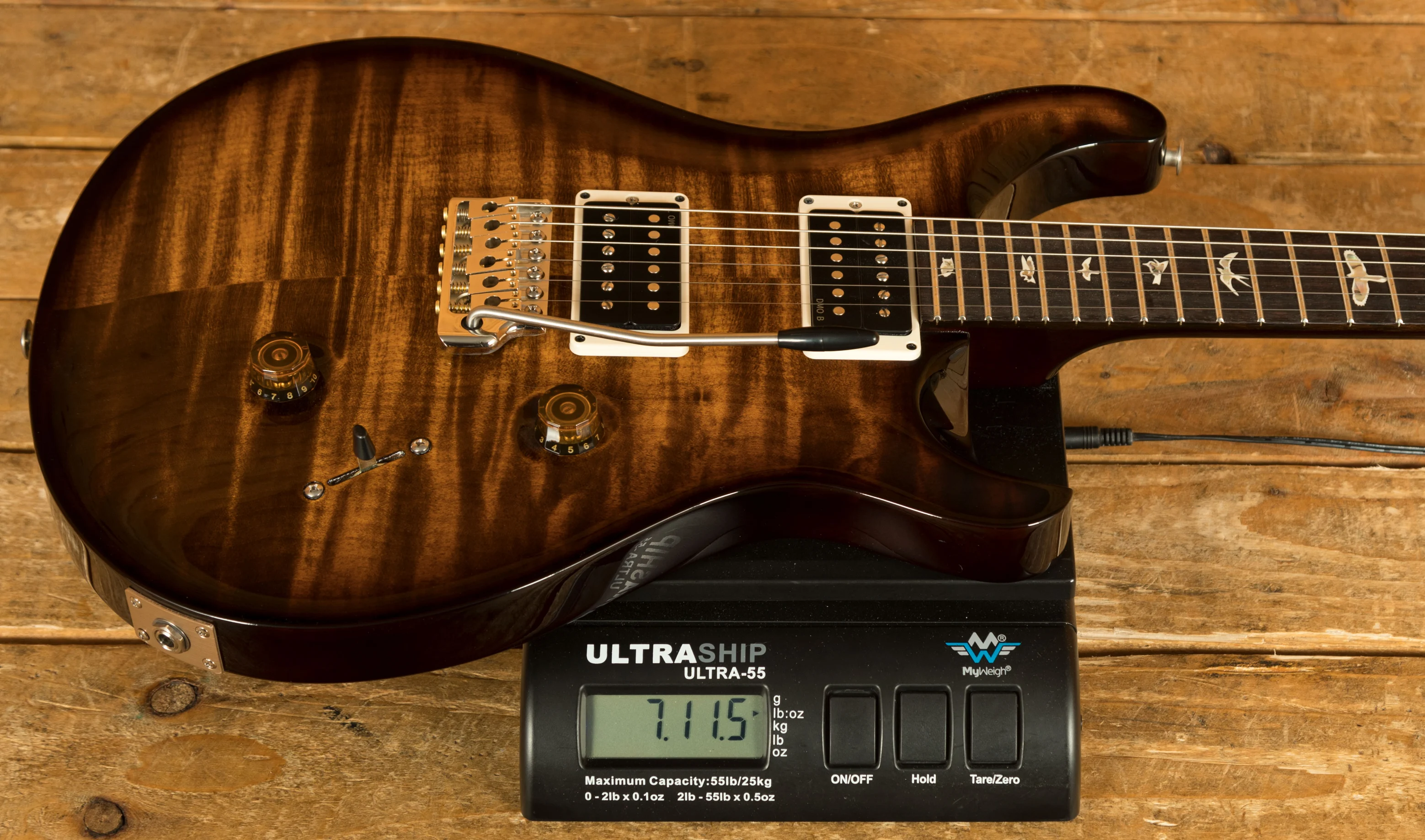 Body & Neck: Carved figured maple top, finished in Black Goldburst with a mahogany back, paired with a mahogany neck featuring a Pattern Thin profile and rosewood fingerboard with bird inlays, offering a 25" scale length and 24 frets.
