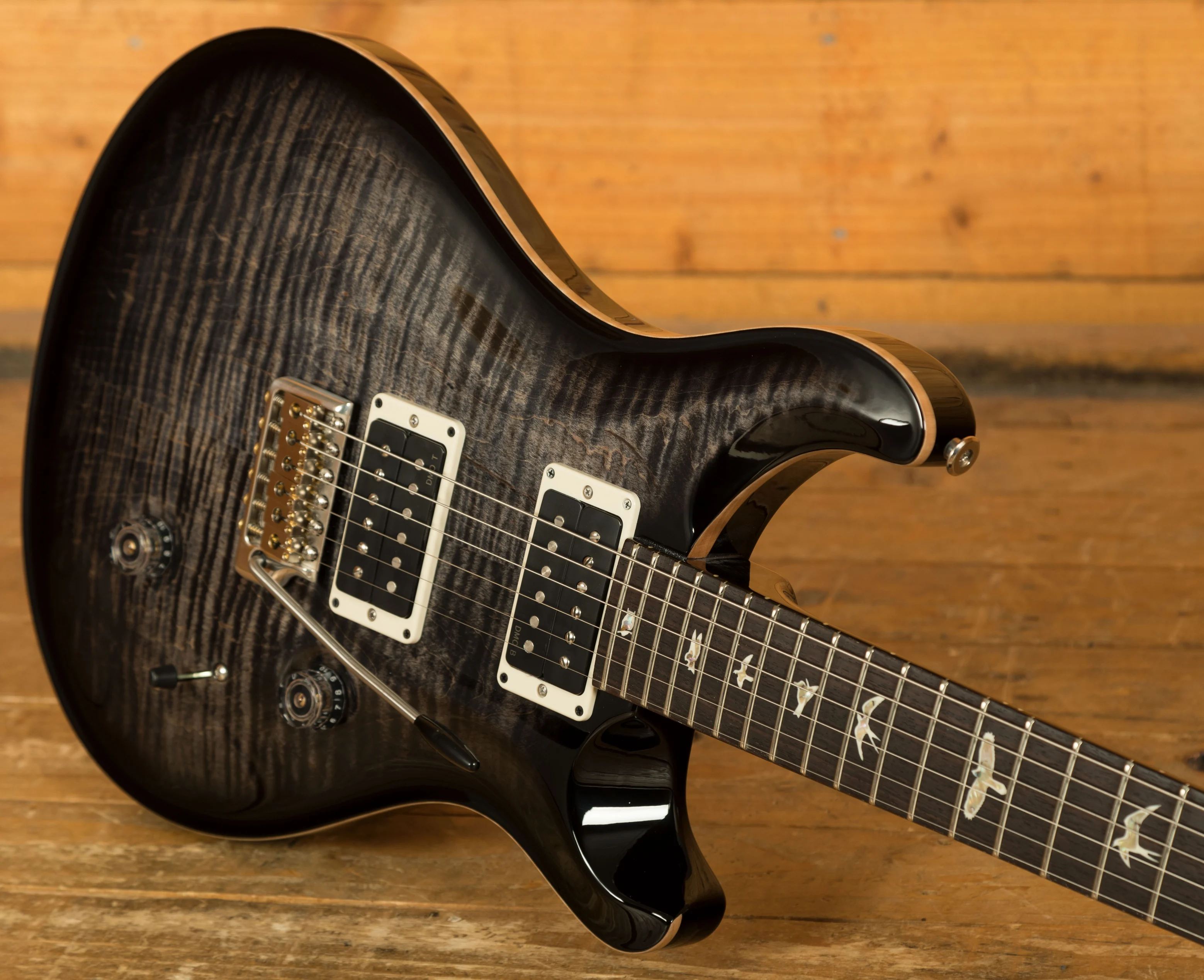 Body & Neck: Carved figured maple top, finished in Charcoal Burst with a mahogany back, paired with a mahogany neck featuring a Pattern Thin profile and rosewood fingerboard with bird inlays, offering a 25" scale length and 24 frets.