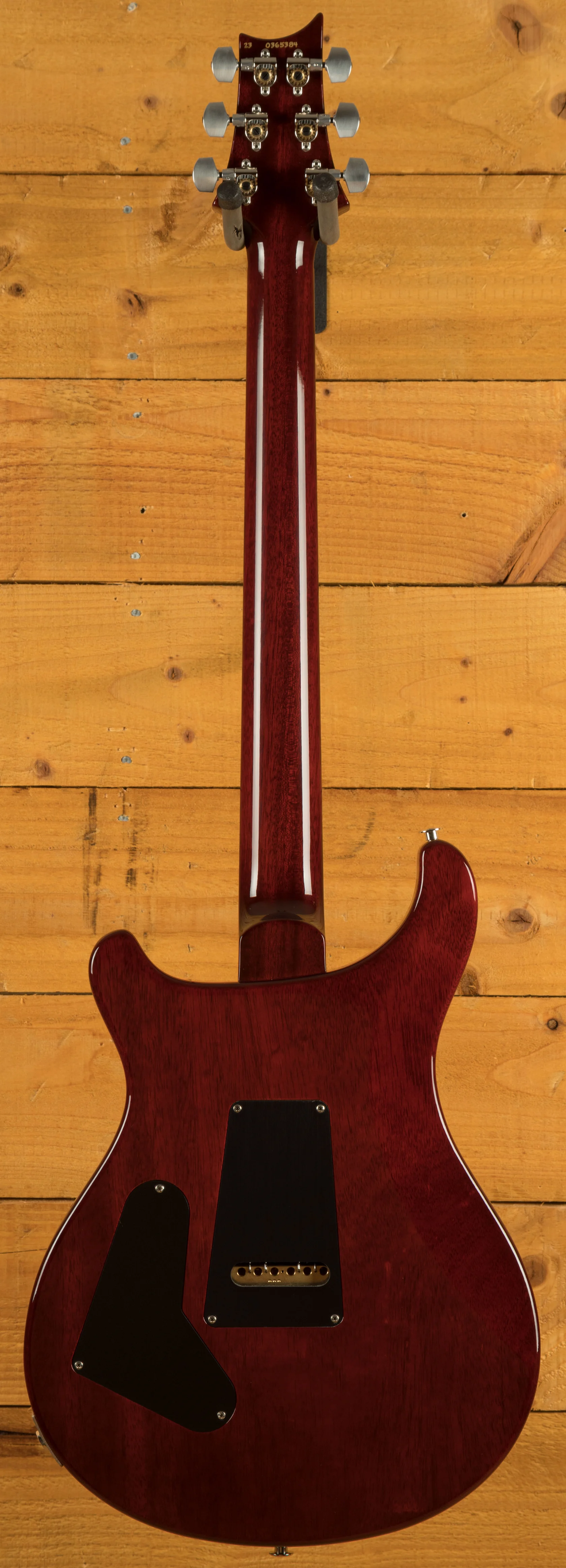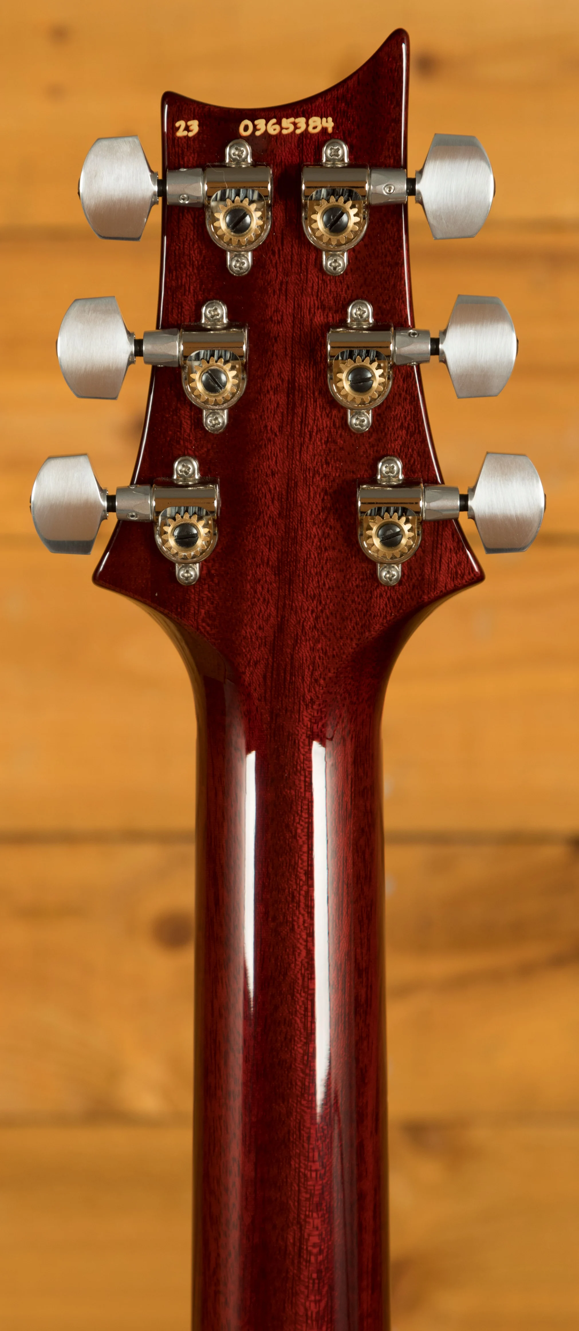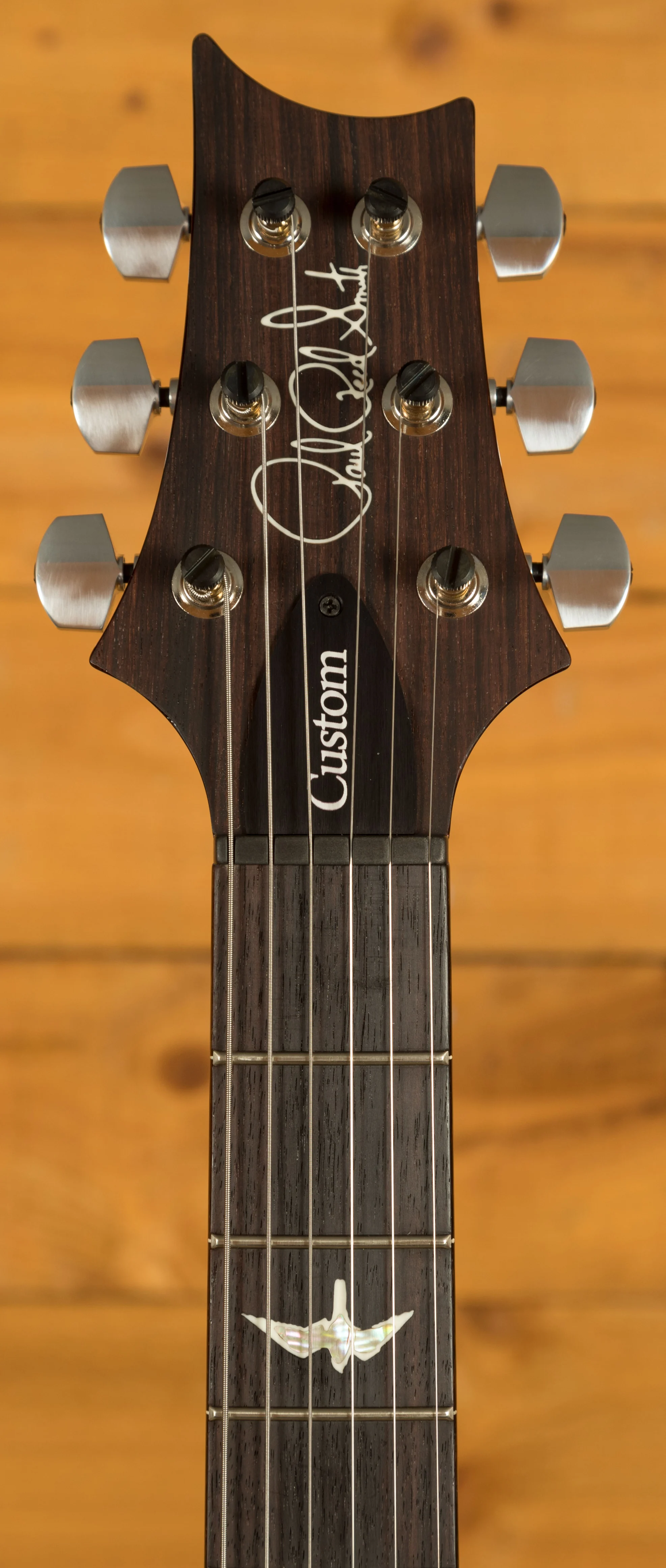 The 25" scale-length, 10" radius, 24-fret Rosewood fingerboard stoically rises up the set, one-piece, Mahogany neck as it makes a home for the iconic PRS Bird inlays that hold such a status. Reaching the headstock, one can fine the beautiful grain of the top piece that houses the inlay of the PRS founder's name. The PRS Phase III Locking Tuners prominently line up on either side - ever diligent in their duty to keep sturdy and accurate tuning.