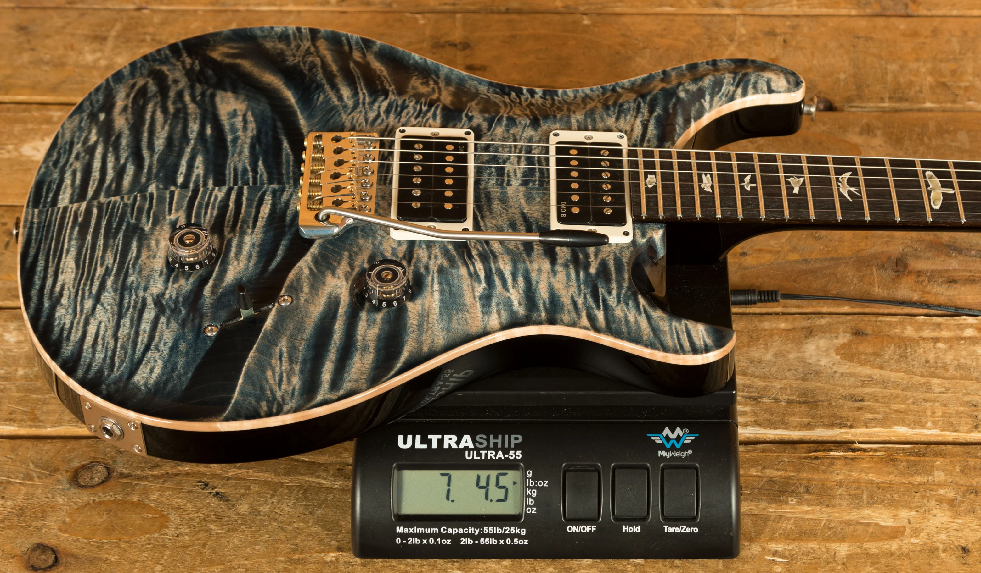 Body & Neck: Carved figured maple top, finished in Faded Whale Blue with a mahogany back, paired with a mahogany neck featuring a Pattern Thin profile and rosewood fingerboard with bird inlays, offering a 25" scale length and 24 frets.