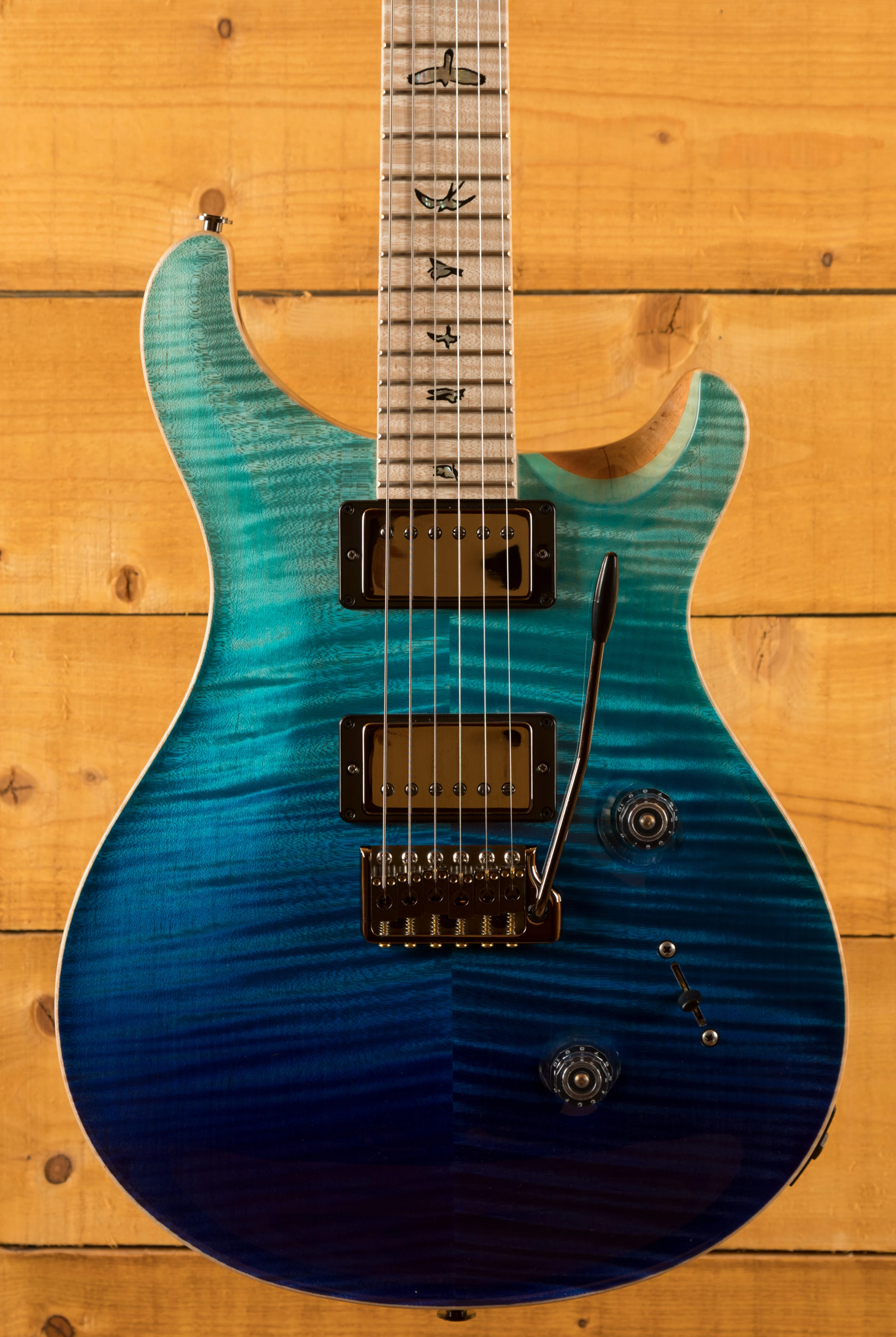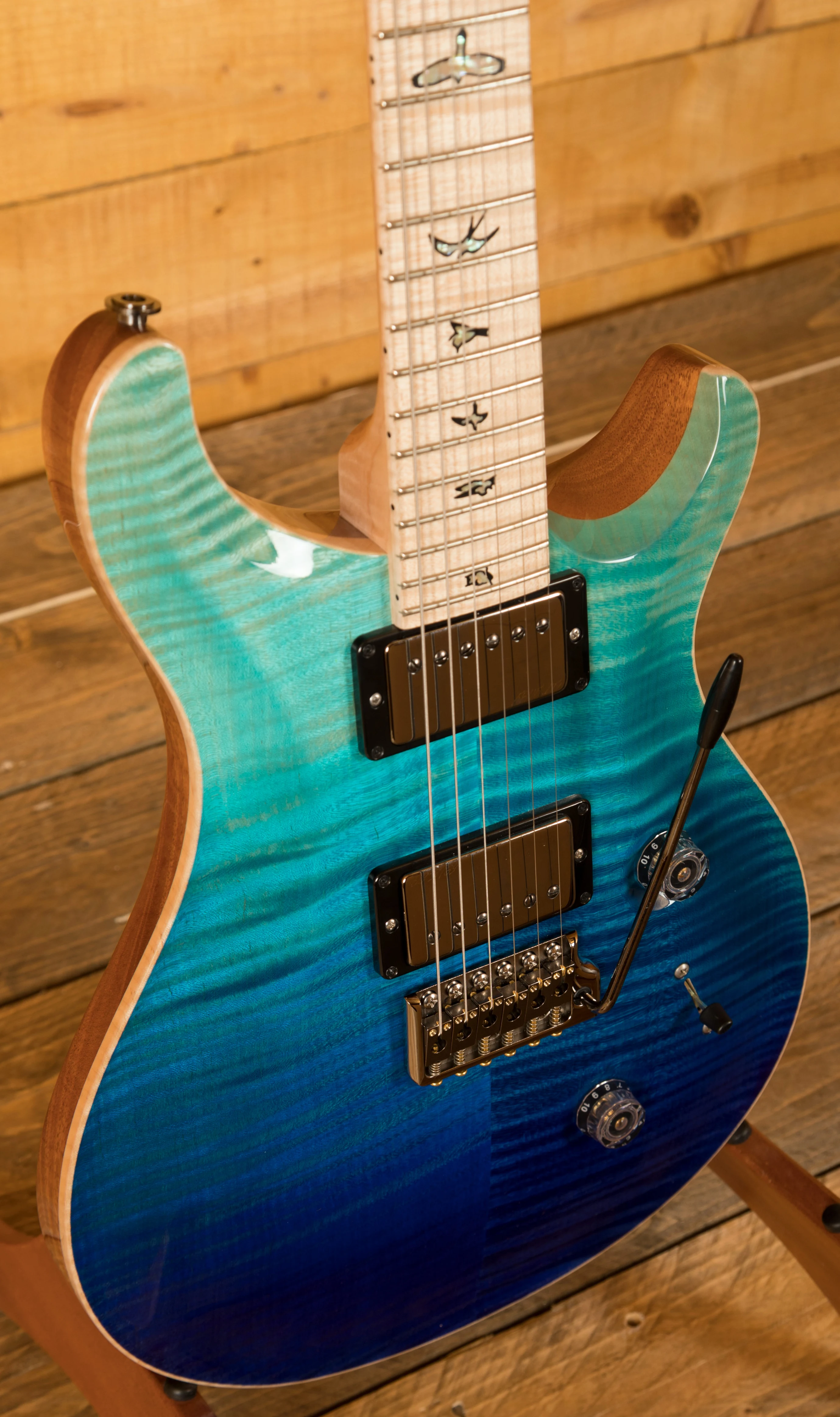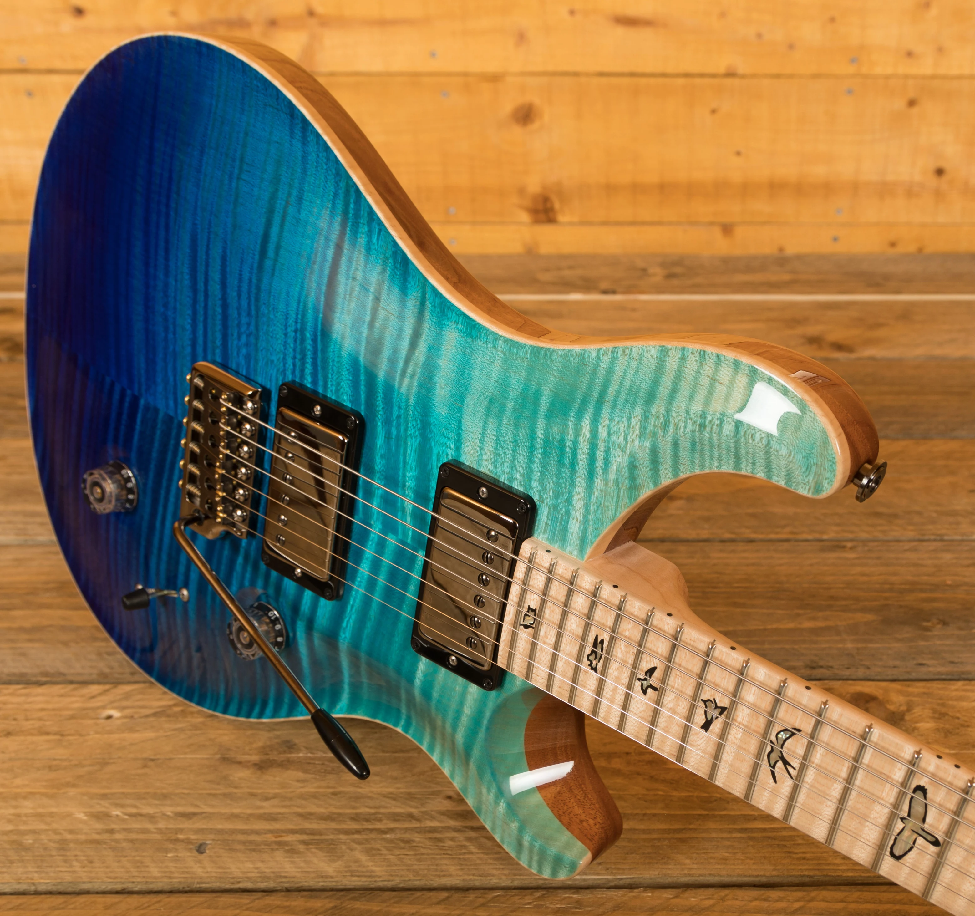 The neck on this guitar is truly incredible, a pattern thin satin Flame Maple neck with matching fingerboard bearing the classic bird inlays with Black Corian and Green ripple detail and offers a comfortable and stable performance. This combination and finish of neck is striking and breathtaking