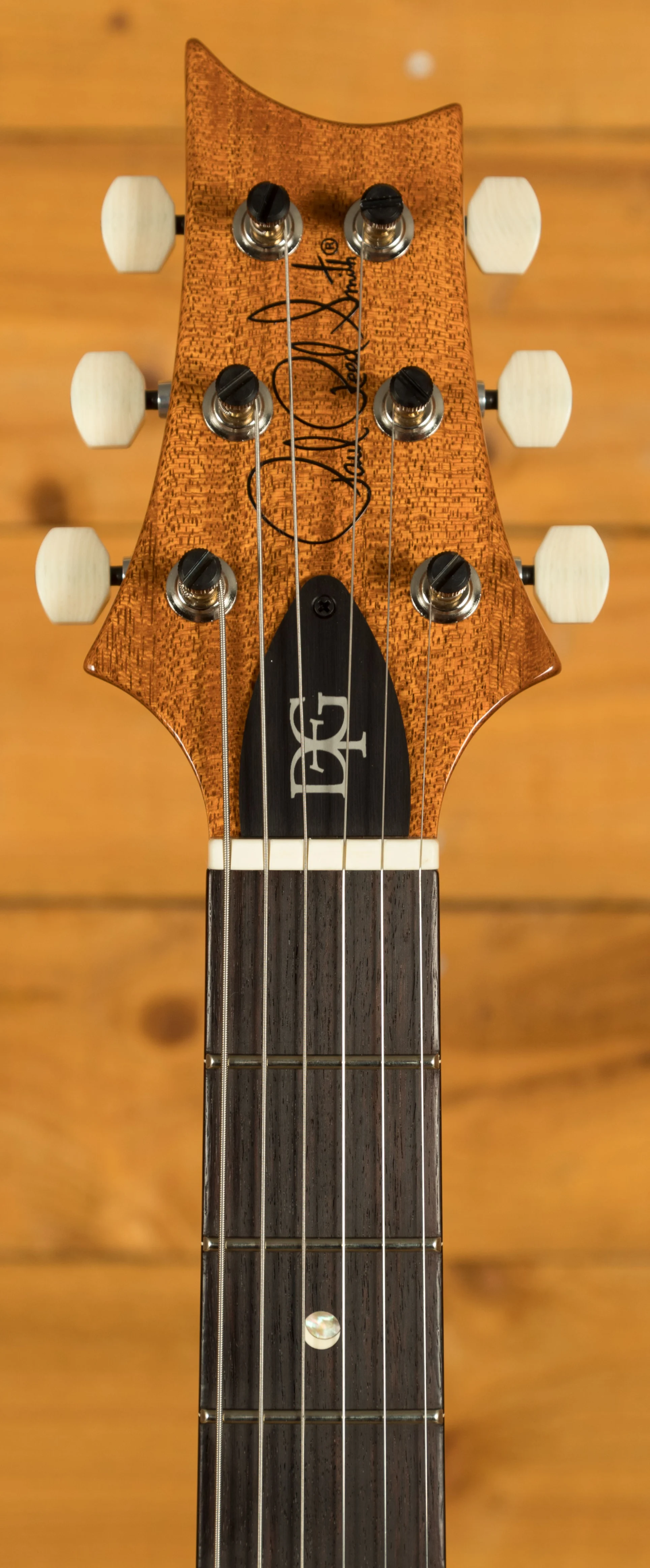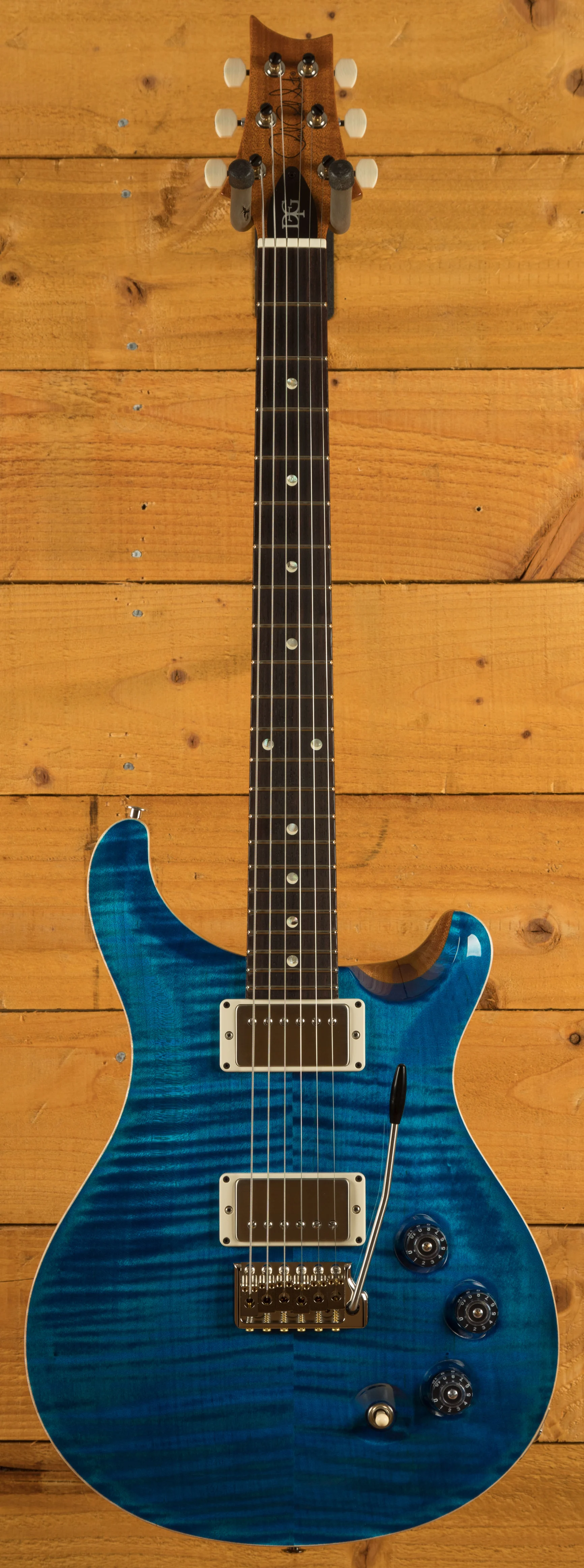 With a stunning carved figured maple top and mahogany back, it looks every bit as good as it sounds. Finished in a stunning Aquamarine finish, the DGT is a real tone machine! A 22 fret Rosewood fingerboard proudly bears the classic moon inlays and with its 25" scale length Mahogany neck it feels supremely comfortable. This guitar is strung with 11 gauge strings but you would easily think that they're 10's - these guitars play so well.