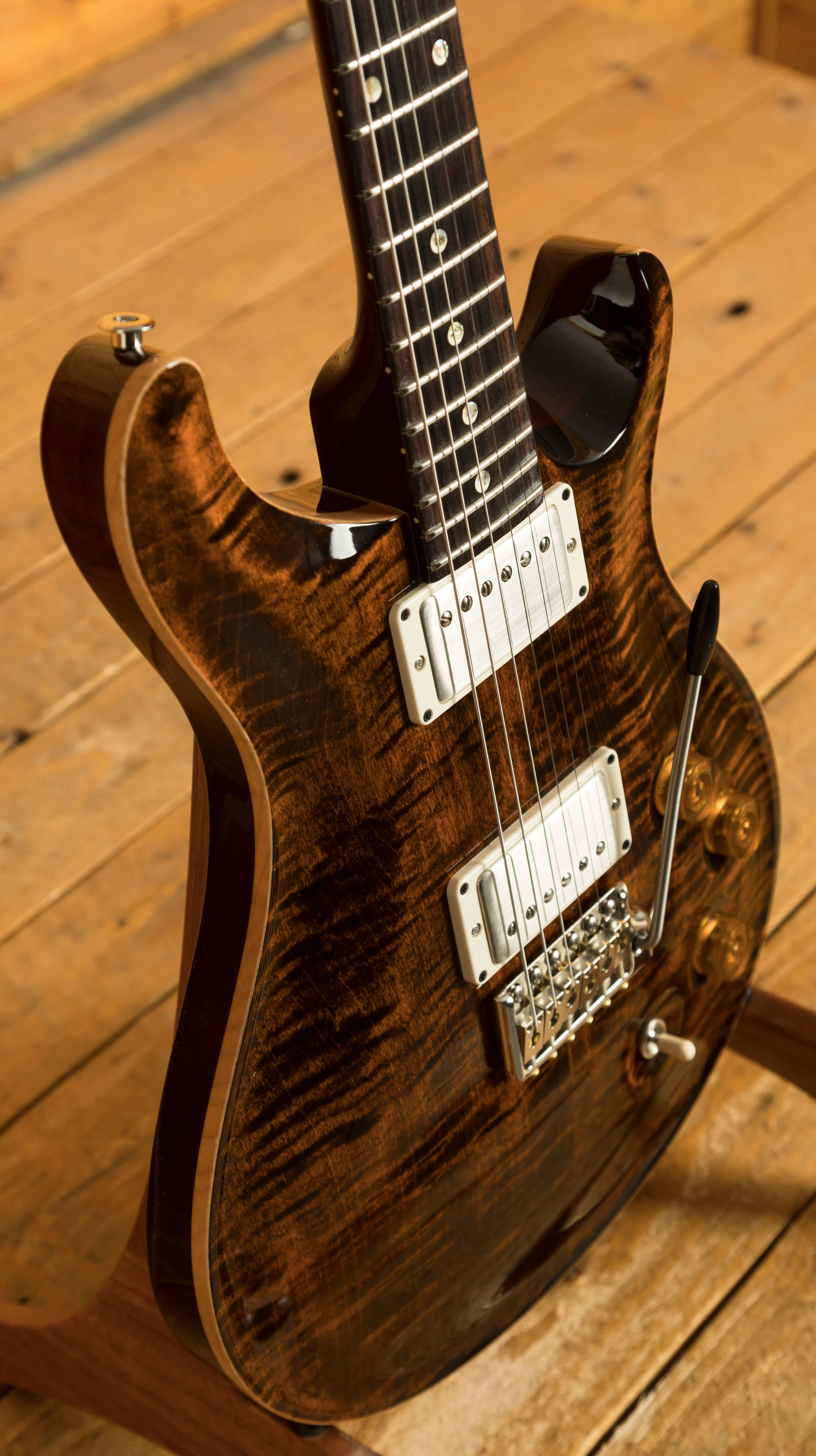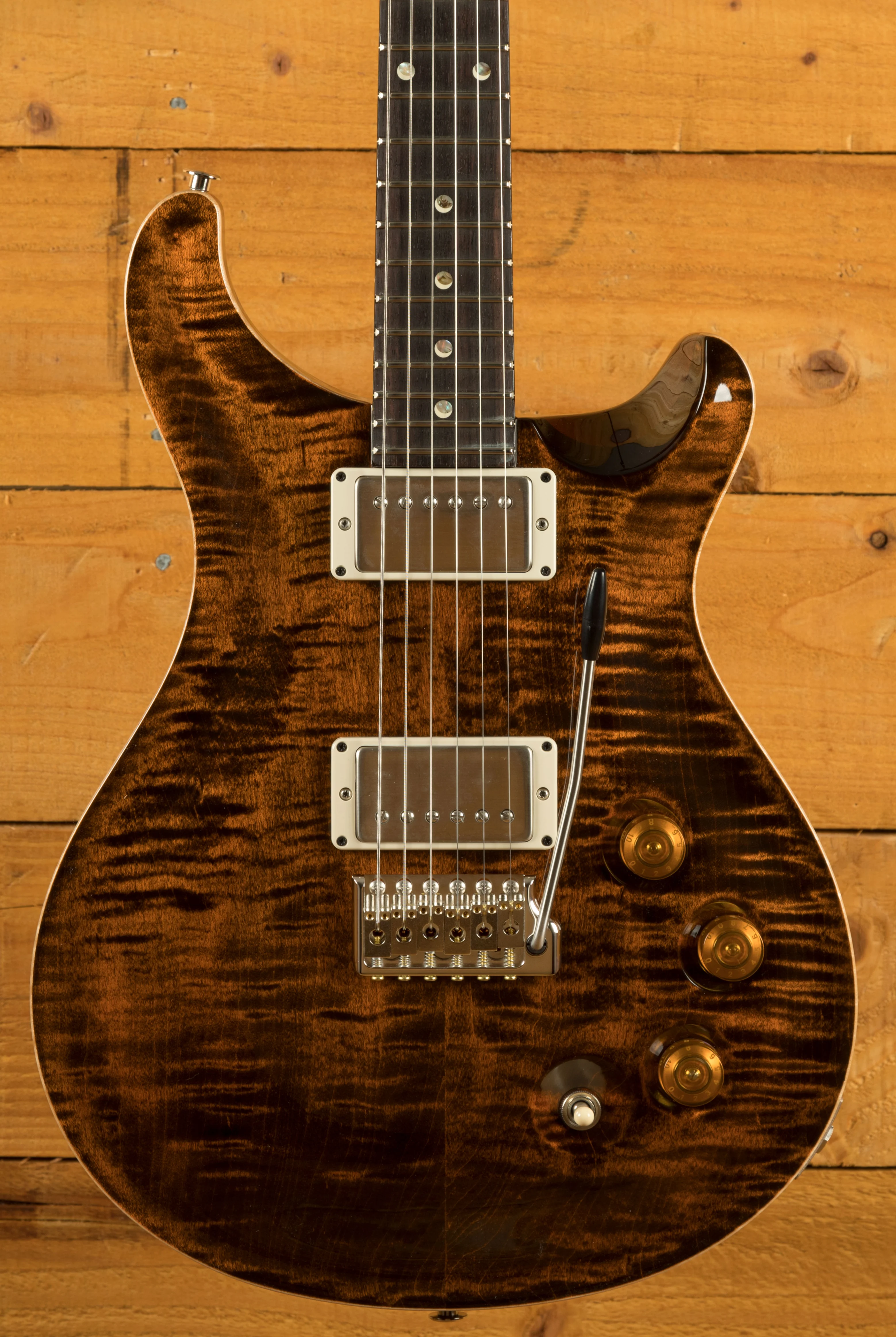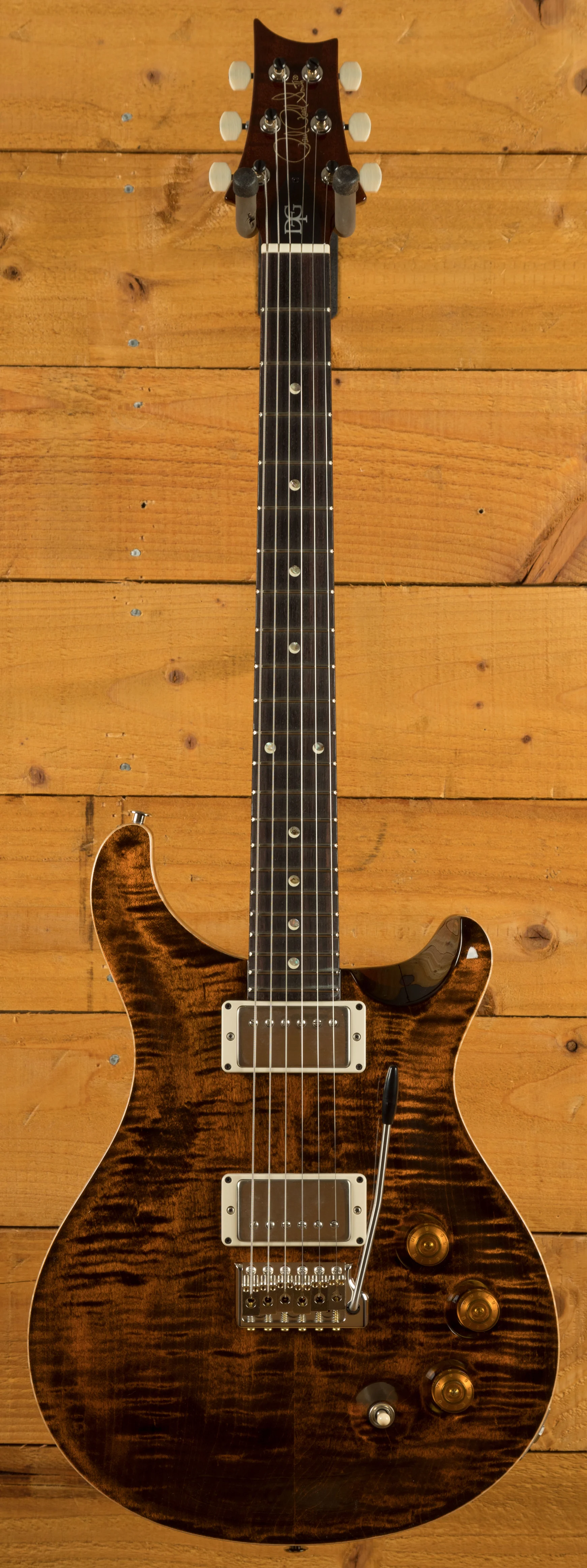 The collaboration between Paul Reed Smith and David Grissom spanning over 20 years has resulted in the creation of the DGT (David Grissom Trem) guitar. The DGT is built on the McCarty platform, but features a unique DGT neck shape, taller frets, special pickups, and a revised control layout. In order to achieve the vintage sound of DGT humbuckers, Grissom and Paul conducted extensive testing by A/B-ing over forty sets of pickups for a year. The pickups offer versatility and articulation when paired with individual volume controls for each pickup and a push/pull master tone control that operates the coil taps.