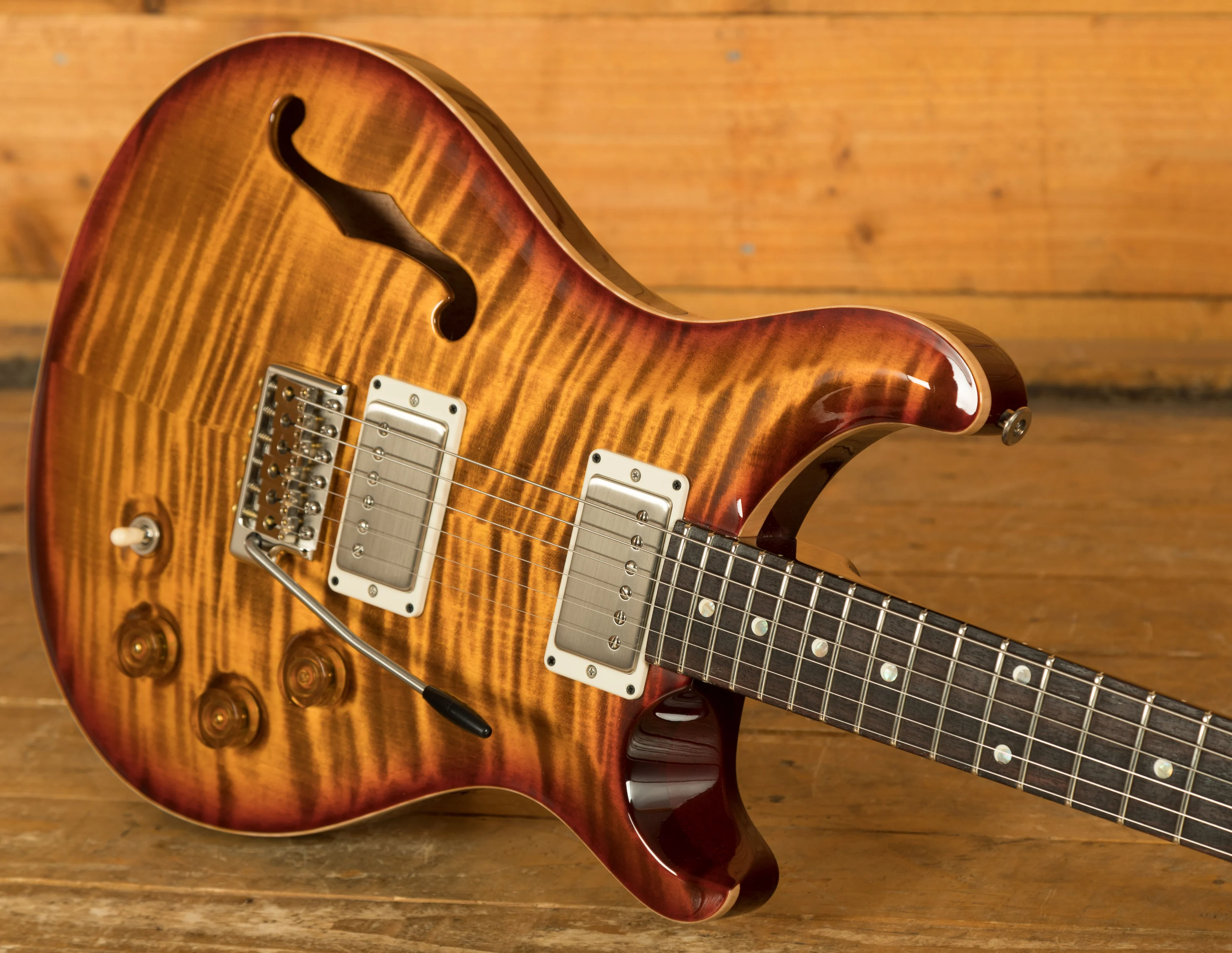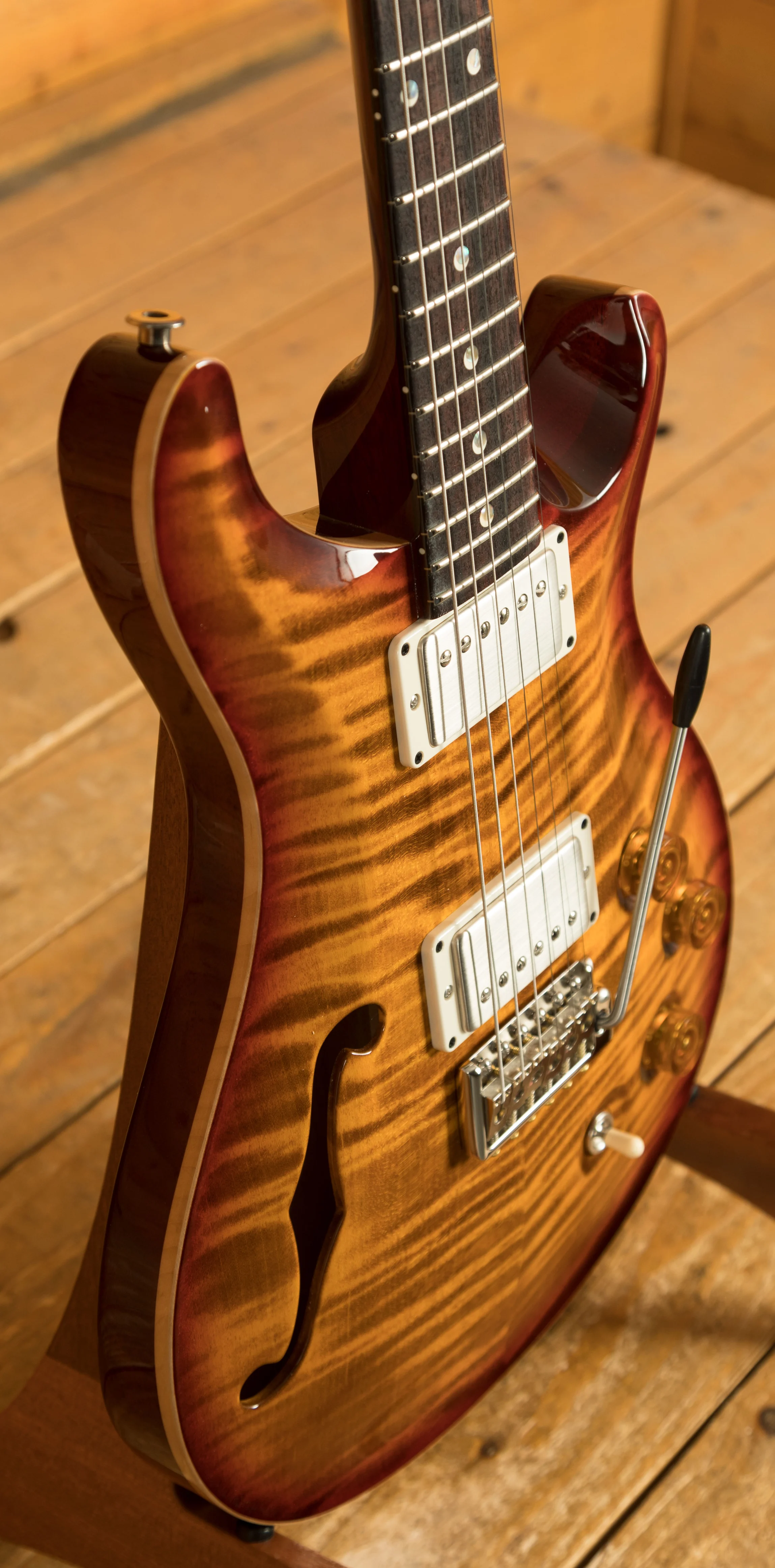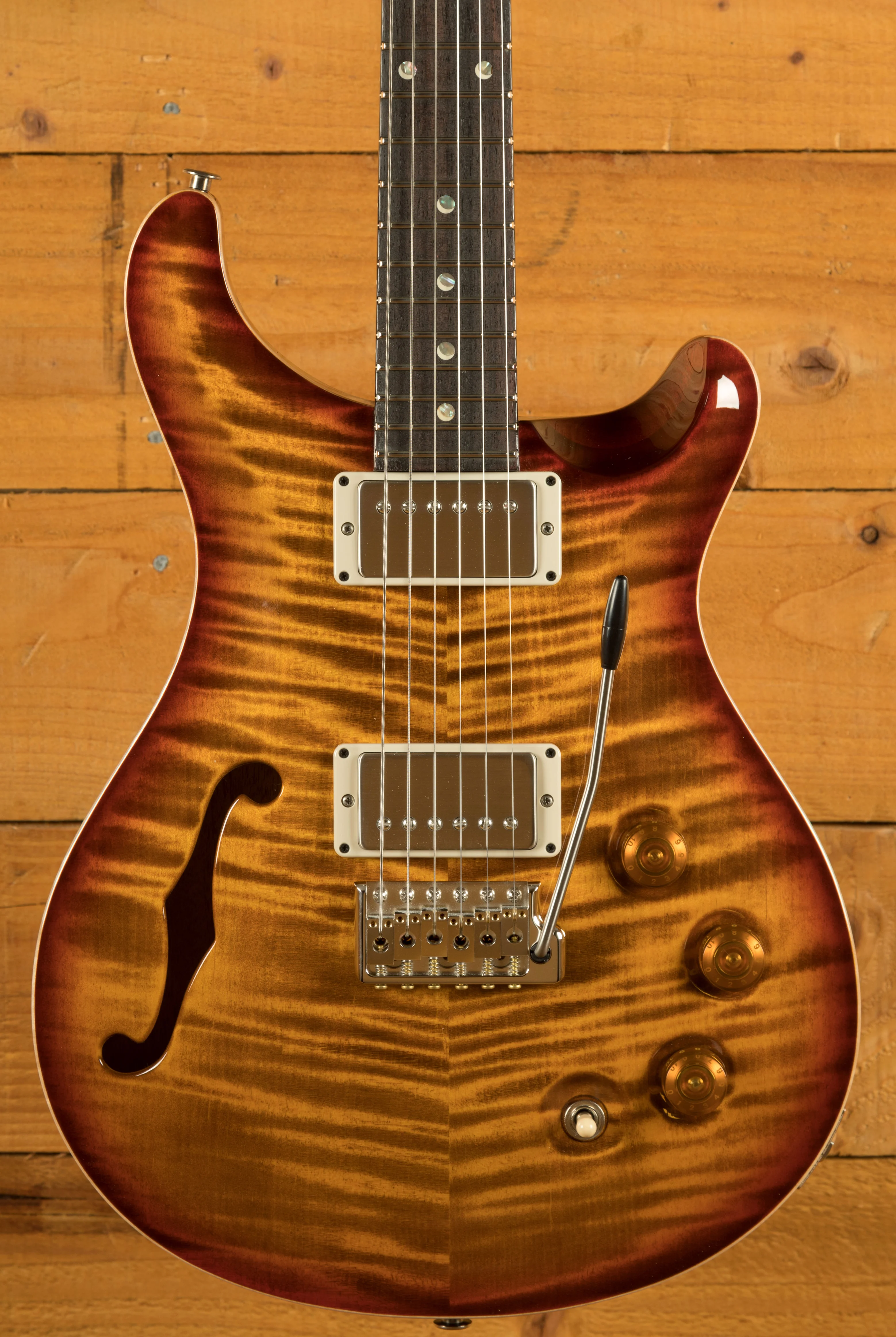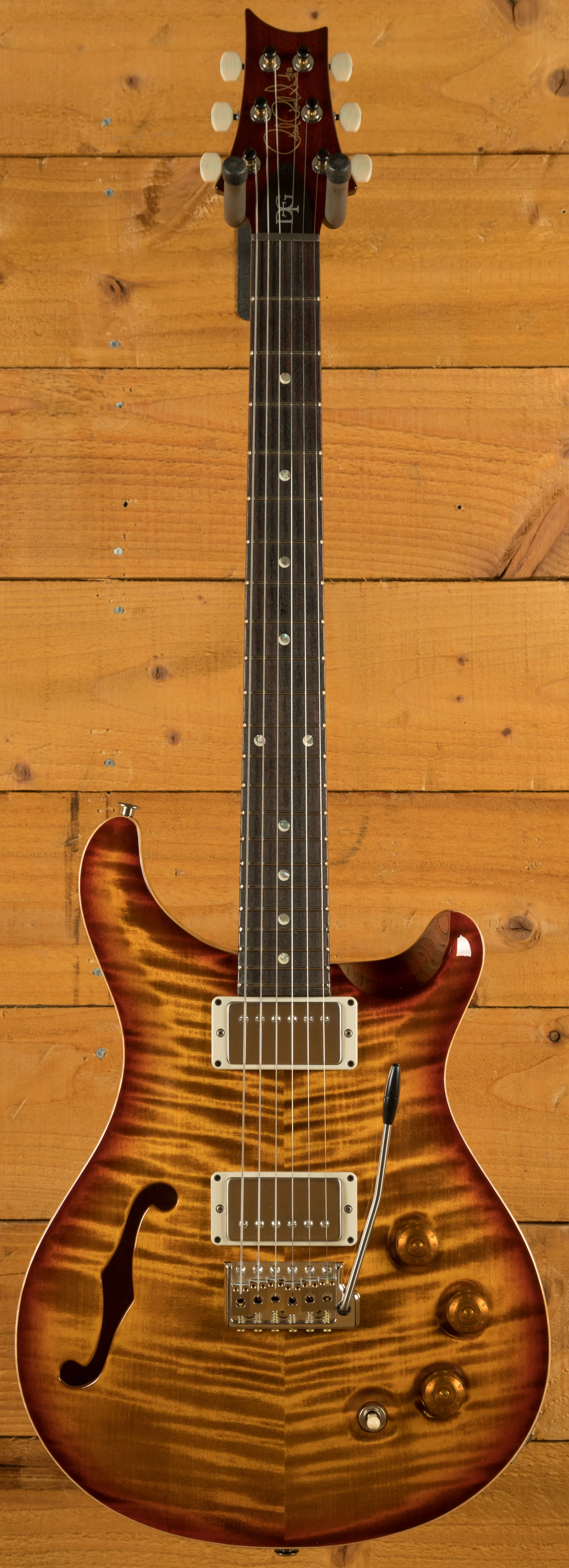 The PRS DGT Semi-Hollow is a meticulously crafted guitar designed from the collaboration between Paul Reed Smith and guitarist David Grissom. Built on the iconic McCarty platform, this semi-hollow guitar brings together classic design elements, such as the Dark Cherry Sunburst finish and moon inlays, with the unique features of Grissom's personal guitar, making it highly sought after by players and collectors alike.