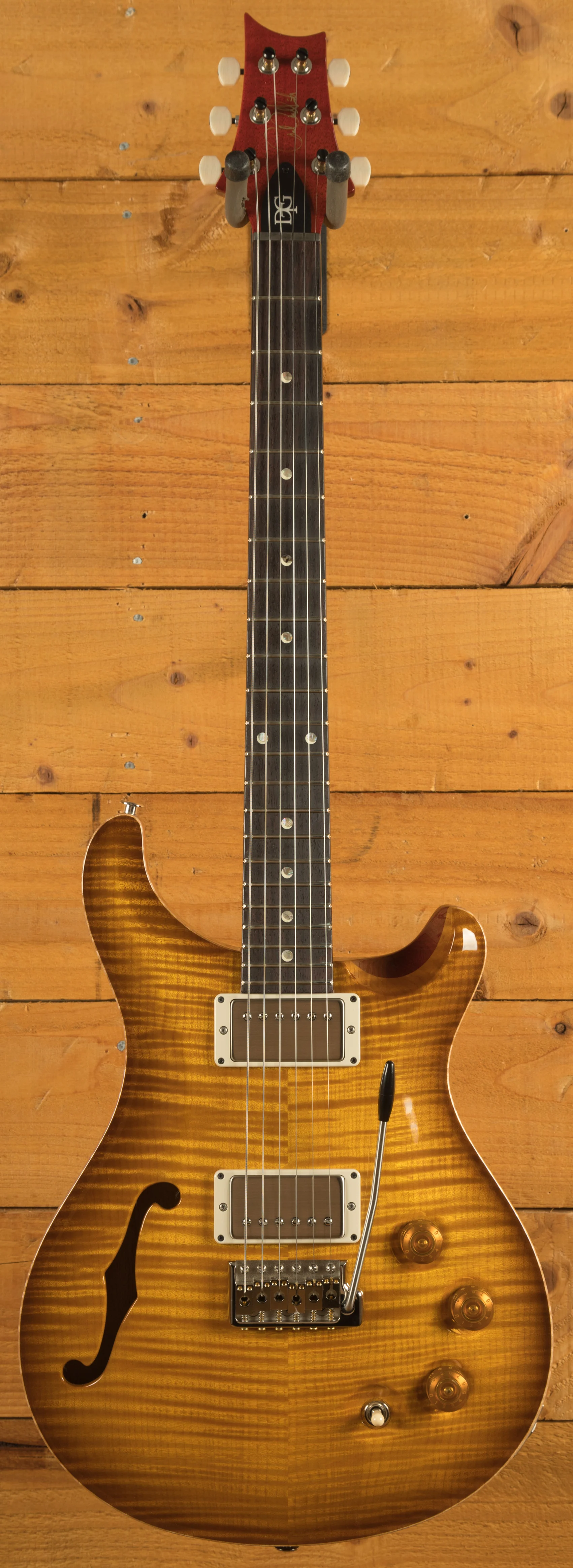 The PRS DGT Semi-Hollow Limited Edition is a meticulously crafted guitar designed from the collaboration between Paul Reed Smith and guitarist David Grissom. Built on the iconic McCarty platform, this limited-edition model brings together classic design elements, such as the McCarty Sunburst finish and moon inlays, with the unique features of Grissom's personal guitar, making it highly sought after by players and collectors alike.