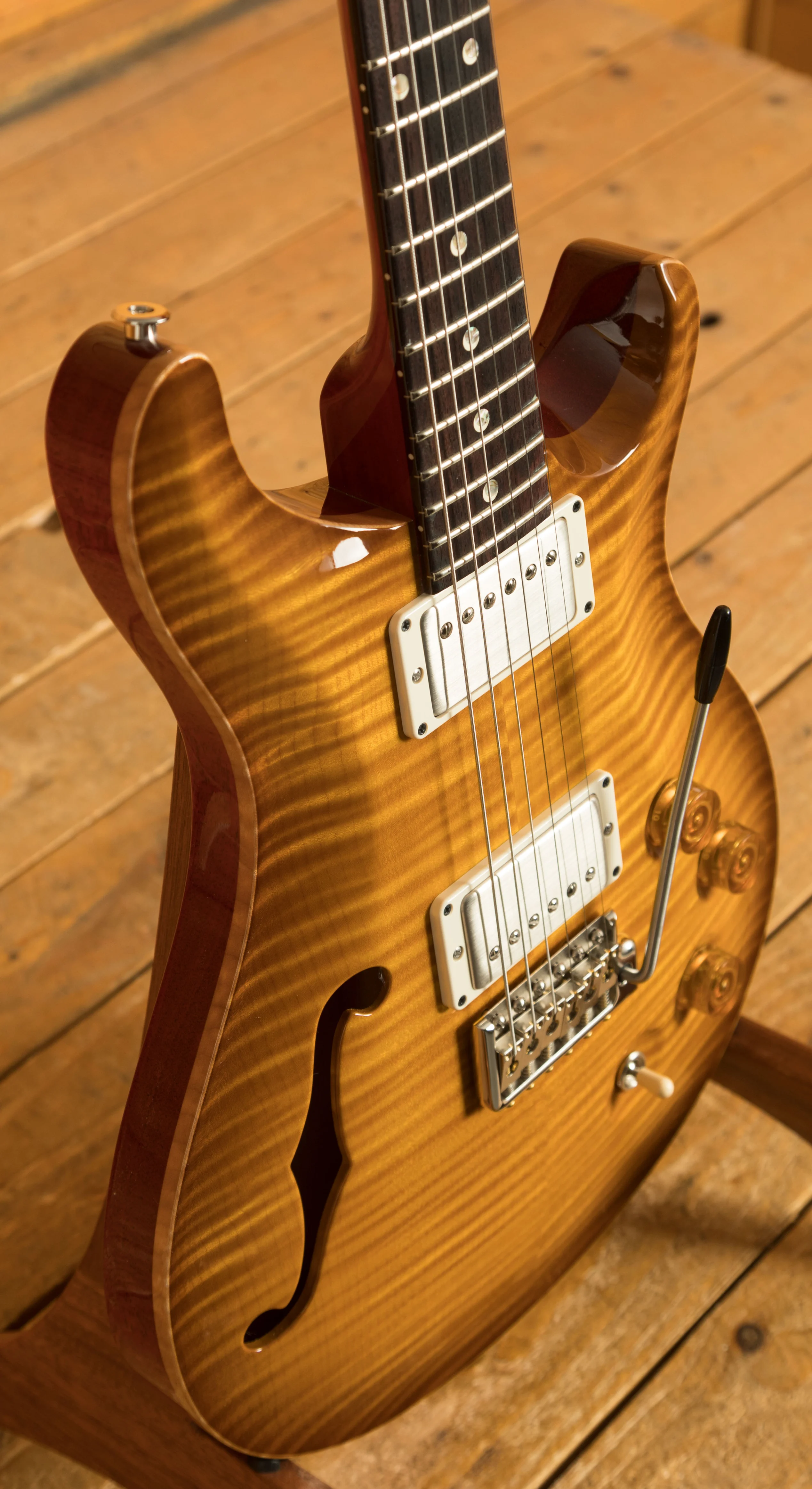 One of the standout features of this guitar is its semi-hollow construction, offering enhanced resonance and a rich, lively tone. The combination of a mahogany body and an "Artist Grade" maple top delivers warmth and clarity, while the 10" radius, 22-fret rosewood fingerboard, and 25" scale length mahogany neck ensure comfort and playability. The "Artist Grade" maple top features some stunning figuring and is a real standout feature. PRS guitars are always known for their incredible timber, but these particular DGT's are a real step up. The DGT neck shape and 1 11/16" nut width are designed for a familiar yet refined feel, making it versatile for different playing styles.