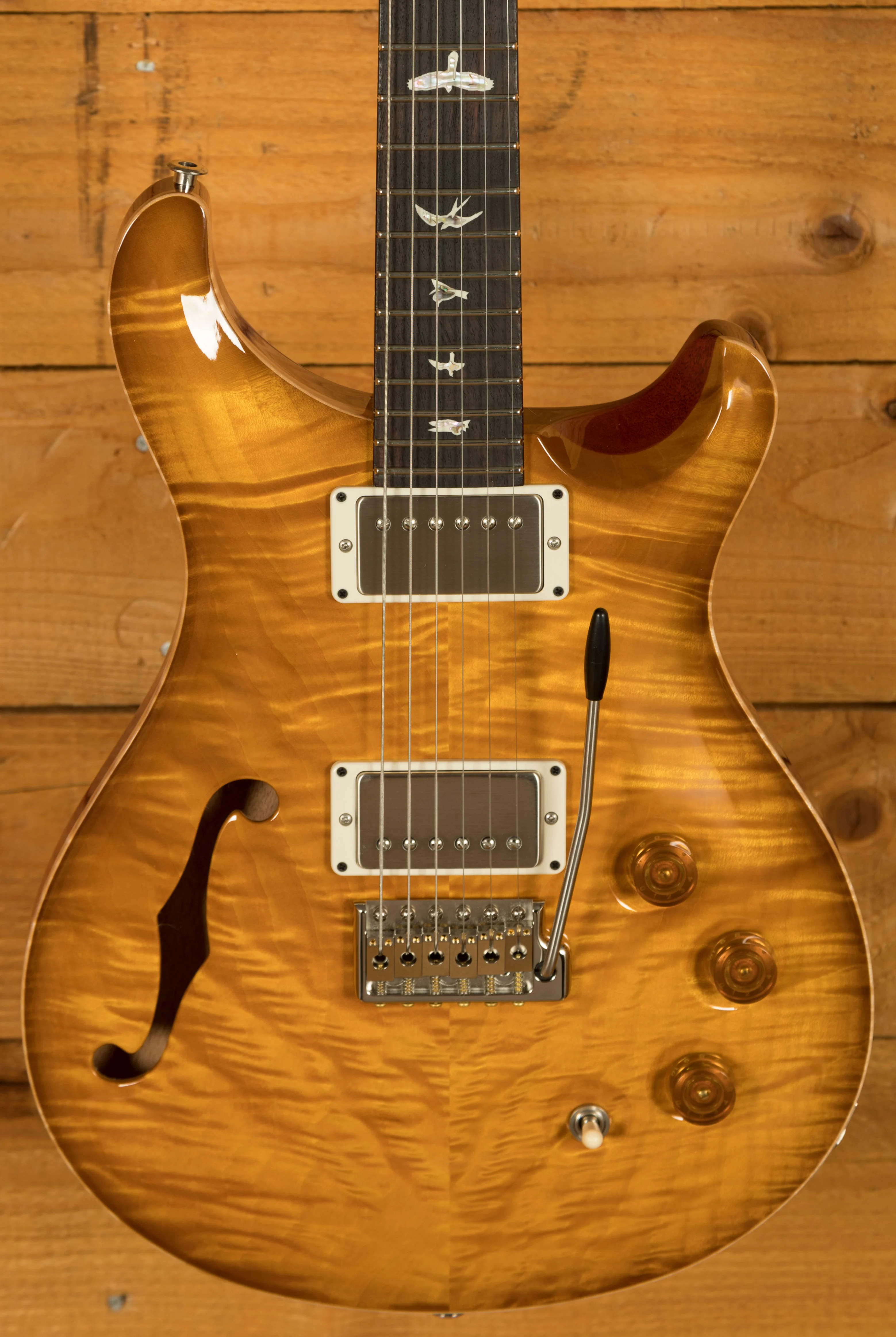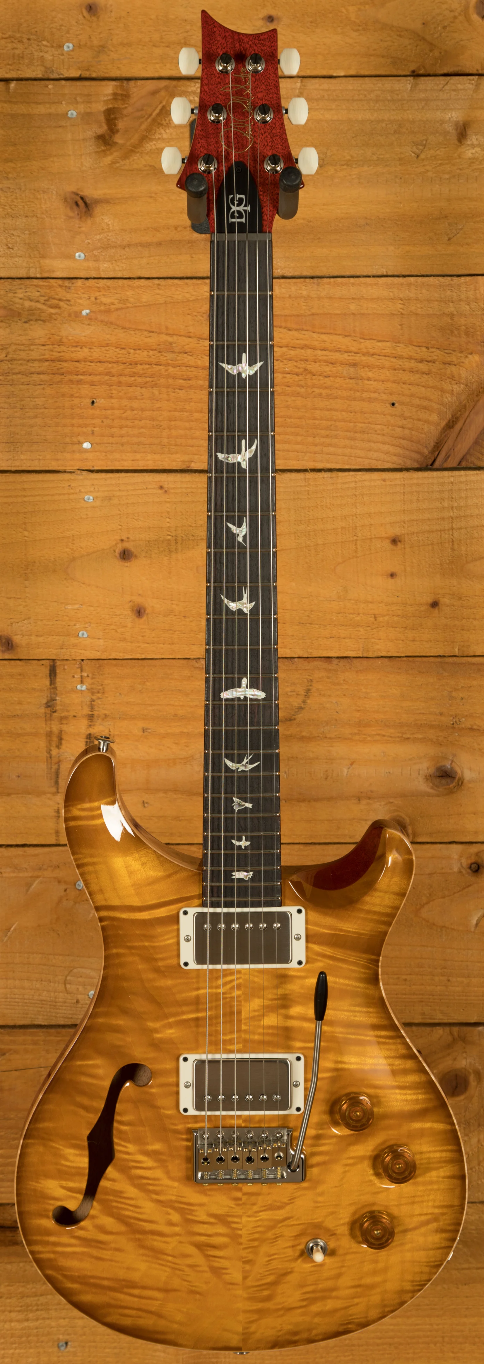 The PRS DGT Semi-Hollow is a meticulously crafted guitar designed from the collaboration between Paul Reed Smith and guitarist David Grissom. Built on the iconic McCarty platform, this semi-hollow guitar brings together classic design elements, such as the McCarty Sunburst finish and bird inlays, with the unique features of Grissom's personal guitar, making it highly sought after by players and collectors alike.