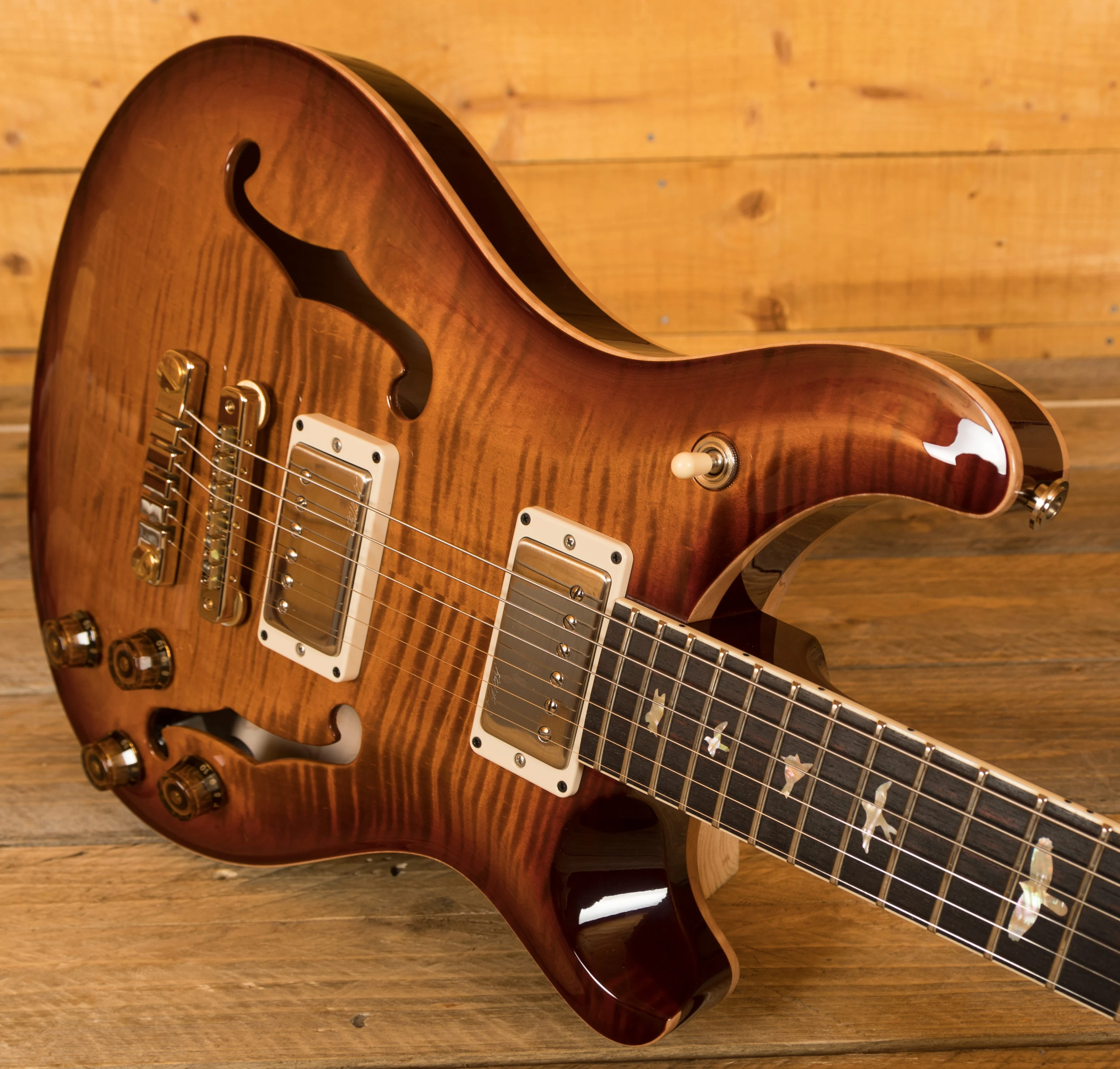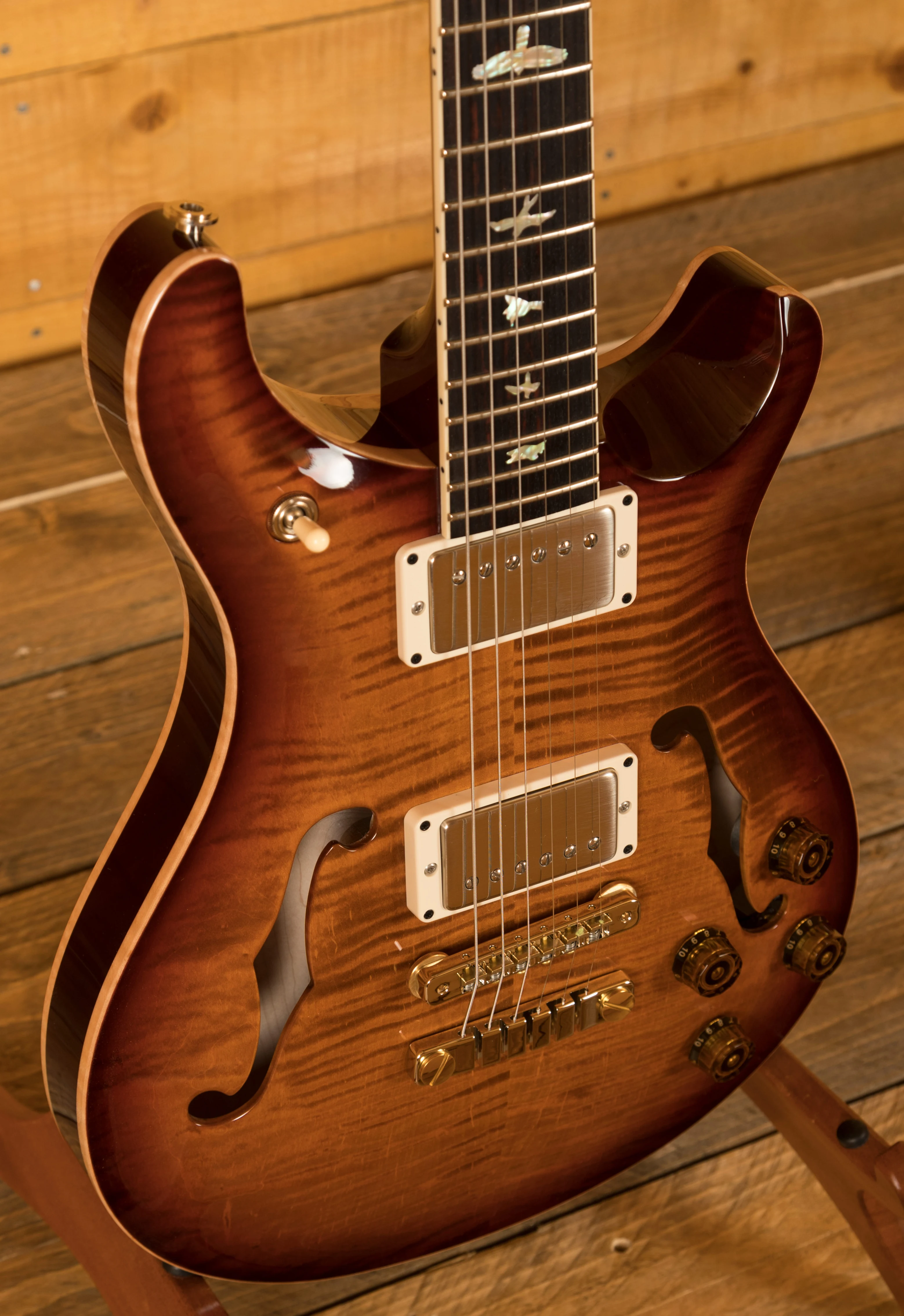 With a PRS adjustable stoptail and tweaked Phase III locking tuners you get great tuning stability and intonation.