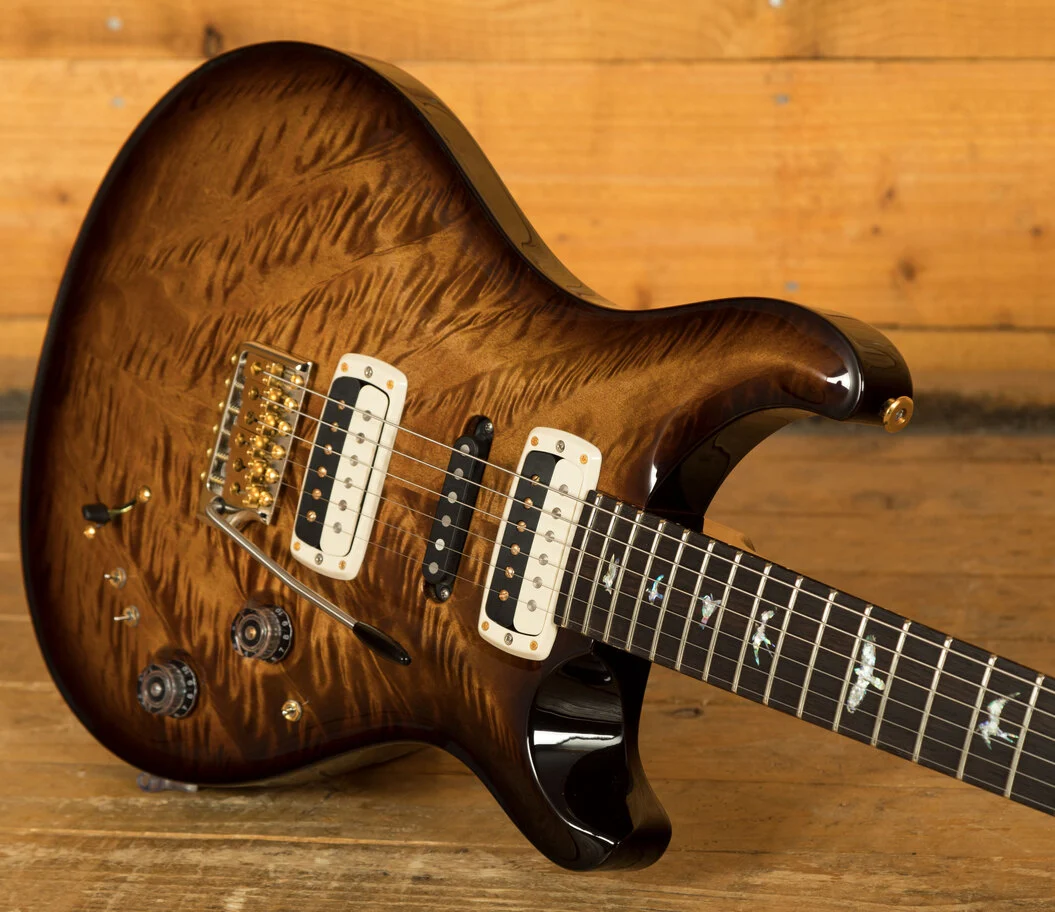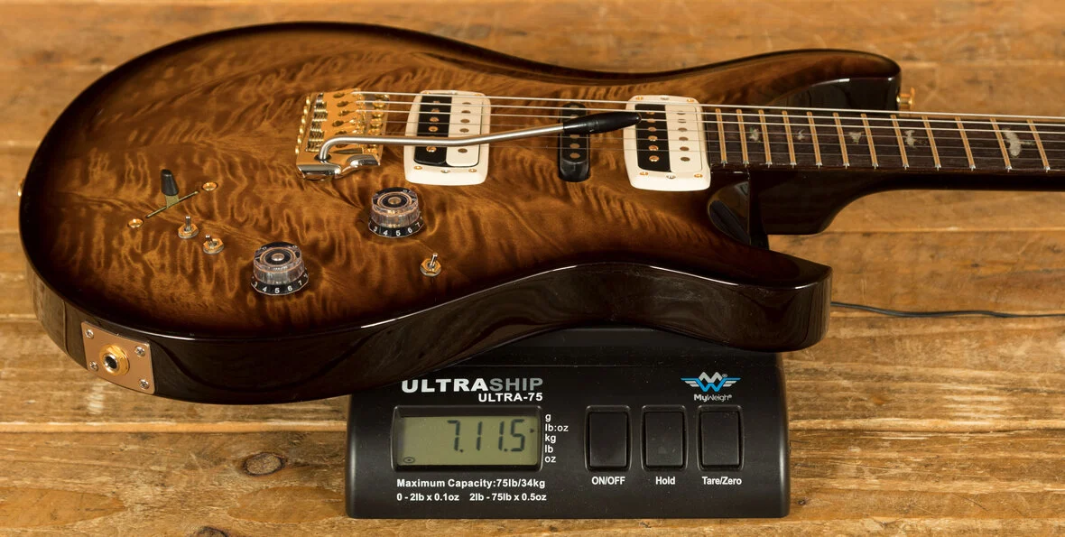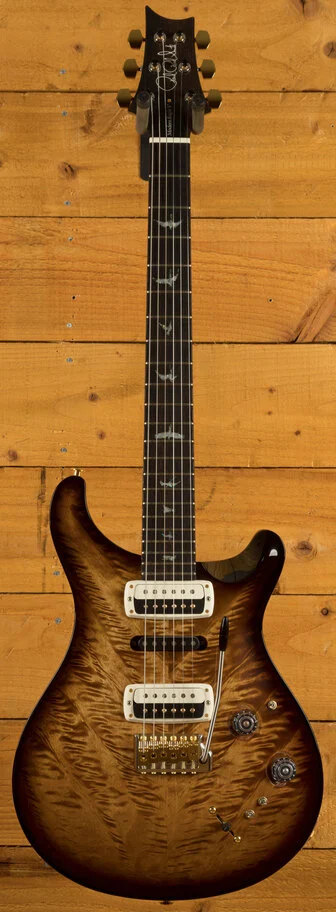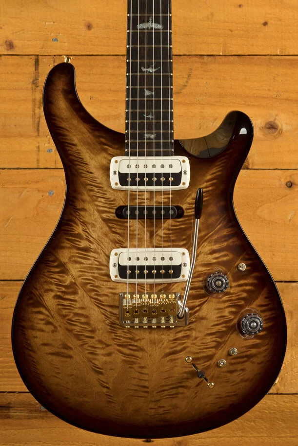 The PRS Modern Eagle V utilizes a hum/single/hum (five-coil) pickup configuration and introduces a new and unique switching system that gives players a vast array of tones in one guitar. The 5-way blade switch selects the pickups just as the 509 does (treble, treble and middle, middle, middle and bass, bass). The two paired mini-toggles separate the slug-side coils, turning the humbuckers into true, "TCI-tuned" single coils. There is a single volume and a push/pull tone control that activates both humbuckers when engaged; this allows players to access three pickups simultaneously. Finally, there is a third mini-toggle that changes the volume pot value from 500k to 250k, which gives the guitar a different palette of tones. This electronics design puts a whole set of classic and new tones at your fingertips.