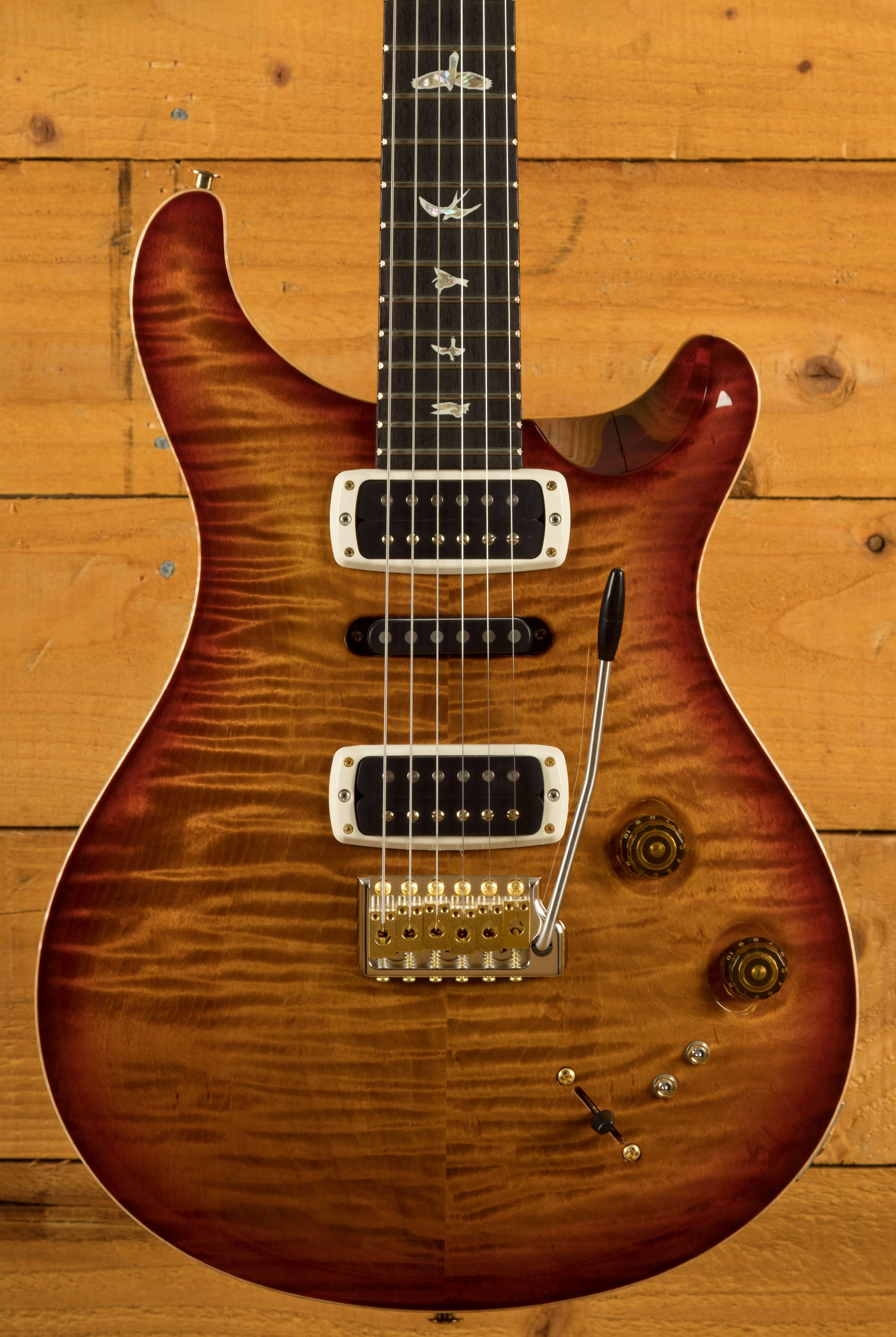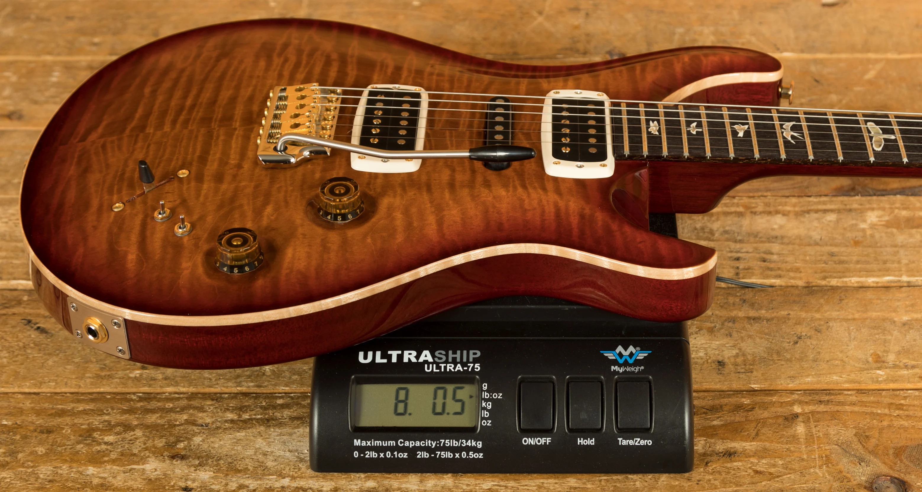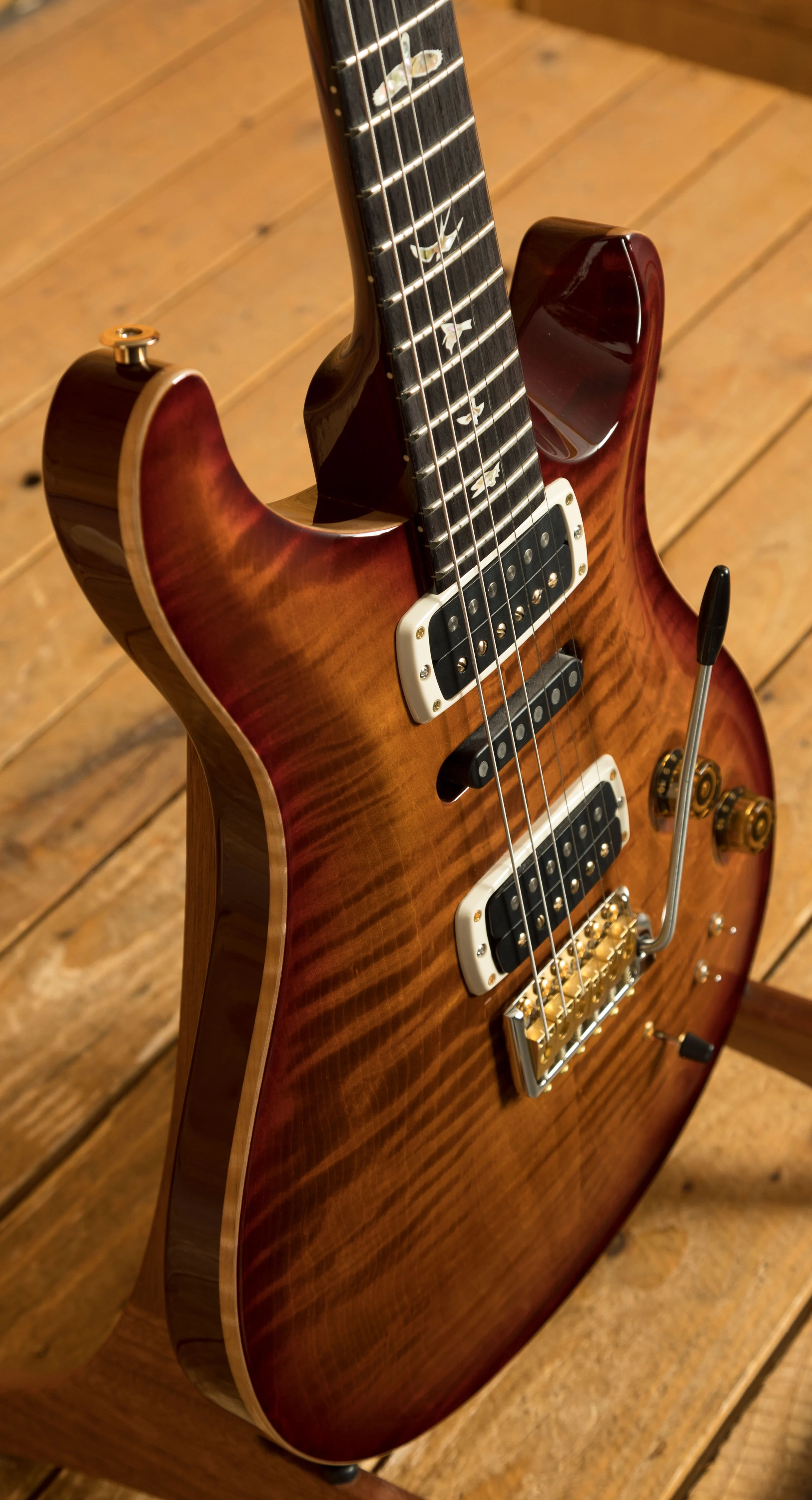 The PRS Modern Eagle V utilizes a hum/single/hum (five-coil) pickup configuration and introduces a new and unique switching system that gives players a vast array of tones in one guitar. The 5-way blade switch selects the pickups just as the 509 does (treble, treble and middle, middle, middle and bass, bass). The two paired mini-toggles separate the slug-side coils, turning the humbuckers into true, "TCI-tuned" single coils. There is a single volume and a push/pull tone control that activates both humbuckers when engaged; this allows players to access three pickups simultaneously. This electronics design puts a whole set of classic and new tones at your fingertips.