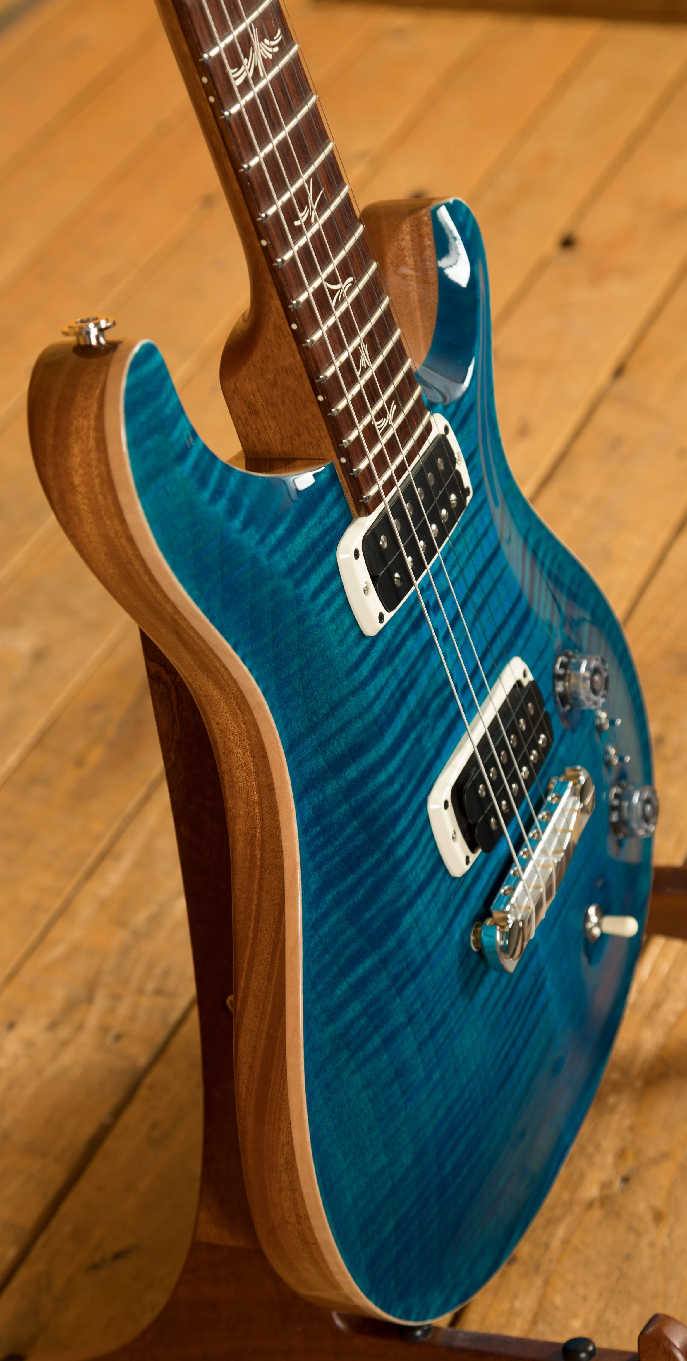 The Mahogany body with Carved Figured Maple top offers a rich warmth and depth that complements the beautiful aesthetic. The Aquamarine finish is vibrant and really highlights the incredible figuring on this guitar. It is extremely well weighted and incredibly comfortable against the body.