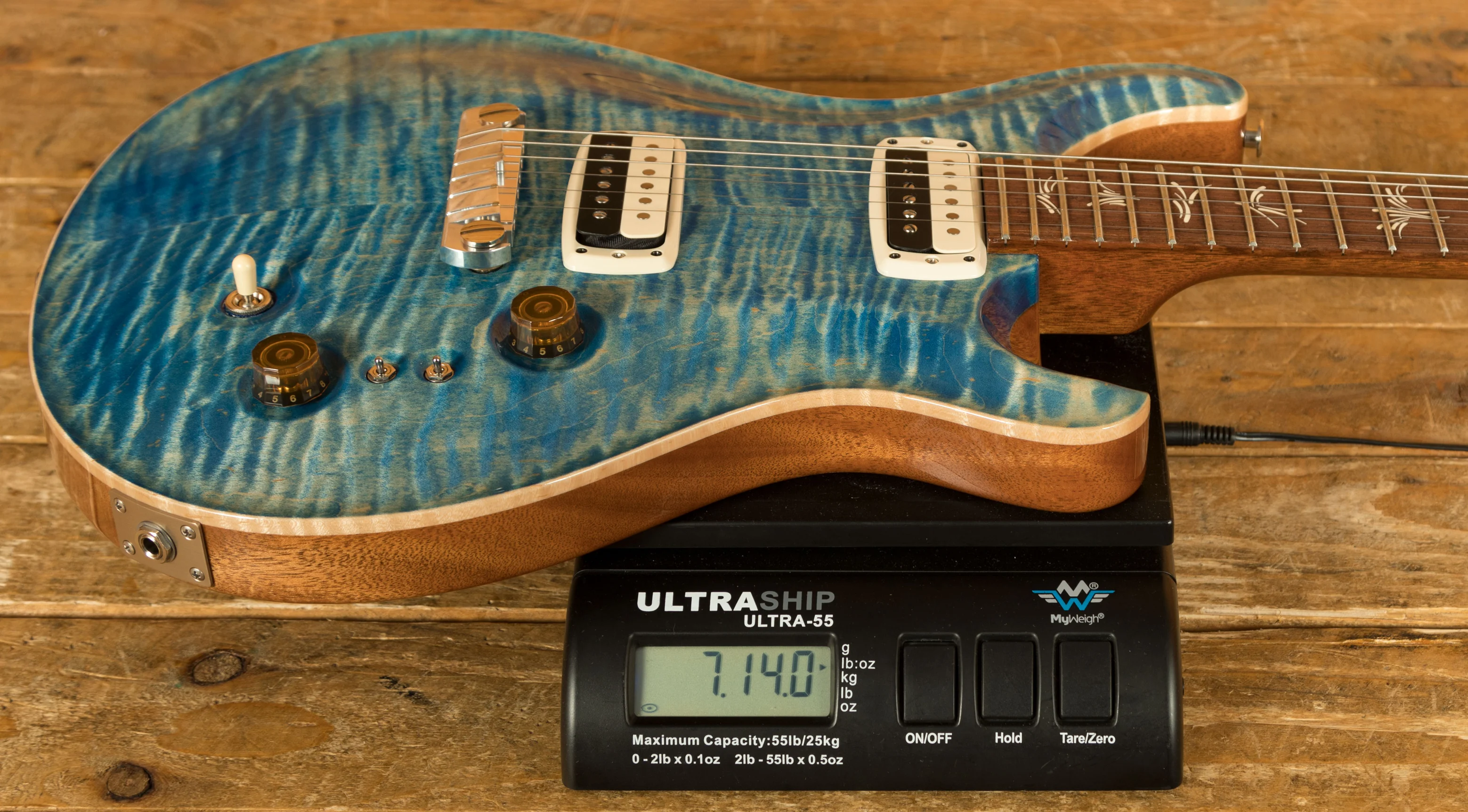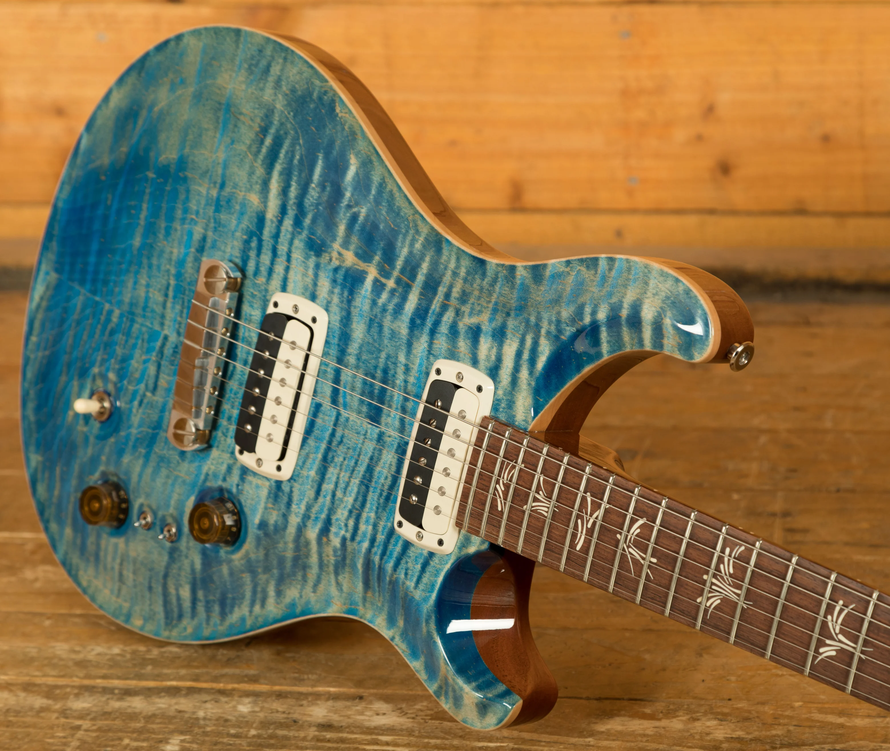 The Mahogany body with Carved Figured Maple top offers a rich warmth and depth that complements the beautiful aesthetic. The Faded Blue Jean finish is vibrant and really highlights the incredible figuring on this guitar. It is extremely well weighted and incredibly comfortable against the body.