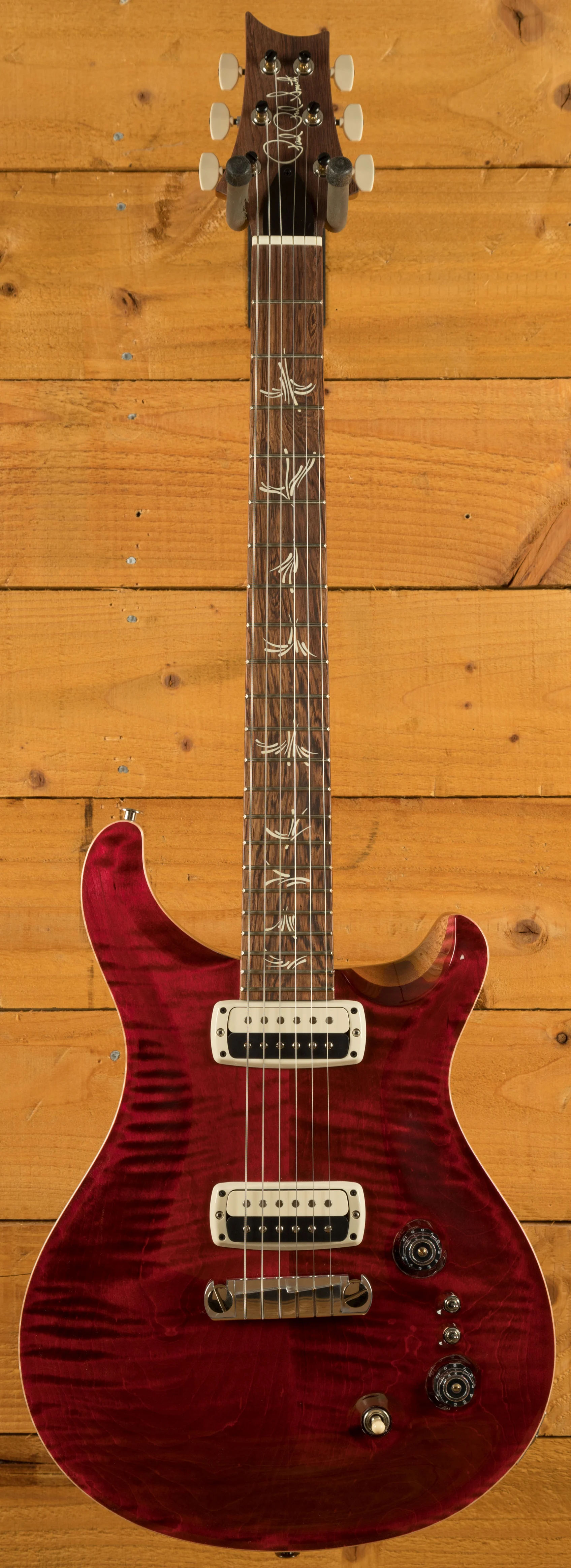 With a Pattern profile, 25" scale length 22 frets, the Mahogany neck feels really comfortable and familiar. The iconic PRS brushstroke birds sit proudly atop the Honduran Rosewood fingerboard for the definitive PRS experience.