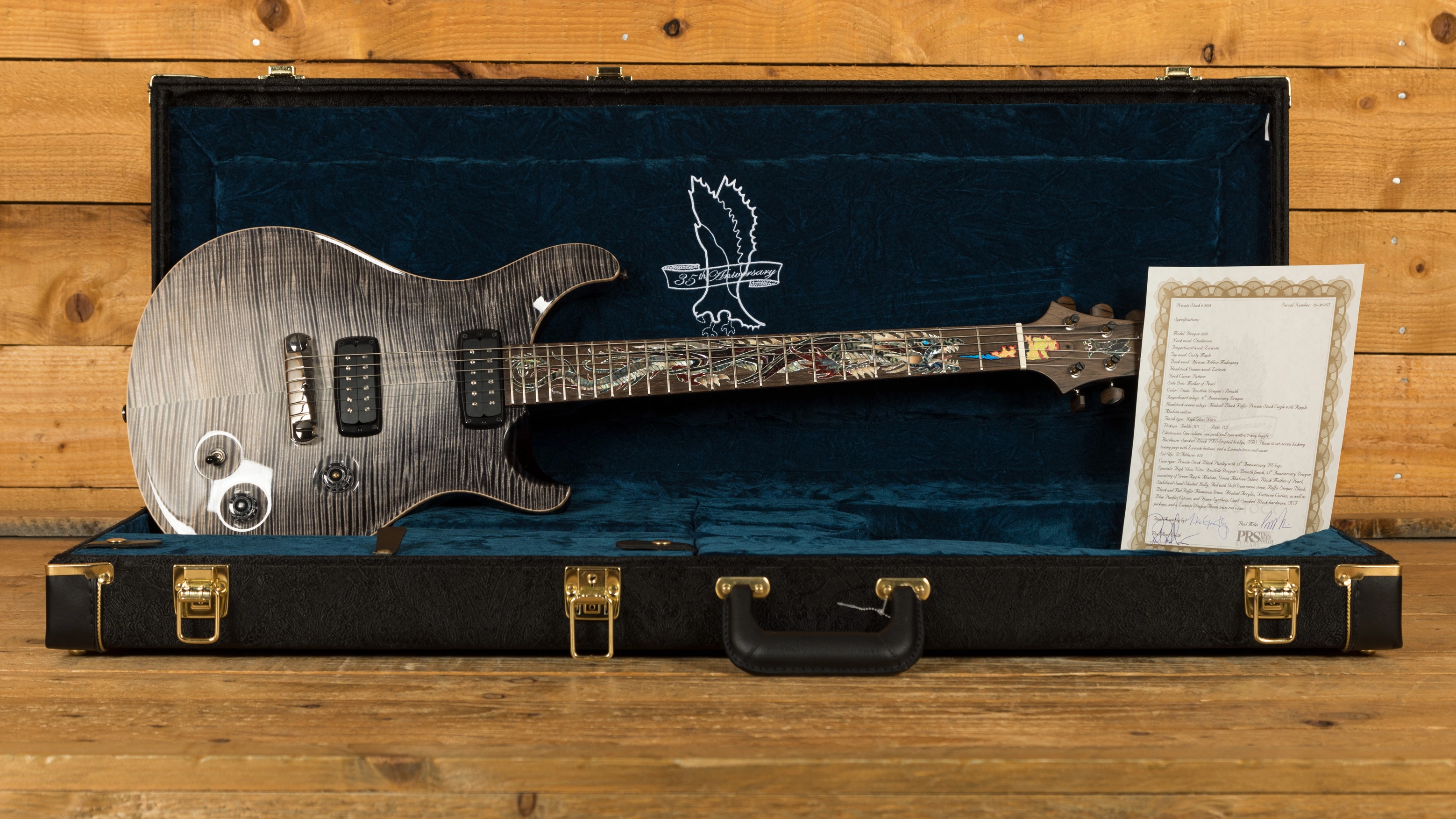 The 35th Anniversary Dragon is based off of the PRS McCarty model, featuring a thicker back, PRS Stoptail bridge, and a classic volume, push/ pull tone control, and 3-way toggle electronics layout, but with TCI model pickups from the Pauls Guitar and tweaked Phase III Locking tuners for a unique balance of vintage and modern specifications. The extraordinary Private Stock grade tone woods were hand selected for this limited series and include a curly maple top, African ribbon mahogany back, and a chaltecoco Pattern neck with a 25" scale length, 22 fret ziricote fingerboard.