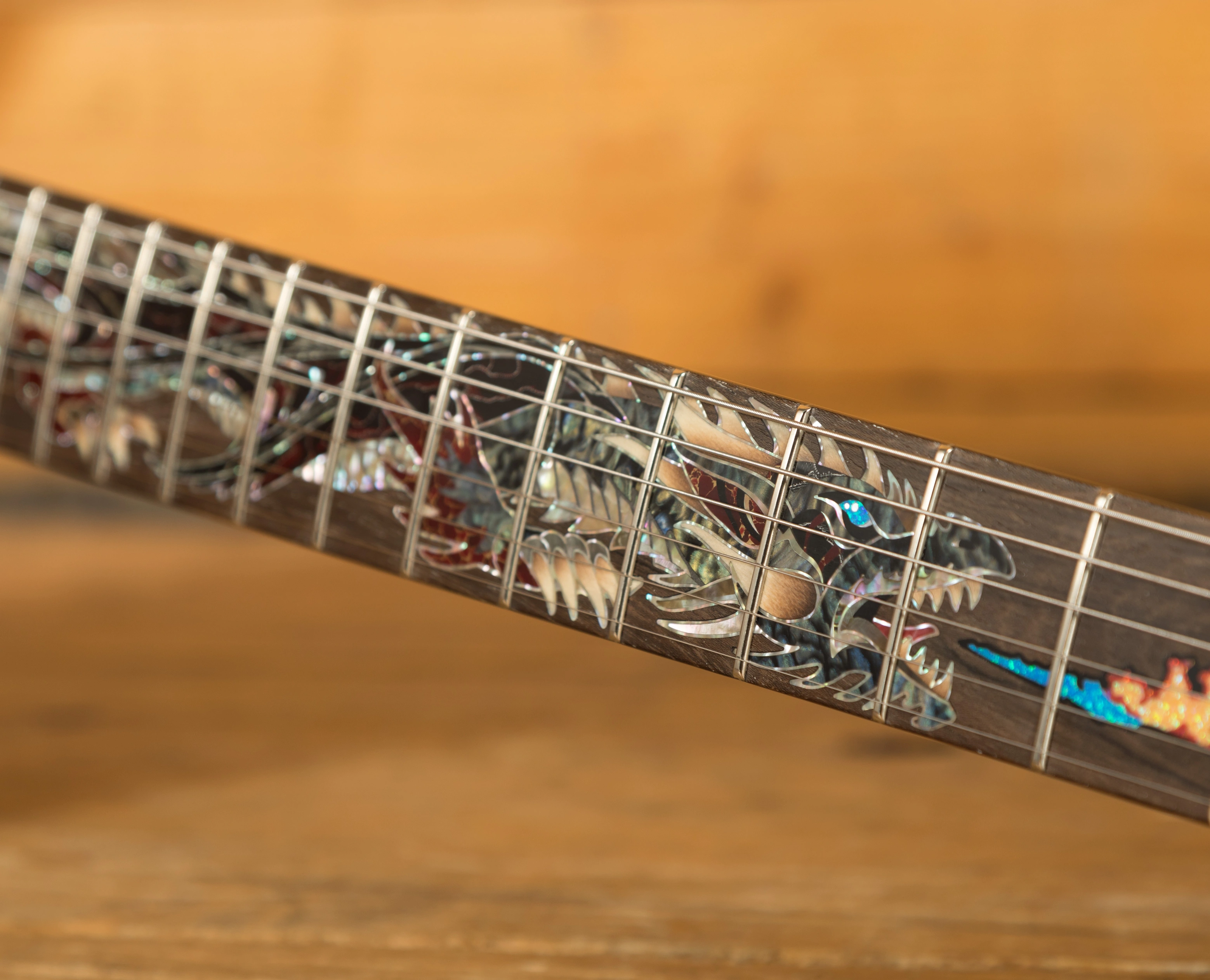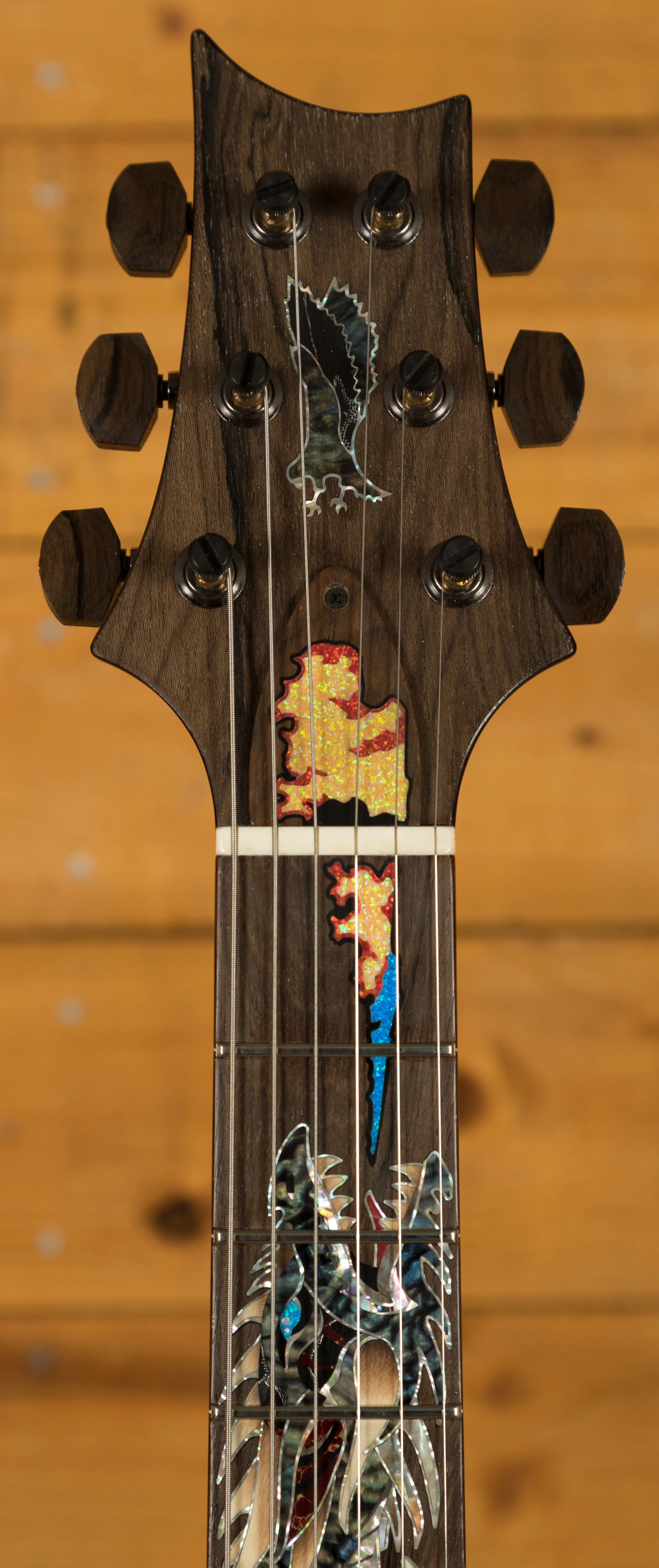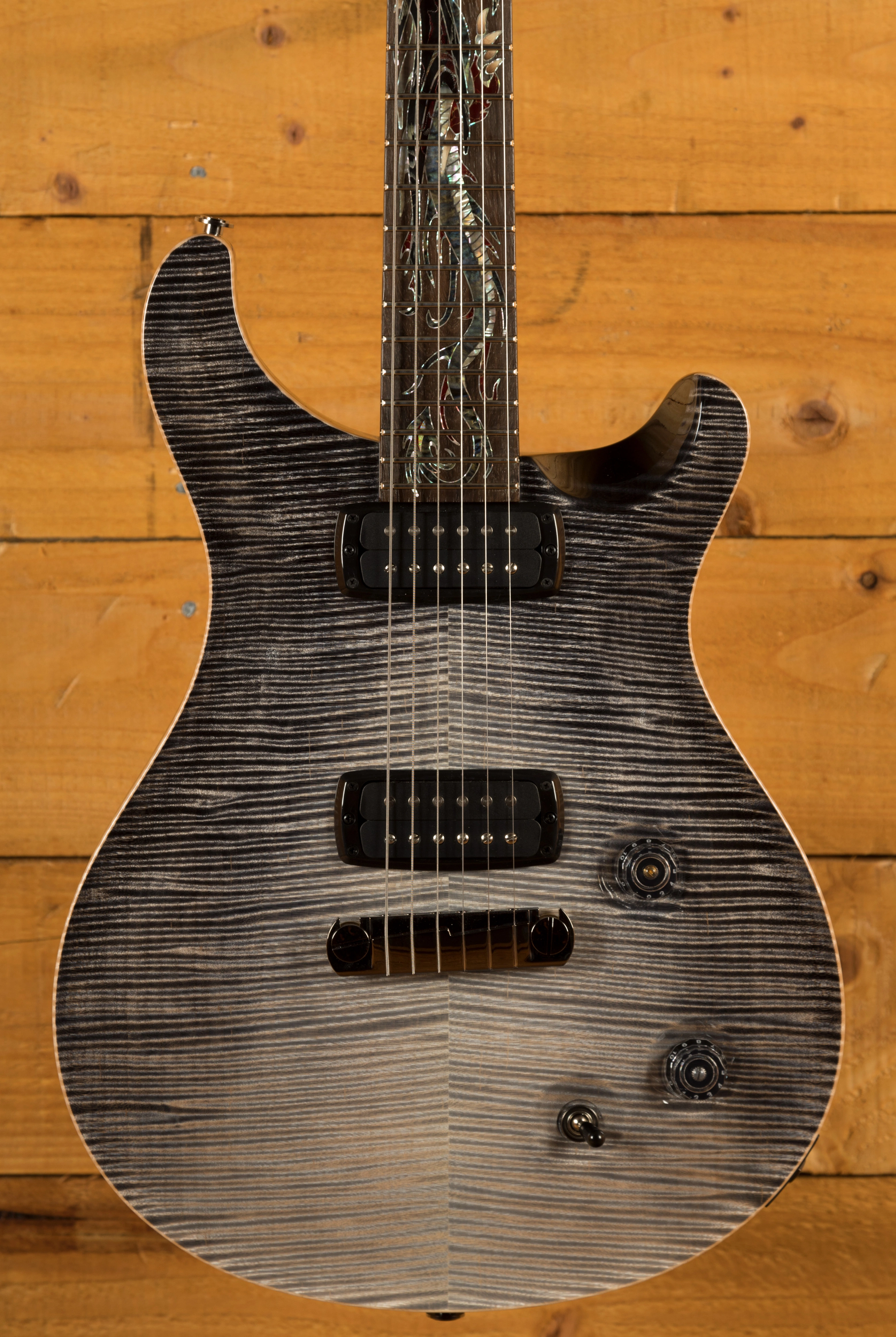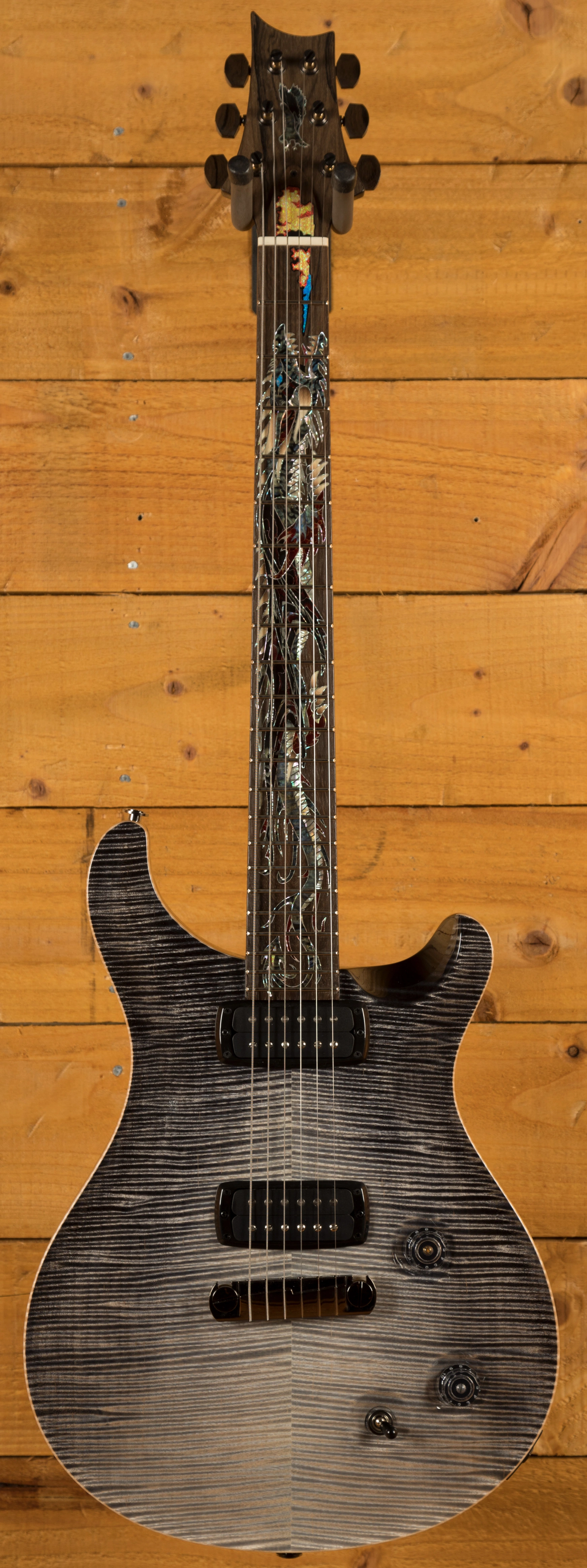 The visual star of the guitar is the elaborate, fantastical dragon inlay designed by Jeff Easley, a fantasy artist famous for some of Dungeons & Dragons rulebook covers. PRS Guitars engaged Aulson Inlay, to deconstruct Easleys artwork and recreate it for the fretboard of the guitar. The design concludes with the dragons breath of fire extending onto the truss rod cover. The finished inlay is fashioned from a wide array of materials including: Green Ripple Abalone, Green Abalone Select, Black Mother of Pearl, Stabilized Sand-Shaded Holly, Red with Gold Vein Recon Stone, Raffir Striped Black, Black and Red Raffir Aluminum Wave, Abaloid Acrylic, Nocturne Corian, as well as Blue Pacific, Citrine, and Flame Synthetic Opal.