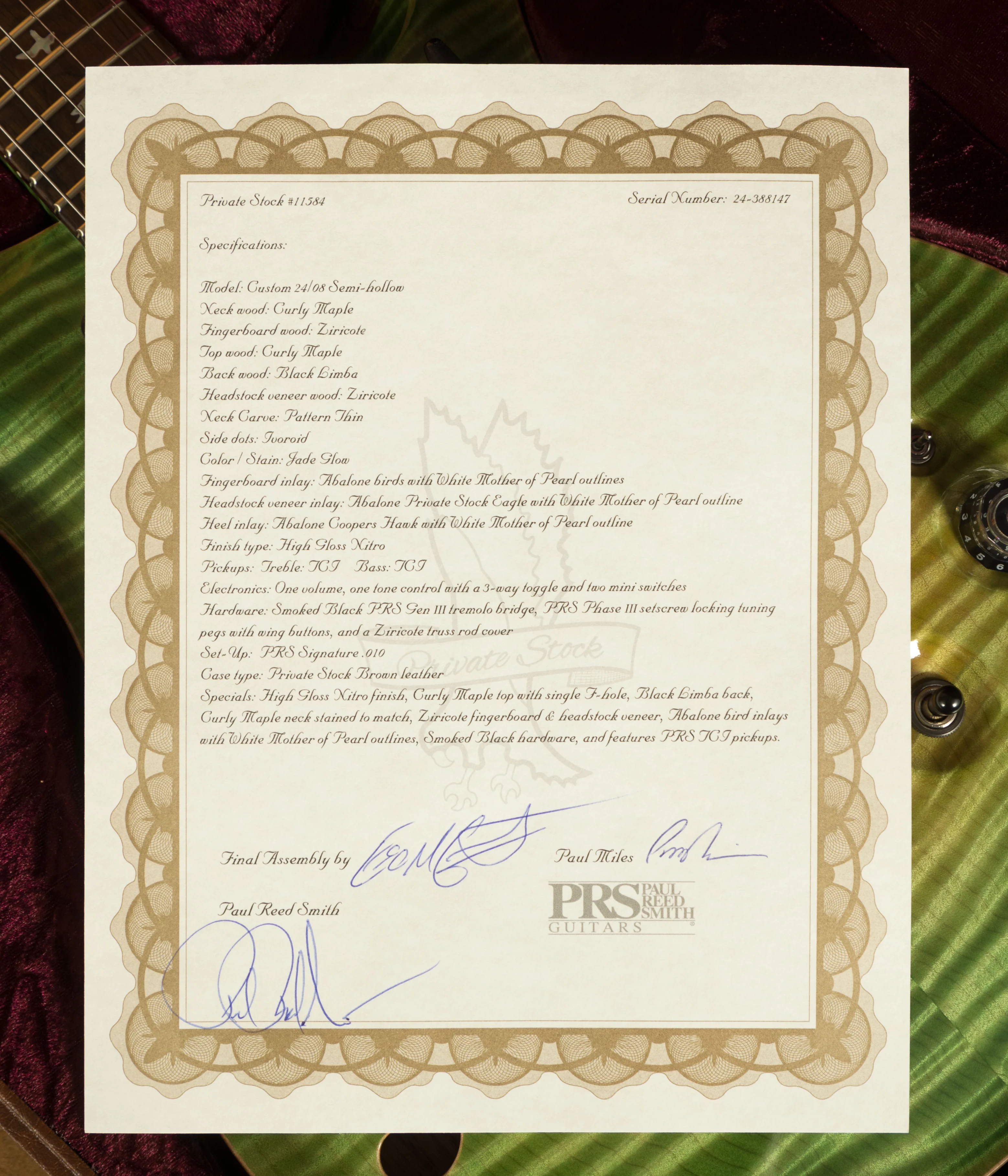 This exceptional guitar comes protected in a stunning Private Stock Brown Leather hard case and includes a certificate signed by Paul Reed Smith, Paul Miles (Director of Private Stock), and the final assembler.