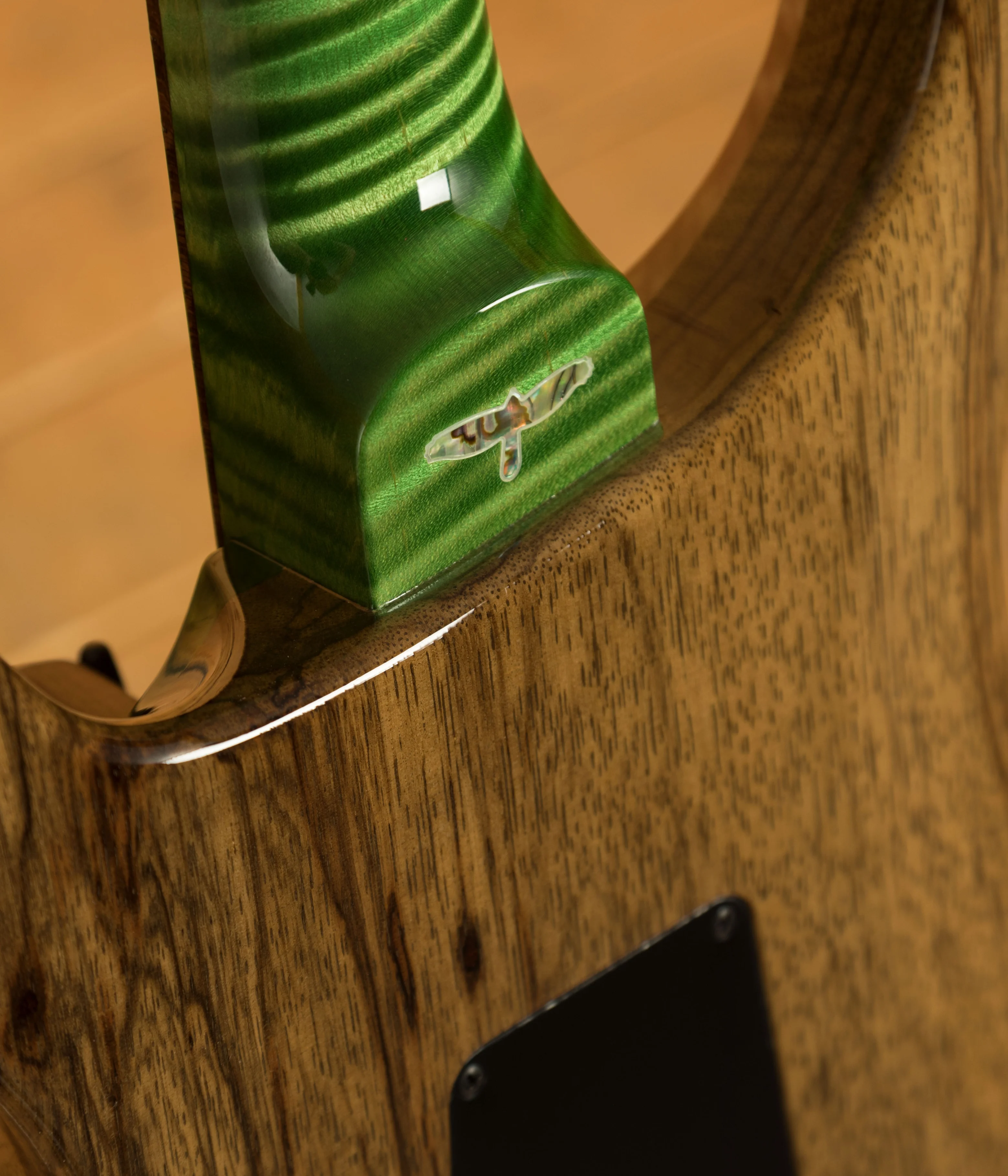 The guitar features a Curly Maple neck, Curly Maple top, and semi-hollow Black Limba back. Its striking Jade Glow colour is complemented by the captivating Ziricote on the fingerboard, headstock, and truss rod cover, inlayed with Abalone birds outlined in Mother of Pearl for an exquisite look. The High Gloss Nitro finish enhances the aesthetic appeal.