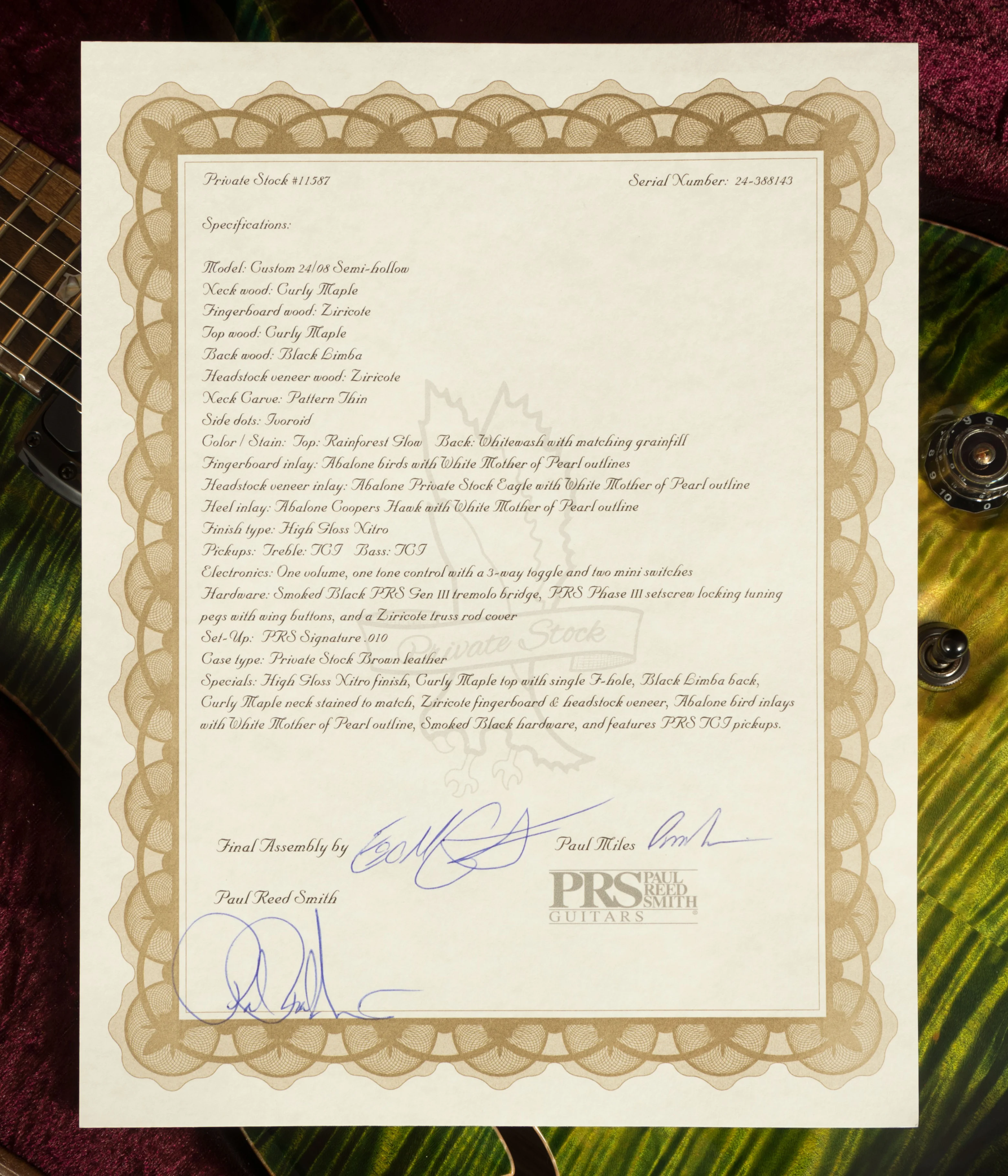 This exceptional guitar comes protected in a stunning Private Stock Brown Leather hard case and includes a certificate signed by Paul Reed Smith, Paul Miles (Director of Private Stock), and the final assembler.