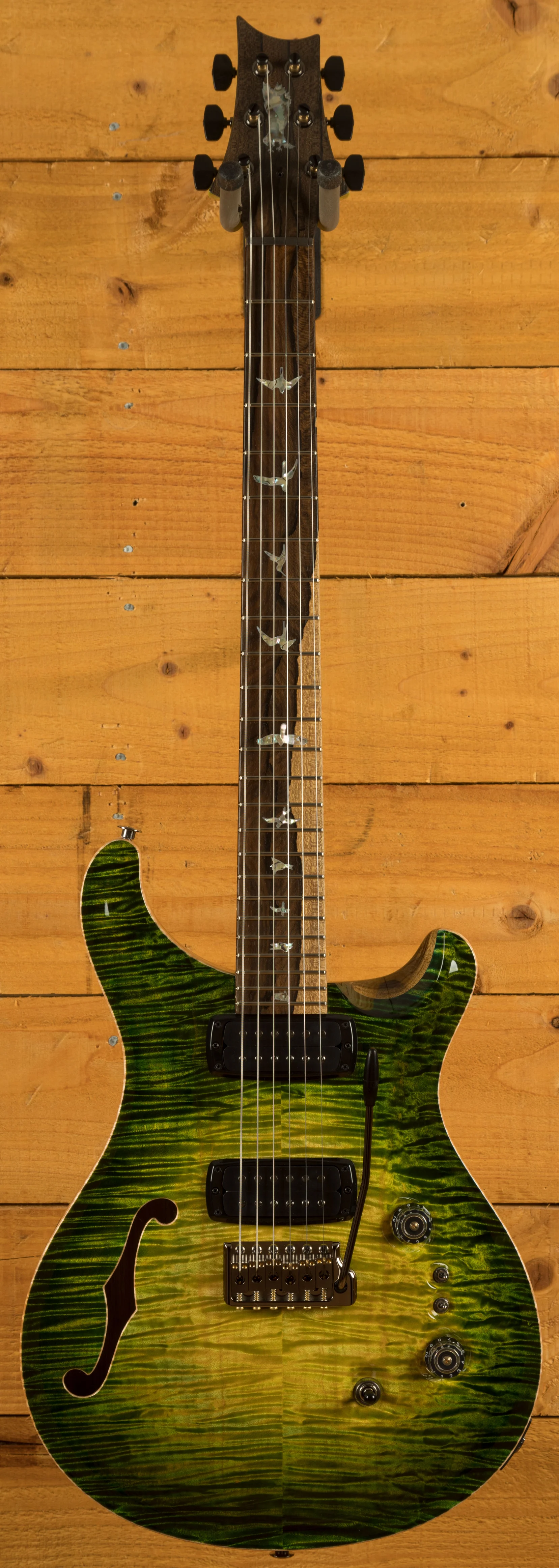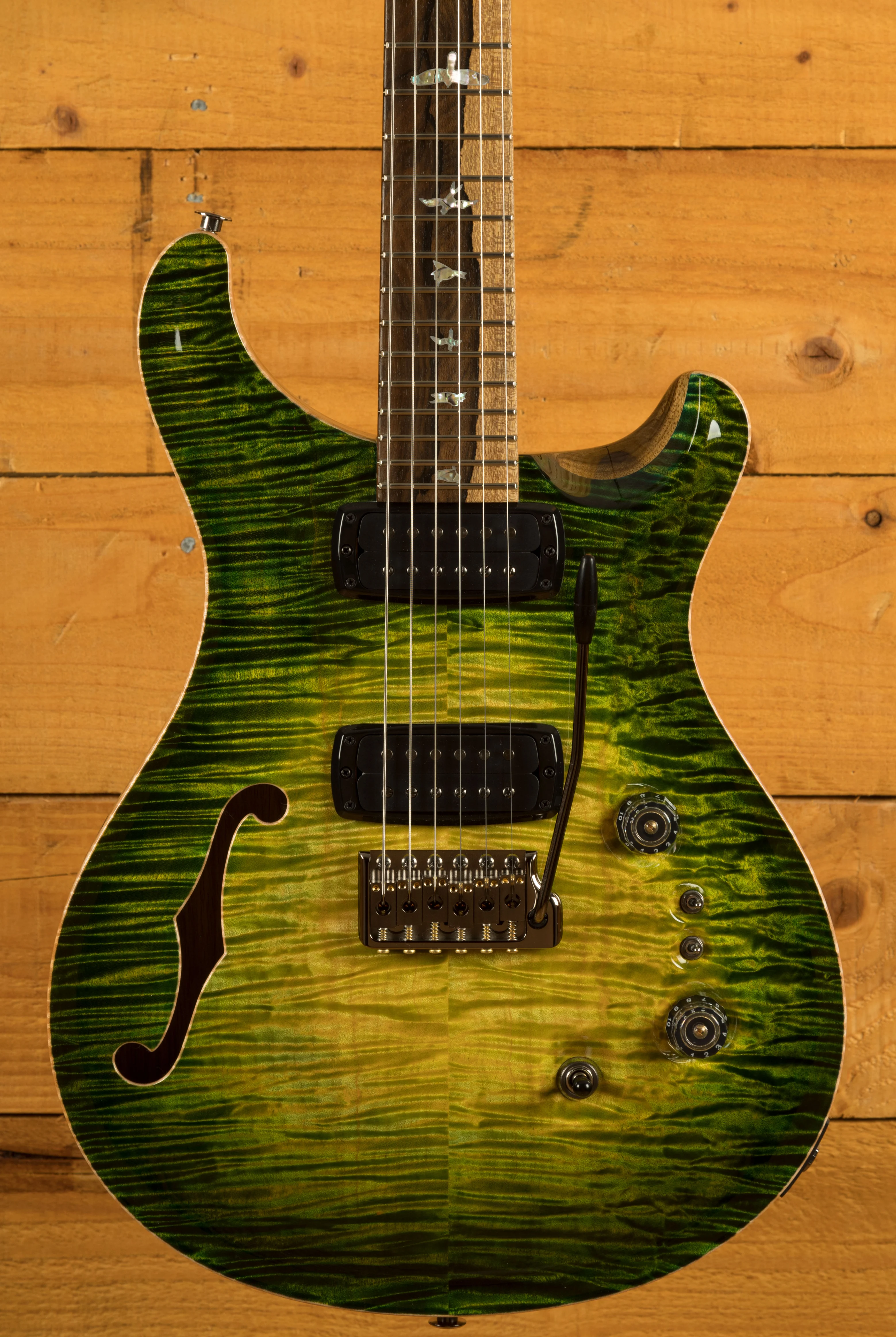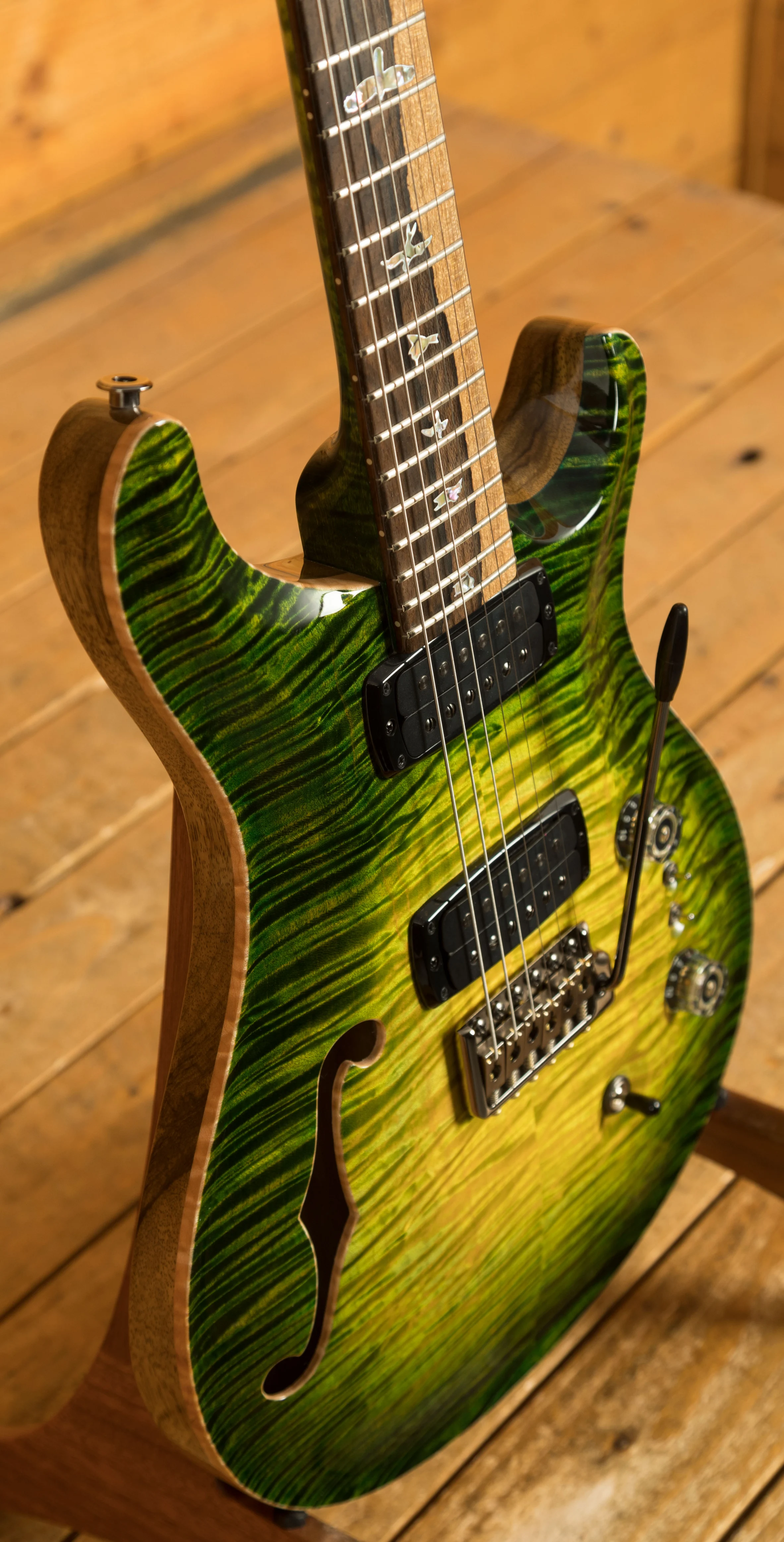 While its visual appeal is undeniably striking, it's crucial to note that this guitar is not merely style-over-substance. At its core, it remains an outstanding Custom 24/08 Semi-Hollow guitar, offering both incredible aesthetics and remarkable sound. Unlike some custom guitars where woods are chosen primarily for their appearance, this guitar balances good looks with tonal excellence.