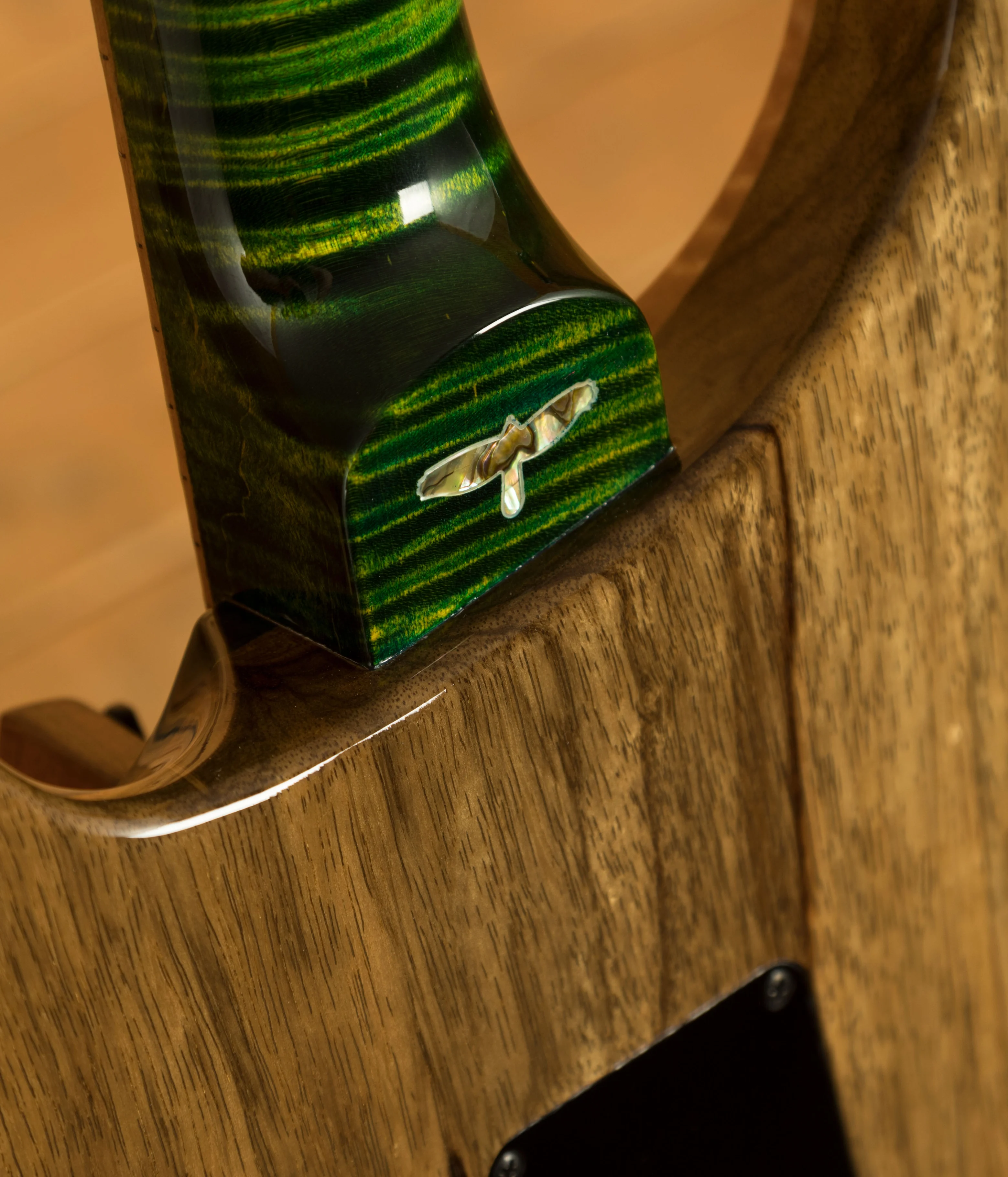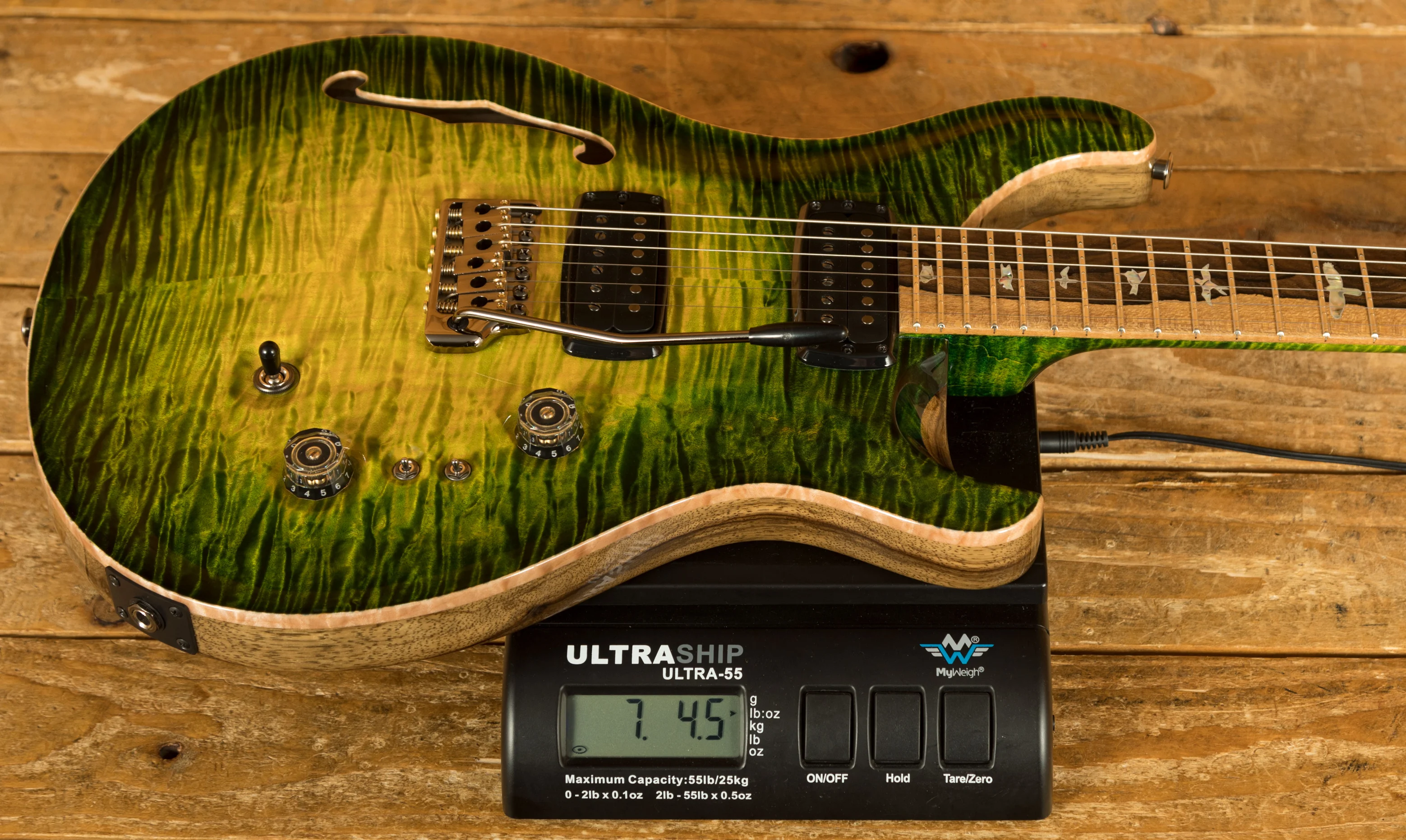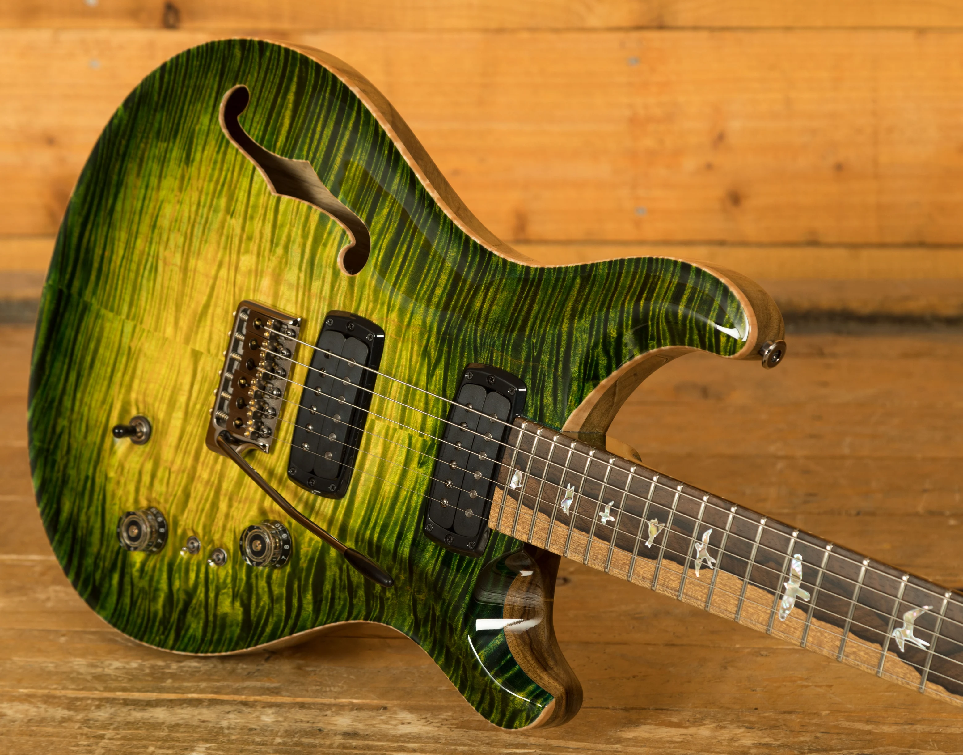 The guitar features a Curly Maple neck, Curly Maple top, and semi-hollow Black Limba back. Its striking Rainforest Glow colour is complemented by the captivating Ziricote on the fingerboard, headstock, and truss rod cover, inlayed with Abalone birds outlined in Mother of Pearl for an exquisite look. The High Gloss Nitro finish enhances the aesthetic appeal.