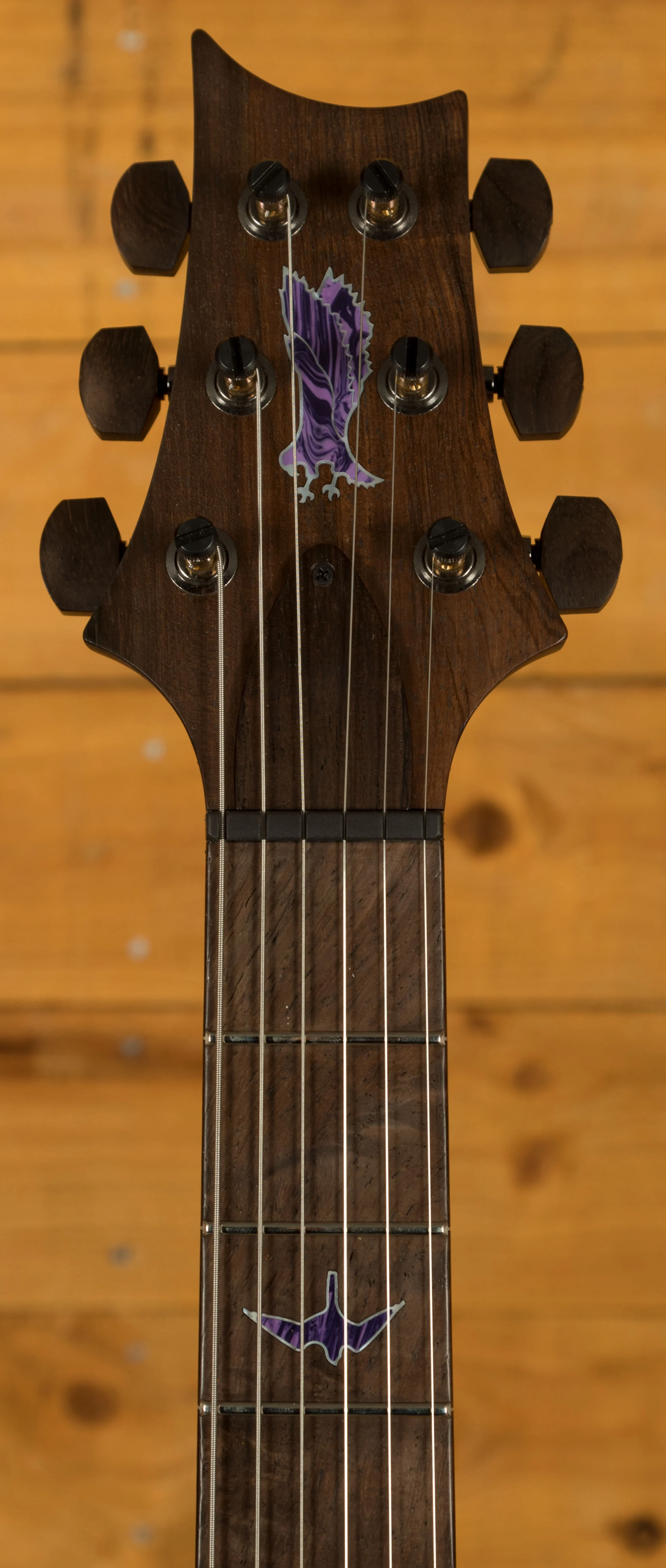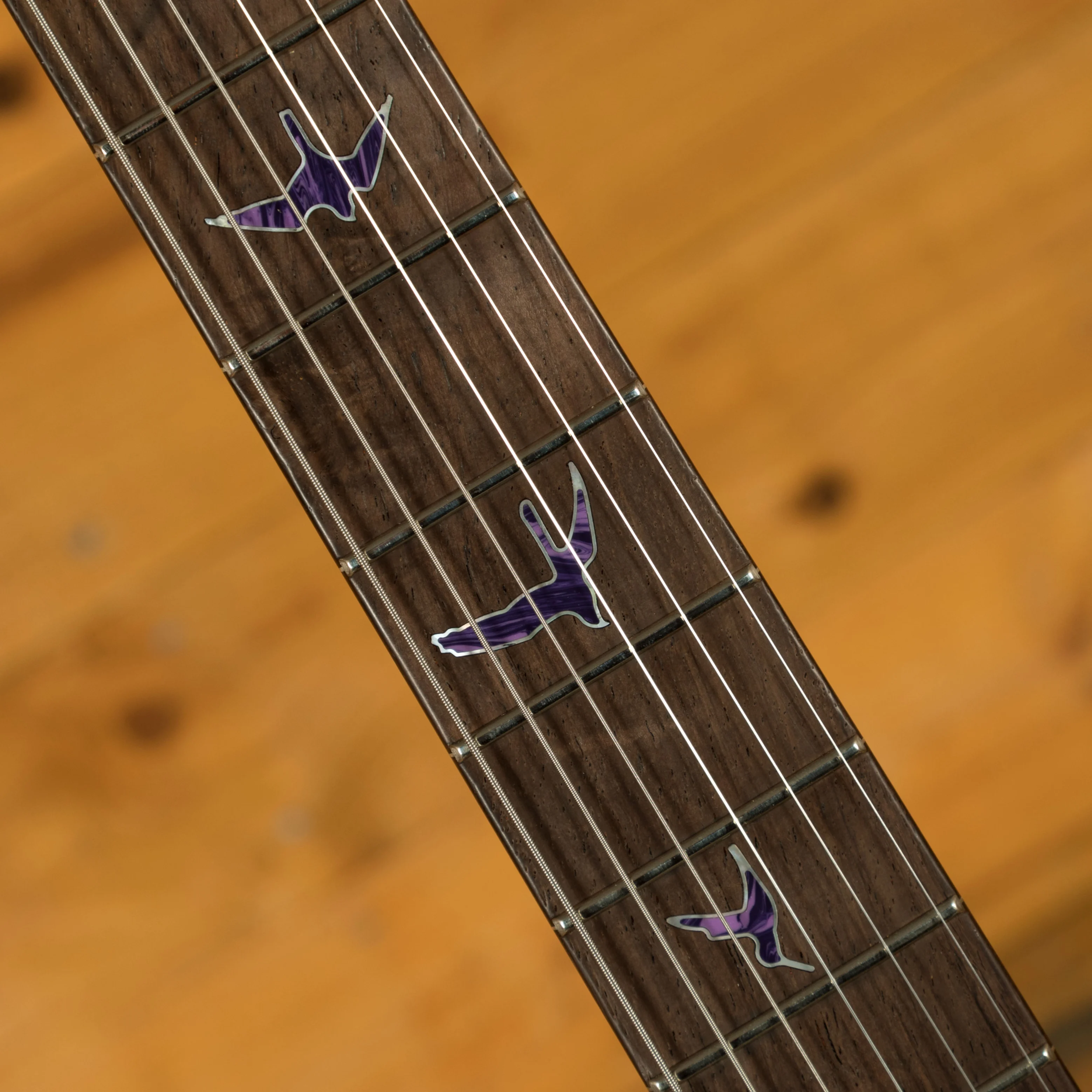 The Fingerboard is one of many eye-catching features of this Private Stock, featuring the classic PRS bird inlays construced from the rare gemstone Charoite, found exclusively from the Aldan Shield in Siberia, Russia. The awesome purple tones pair up brilliantly with the Mother of Pearl outlines to create a brilliant contrast. Finally the neck is beautifully finished with a Brazilian Rosewood headstock veneer adorned with the iconic Charoite Private Stock Eagle sitting proudly. The Attention to detail on this fretboard is truly astonishing and really shows why the PRS Private Stock is held in such high regard.