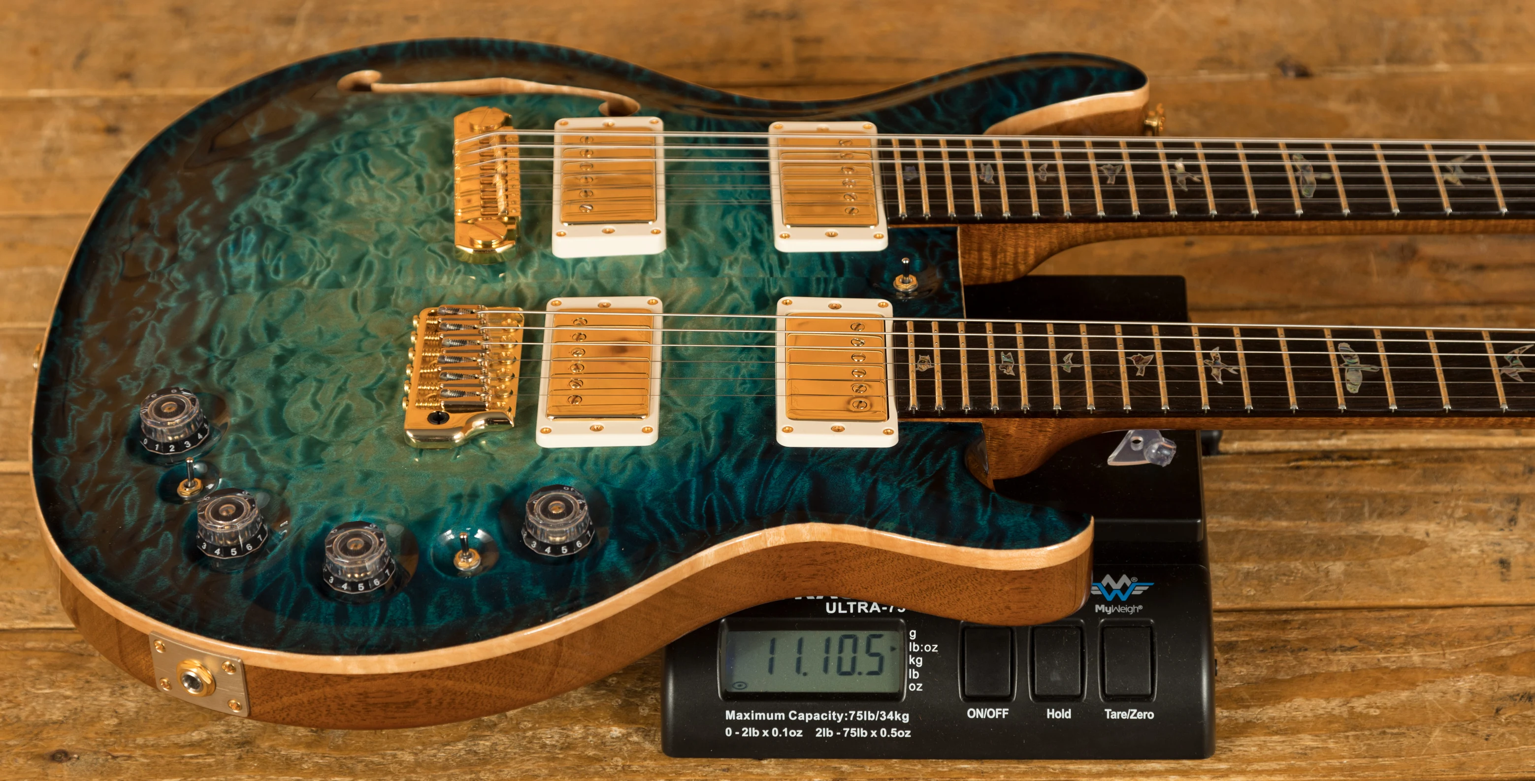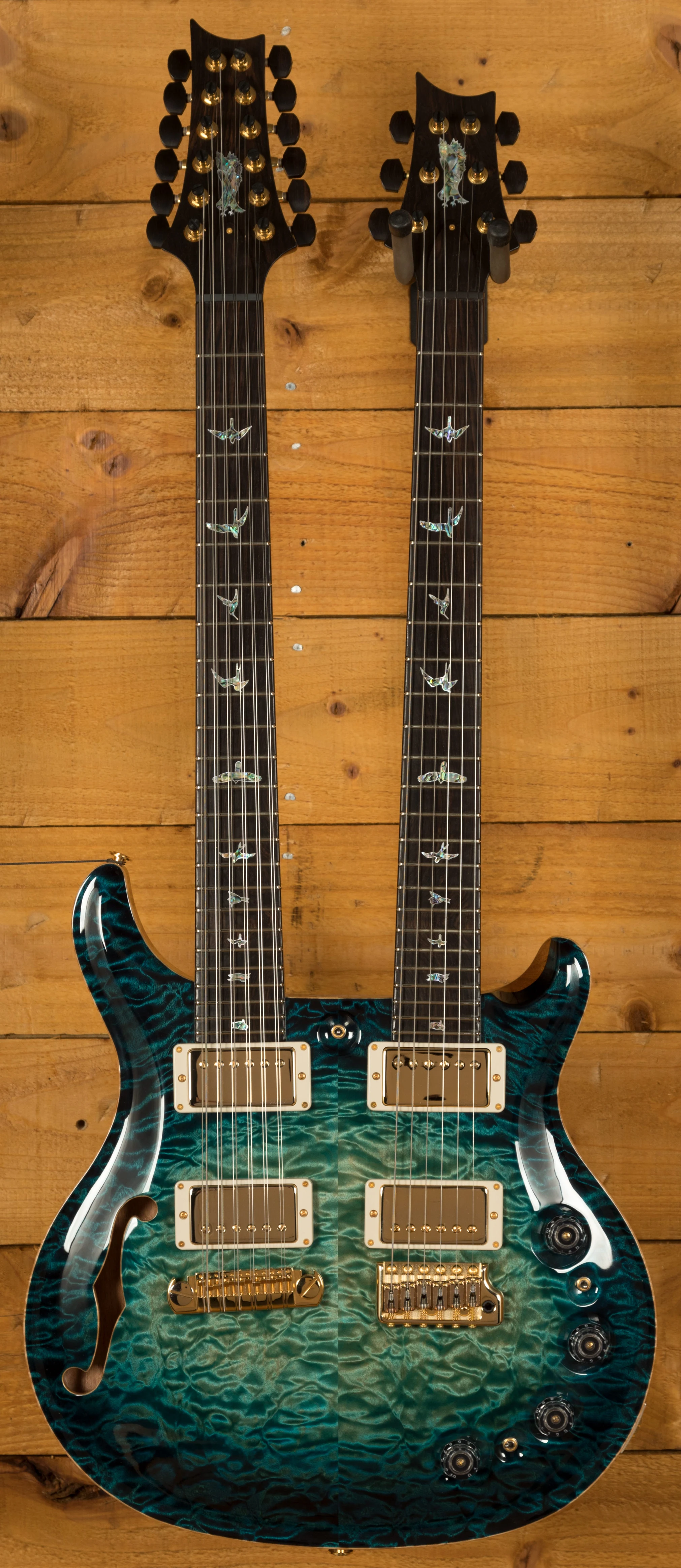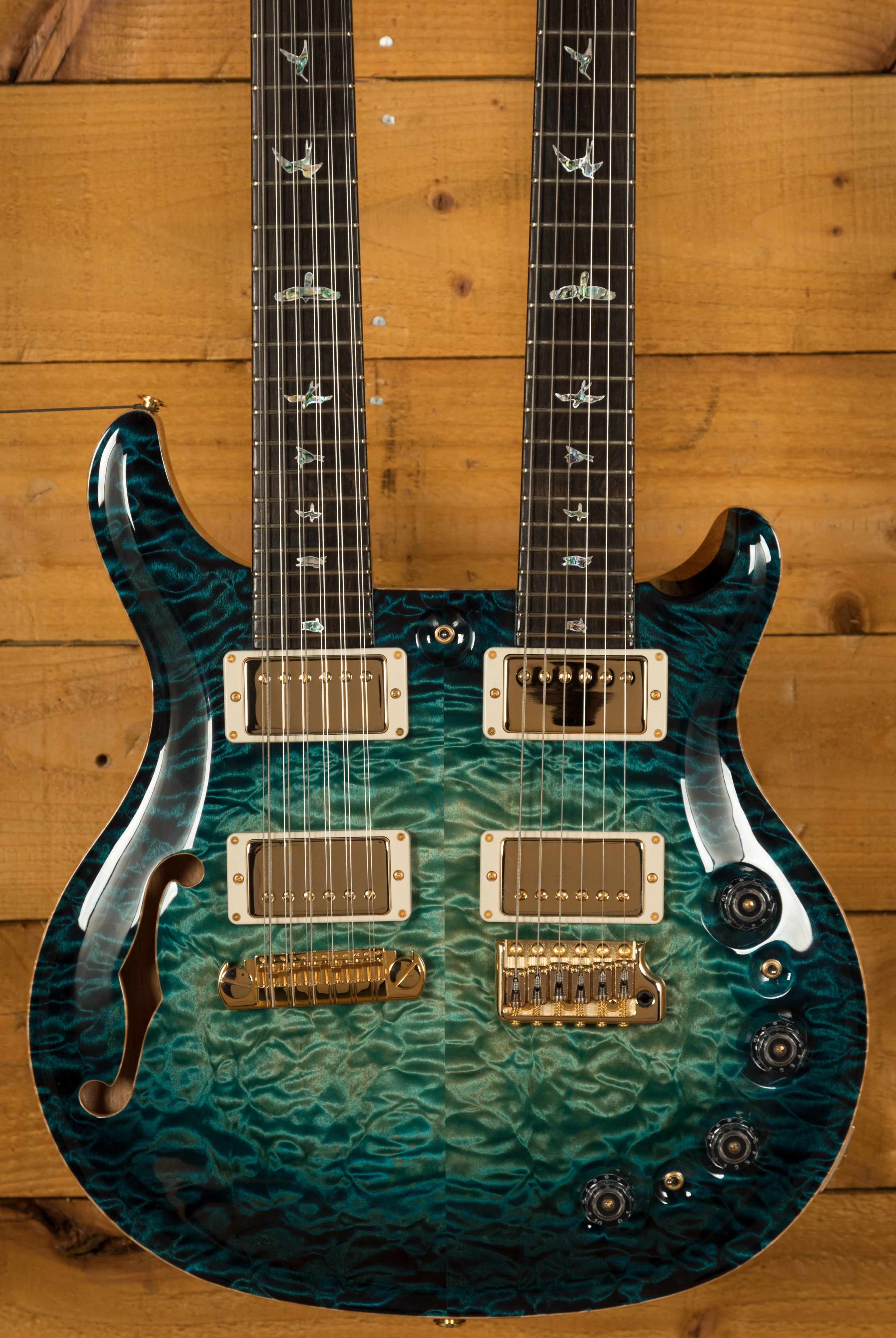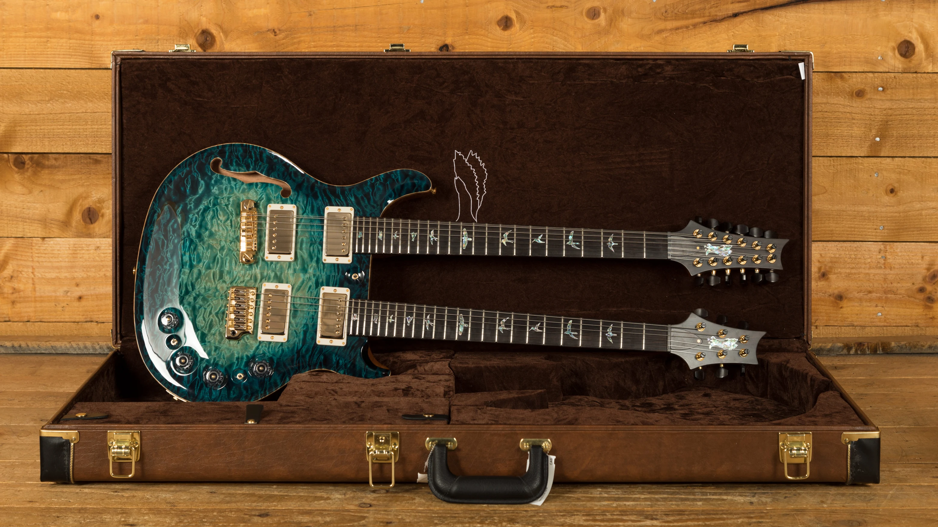 Here at Peach Guitars we are lucky enough to stock some of the highest quality instruments on the market. Every so often we receive one that really does take all of our breath away. This example is a truly stunning PRS Private Stock 24 Fret Double neck Semi-hollow, built to the highest possible standards using hand selected woods, this really is the height of modern guitar construction.