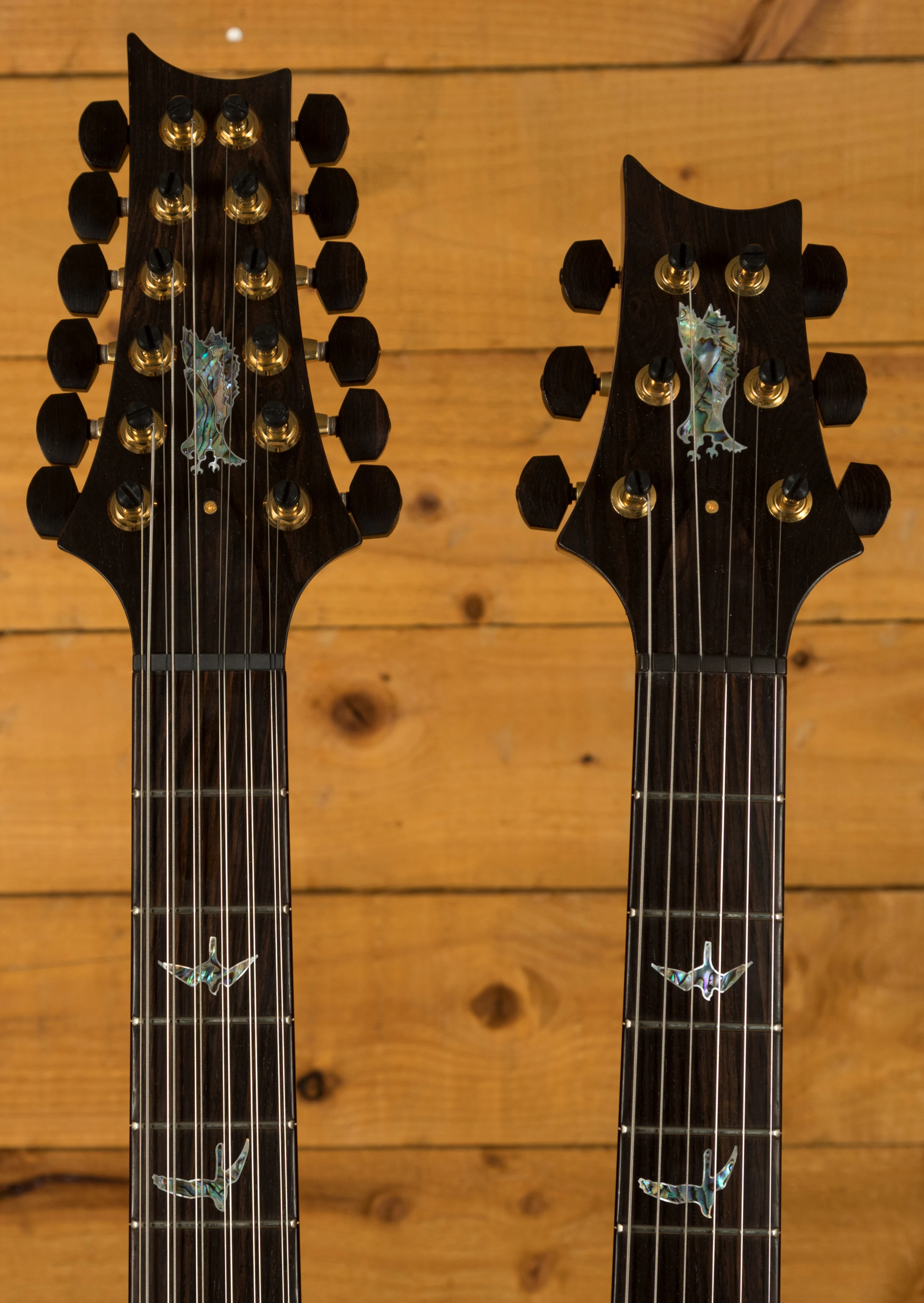 The defining feature of this Private Stock PRS is of course the inclusion of two Fiddleback Mahogany necks, one as a 12-string setup, and the other as a standard 6-string. Both necks feature the awesome Pattern Thin neck carves for ease of playing allowing for a premium experience. Paired up with an African Blackwood fingerboard which boasts Paua bird inlays with Mother of Pearl outlines and of course 24 frets allowing you to really reach those higher notes. The PRS Private Stock Eagle rests proudly upon both headstocks, this really is the very best of modern guitar manufacture.