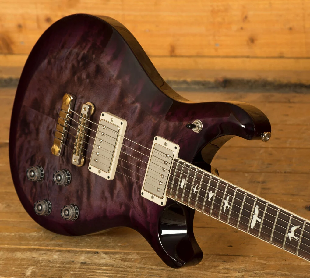 In classic PRS style we have a brilliant Mahogany body with a beautifully figured Quilted Maple top finished in Faded Grey Black/Purple Burst. With the Nickel hardware it looks super slick and is brilliantly weighted.