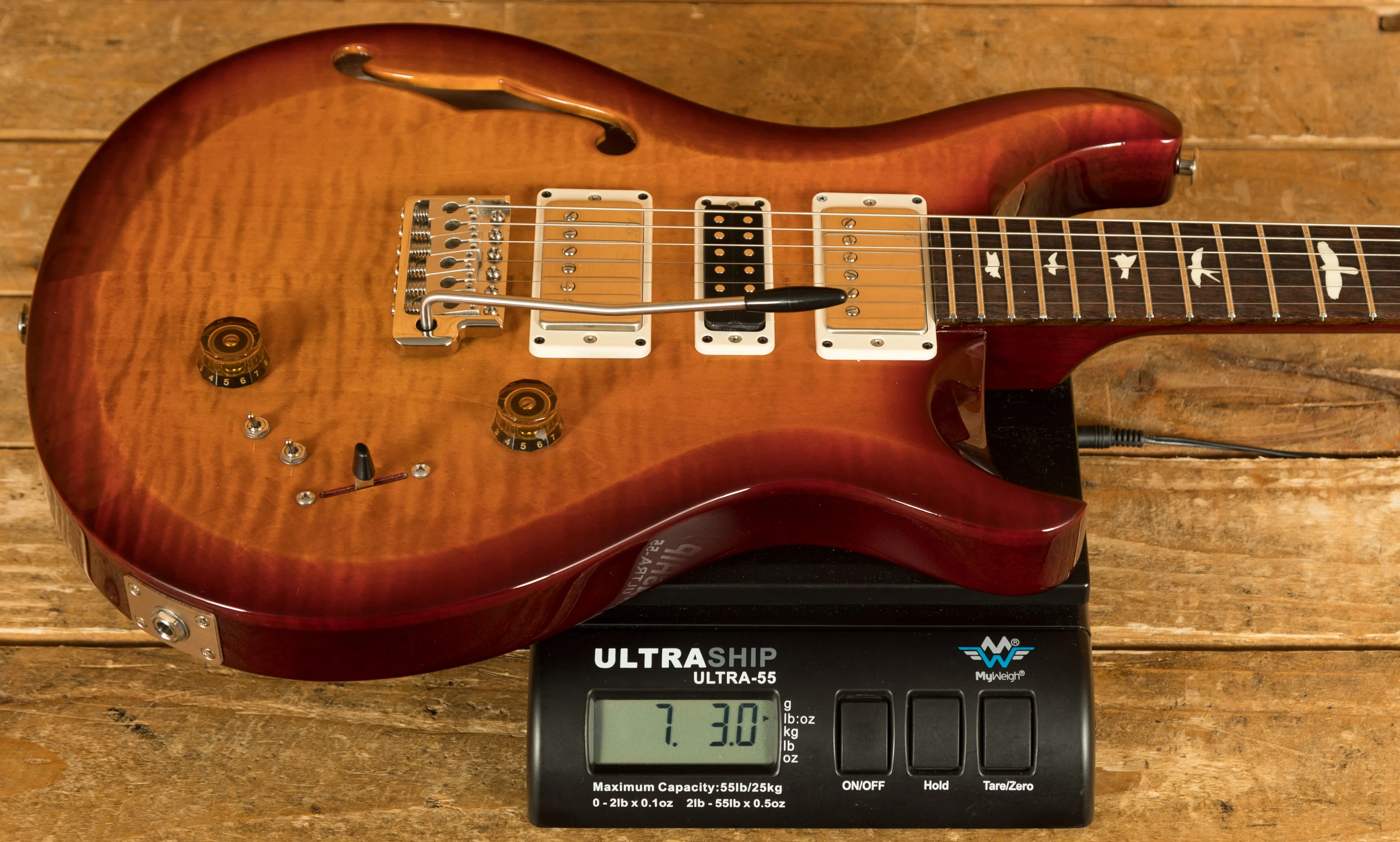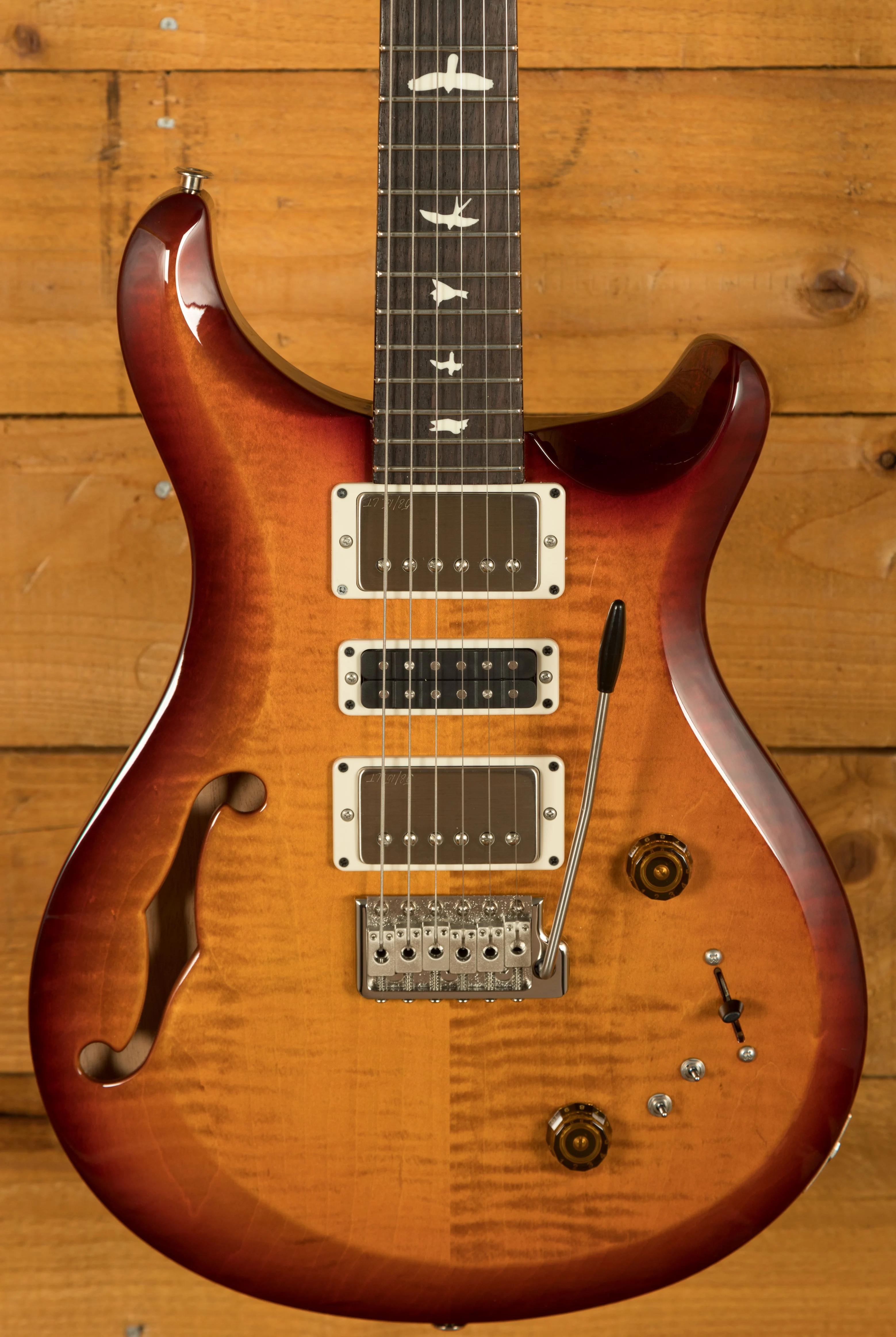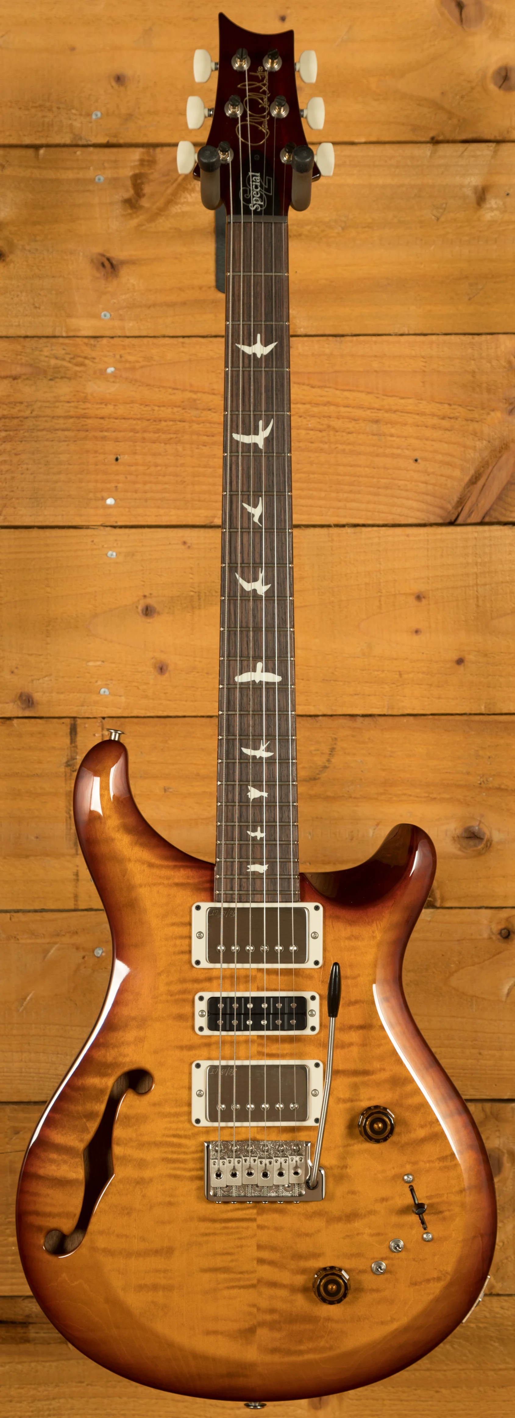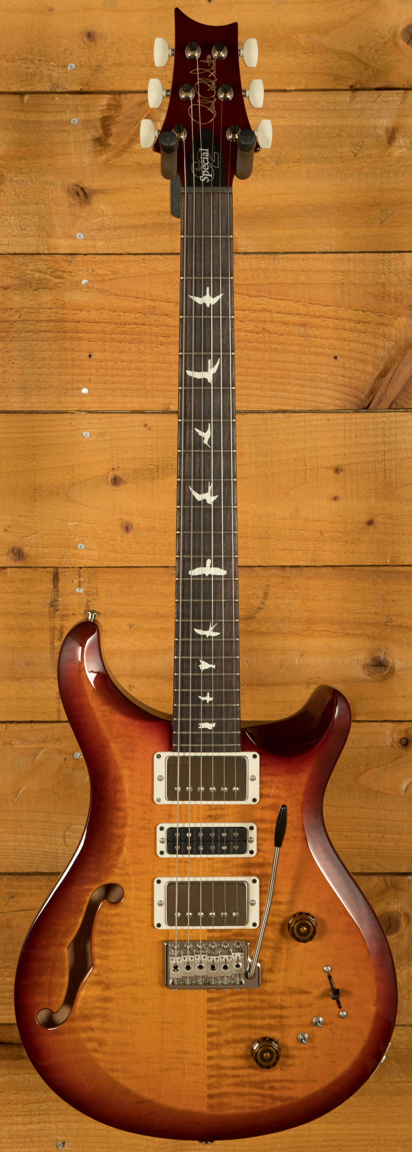 Built with a semi-hollow body featuring a carved maple top and mahogany back, the S2 Special Semi-Hollow produces natural resonance, sustain, and depth that enhance its tonal character. The 22-fret, 25" scale length Pattern Regular mahogany neck with a 10" radius rosewood fingerboard ensures comfortable playability across the entire range. Signature PRS bird inlays not only provide a refined aesthetic but also serve as practical position markers. This construction strikes an ideal balance between tonal richness, durability, and player comfort.