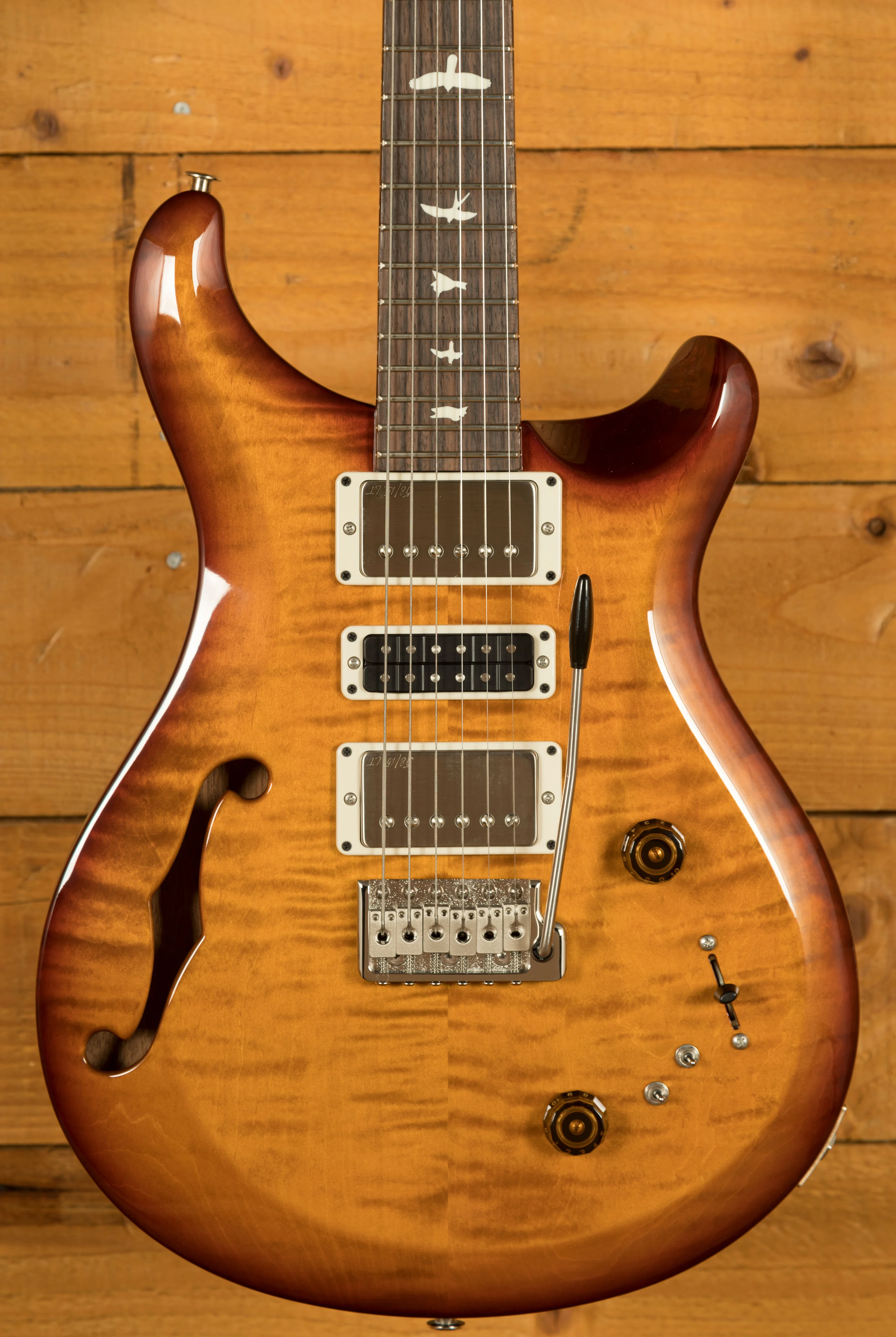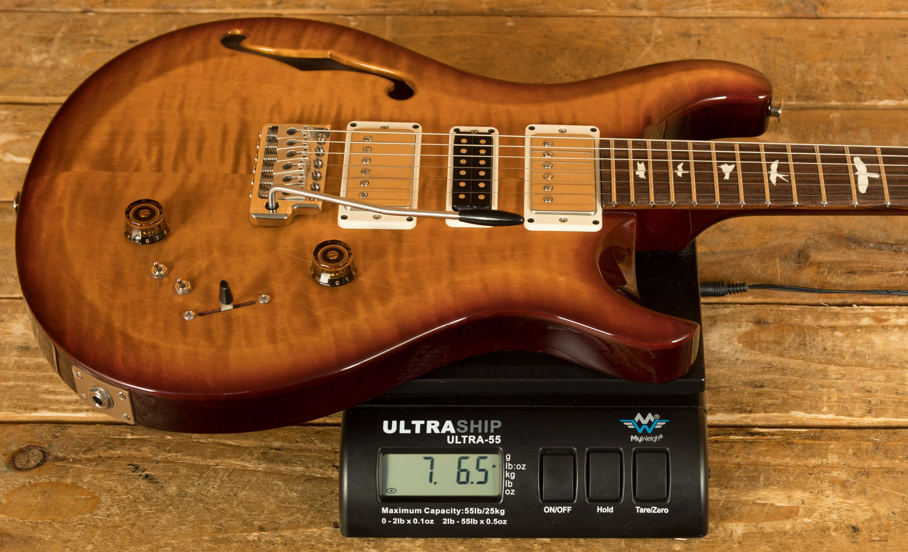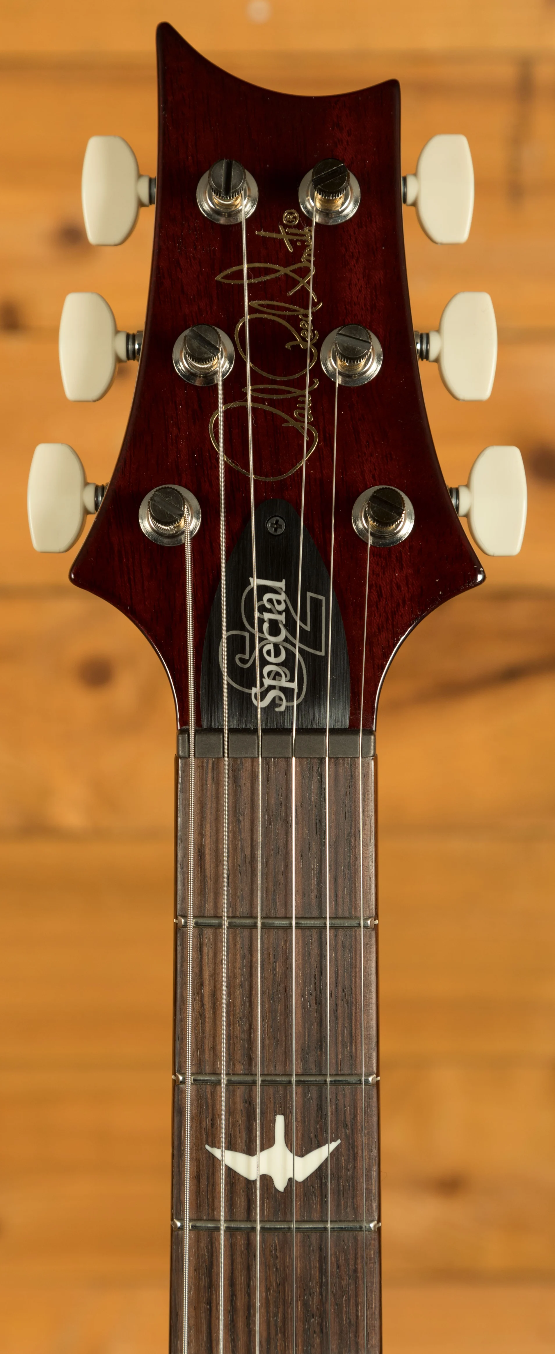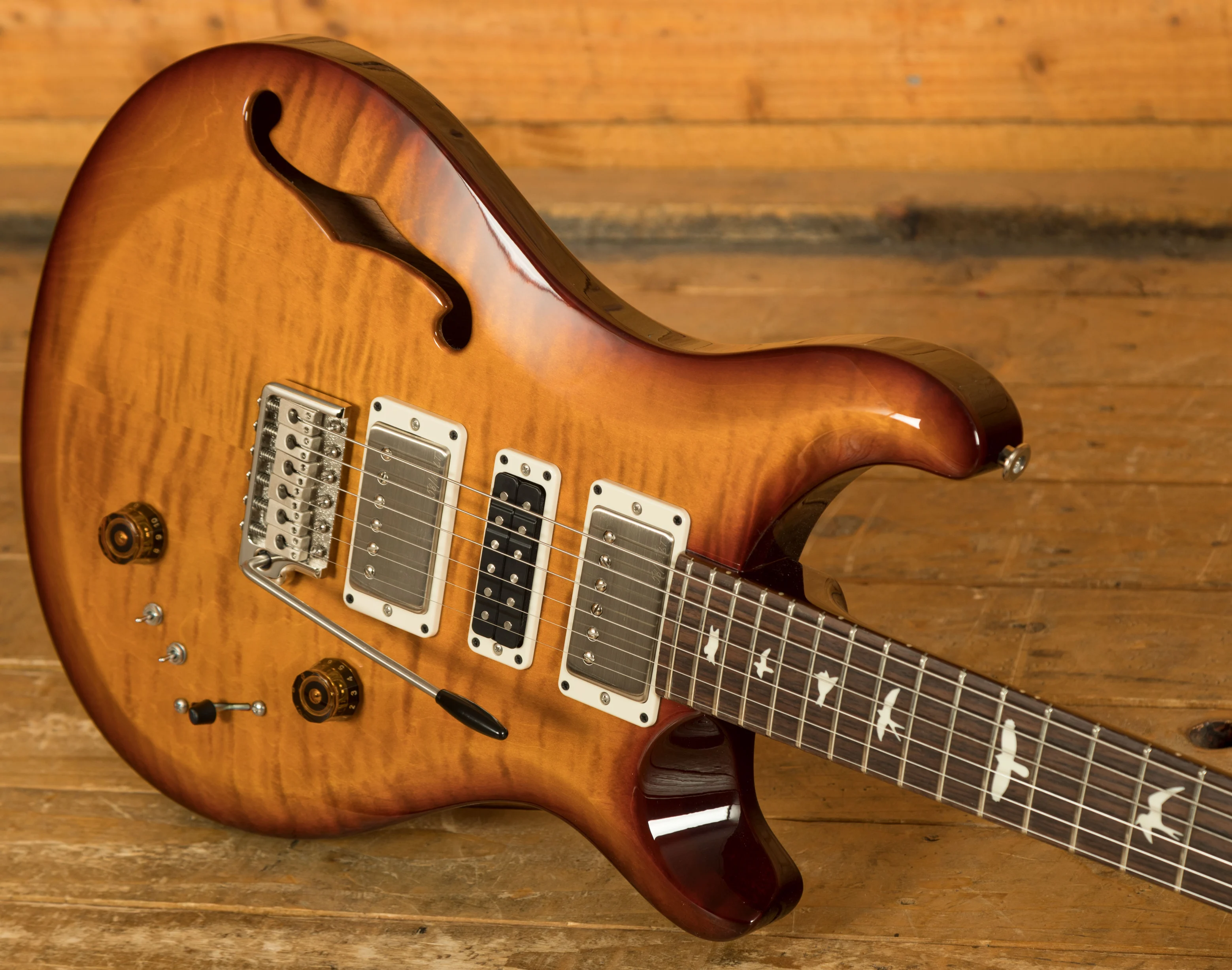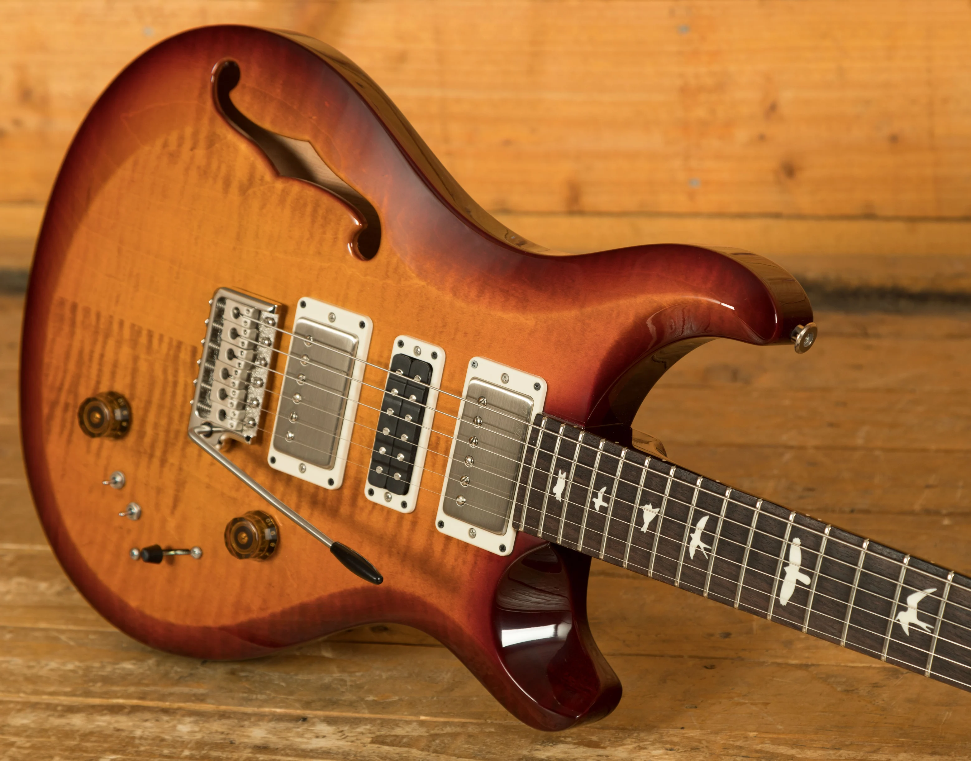 Built with a semi-hollow body featuring a carved maple top and mahogany back, the S2 Special Semi-Hollow produces natural resonance, sustain, and depth that enhance its tonal character. The 22-fret, 25" scale length Pattern Regular mahogany neck with a 10" radius rosewood fingerboard ensures comfortable playability across the entire range. Signature PRS bird inlays not only provide a refined aesthetic but also serve as practical position markers. This construction strikes an ideal balance between tonal richness, durability, and player comfort.