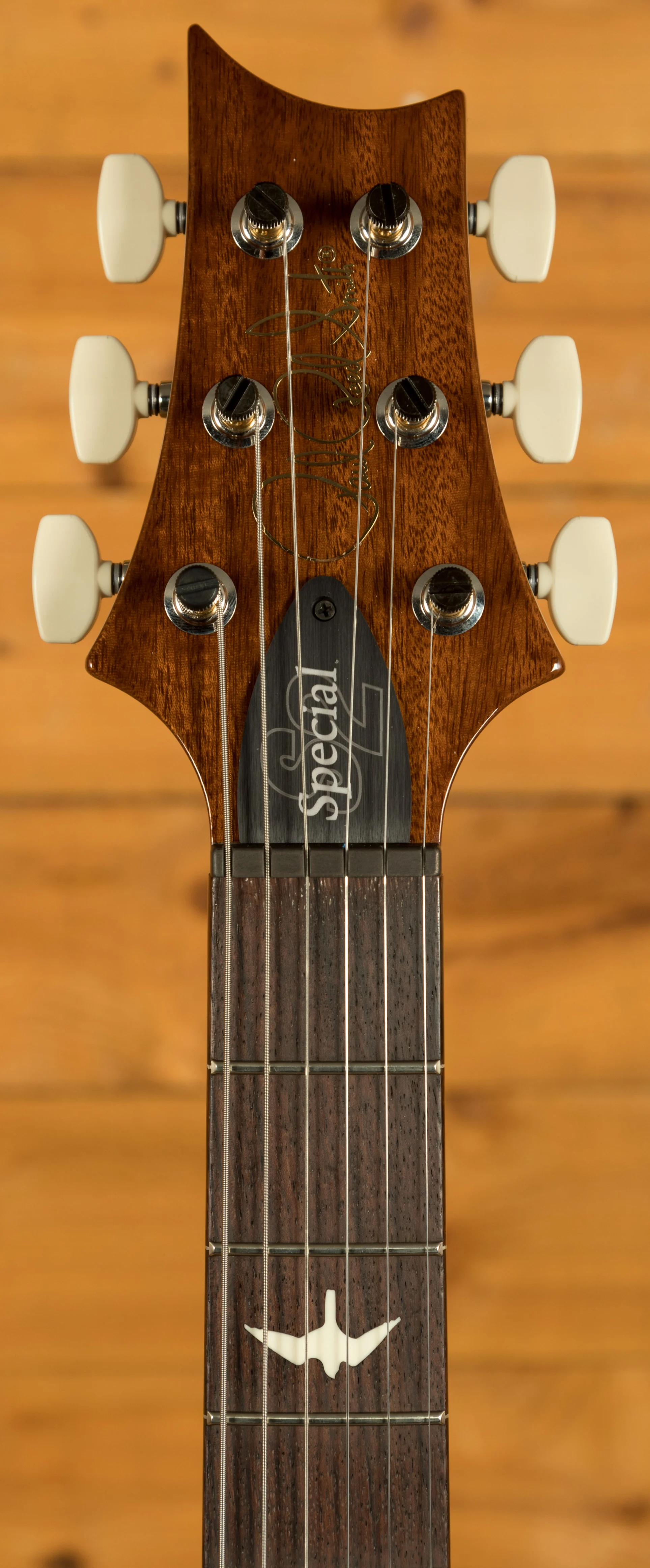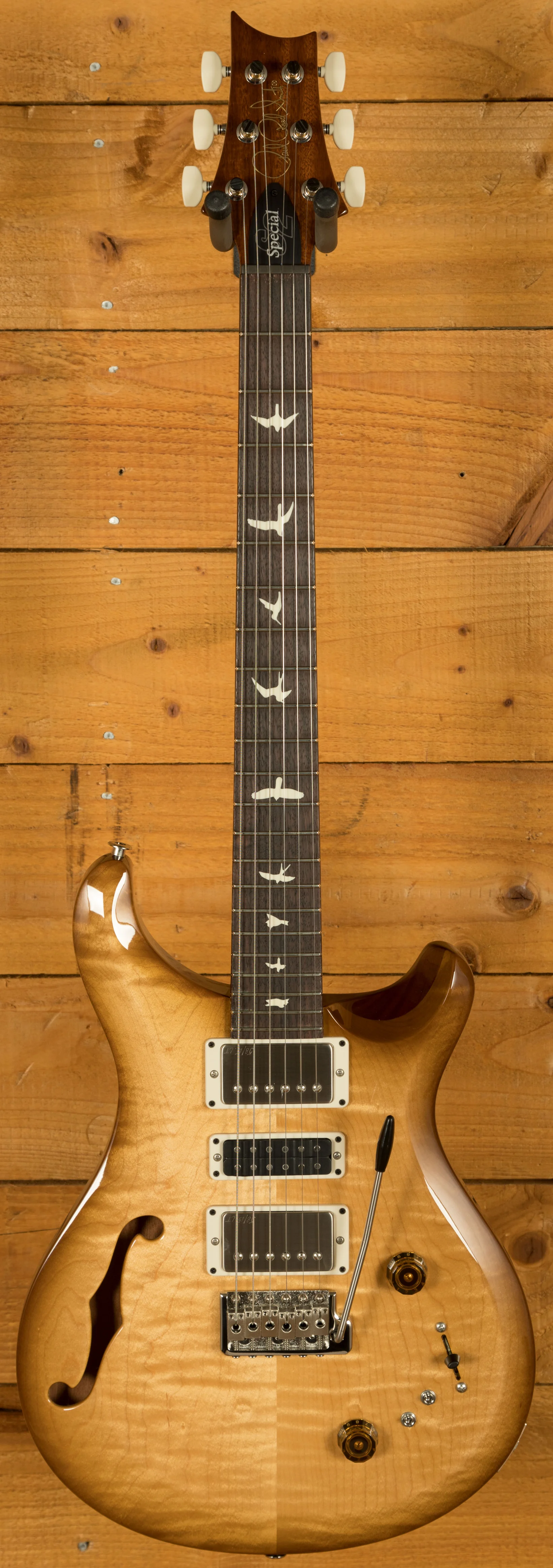 Built with a semi-hollow body featuring a carved maple top and mahogany back, the S2 Special Semi-Hollow produces natural resonance, sustain, and depth that enhance its tonal character. The 22-fret, 25" scale length Pattern Regular mahogany neck with a 10" radius rosewood fingerboard ensures comfortable playability across the entire range. Signature PRS bird inlays not only provide a refined aesthetic but also serve as practical position markers. This construction strikes an ideal balance between tonal richness, durability, and player comfort.
