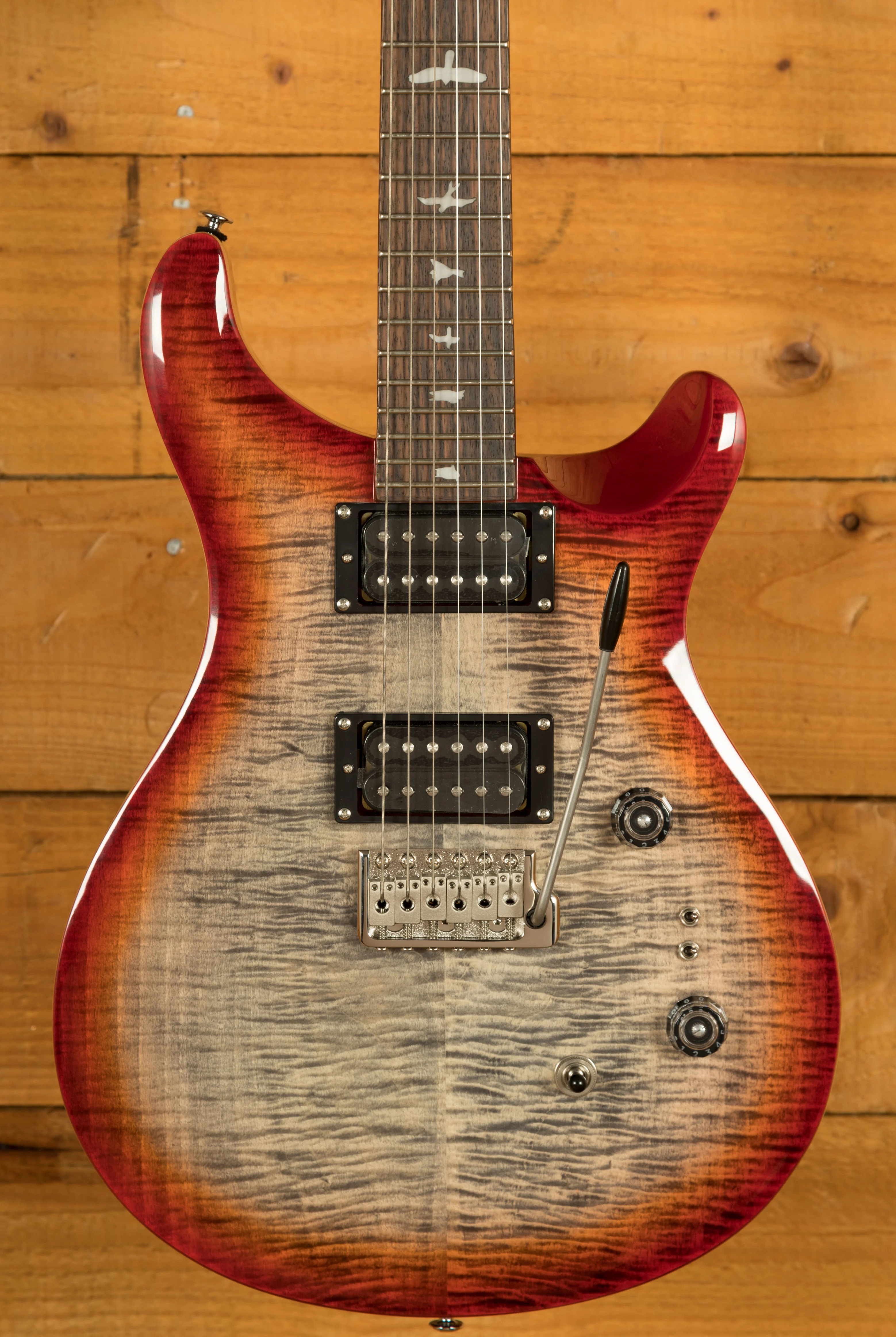 The SE Custom 24-08 retains classic design elements, including a maple top, mahogany back, rosewood fretboard, 24 frets, 25 scale length, bird inlays, signature headstock logo, and PRS patented moulded tremolo. The patented design of the tremolo system provides tonal fidelity, player comfort, and tuning stability that is second to none. You can play with confidence knowing that your tuning will remain stable no matter how much you use the tremolo arm.