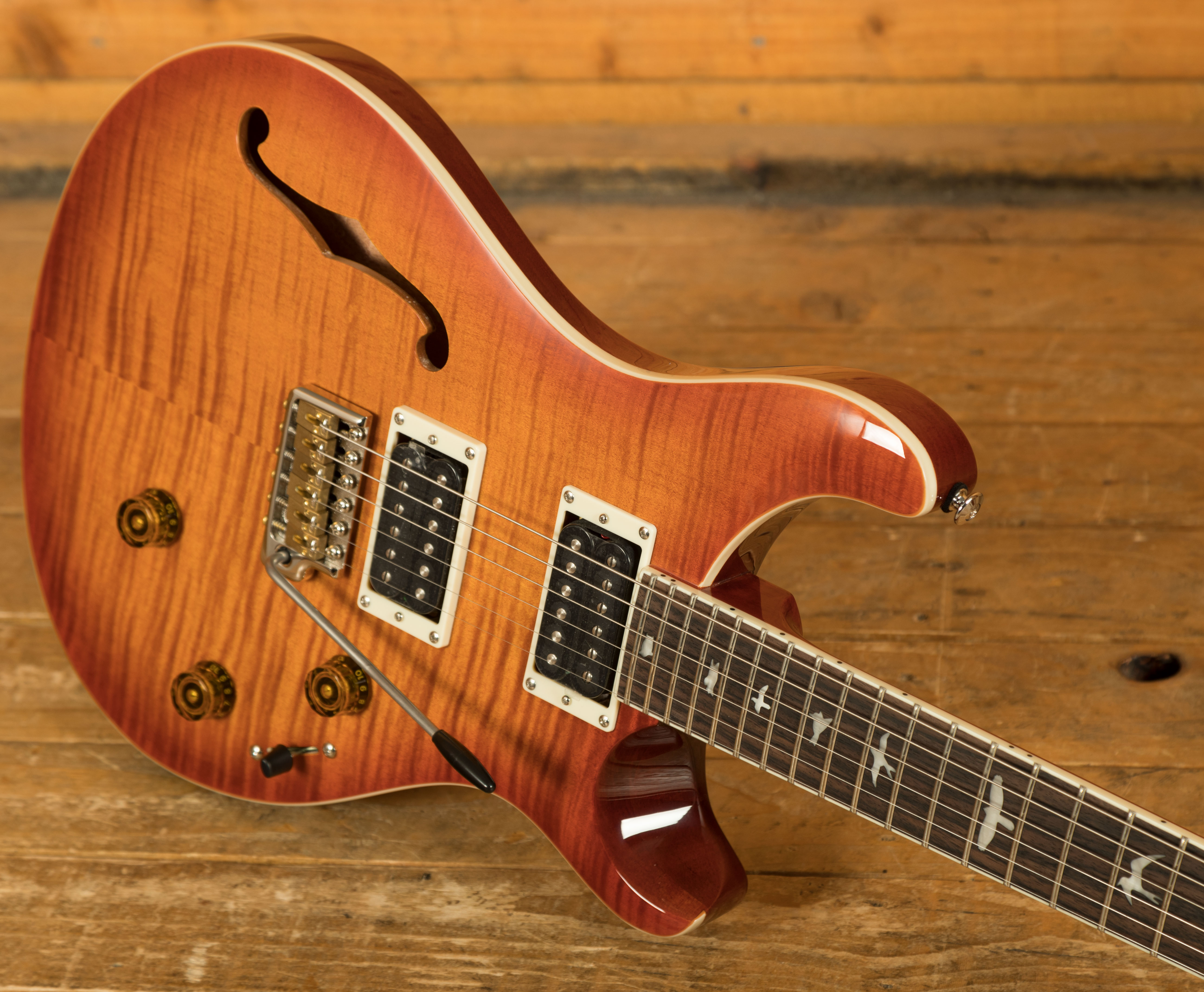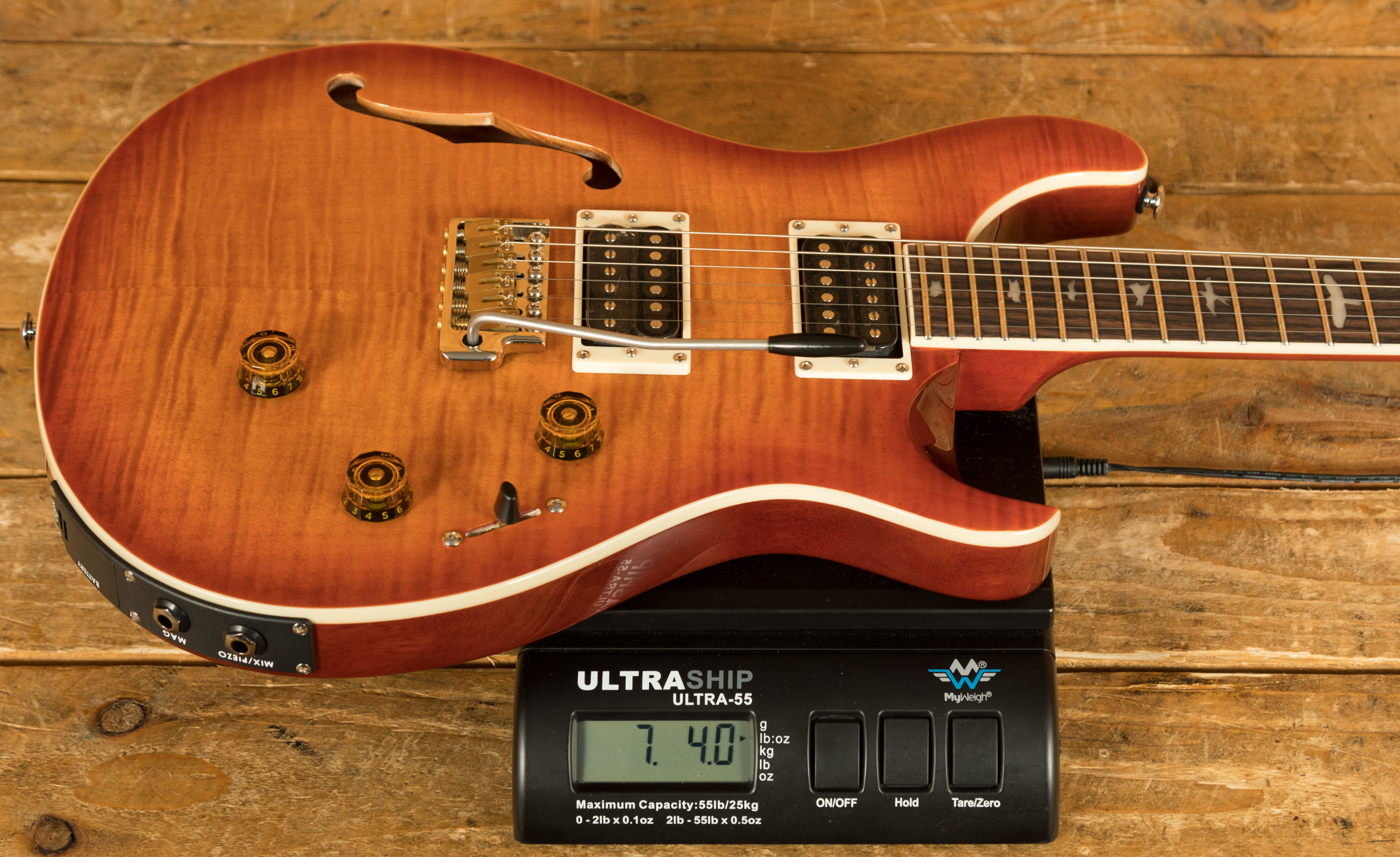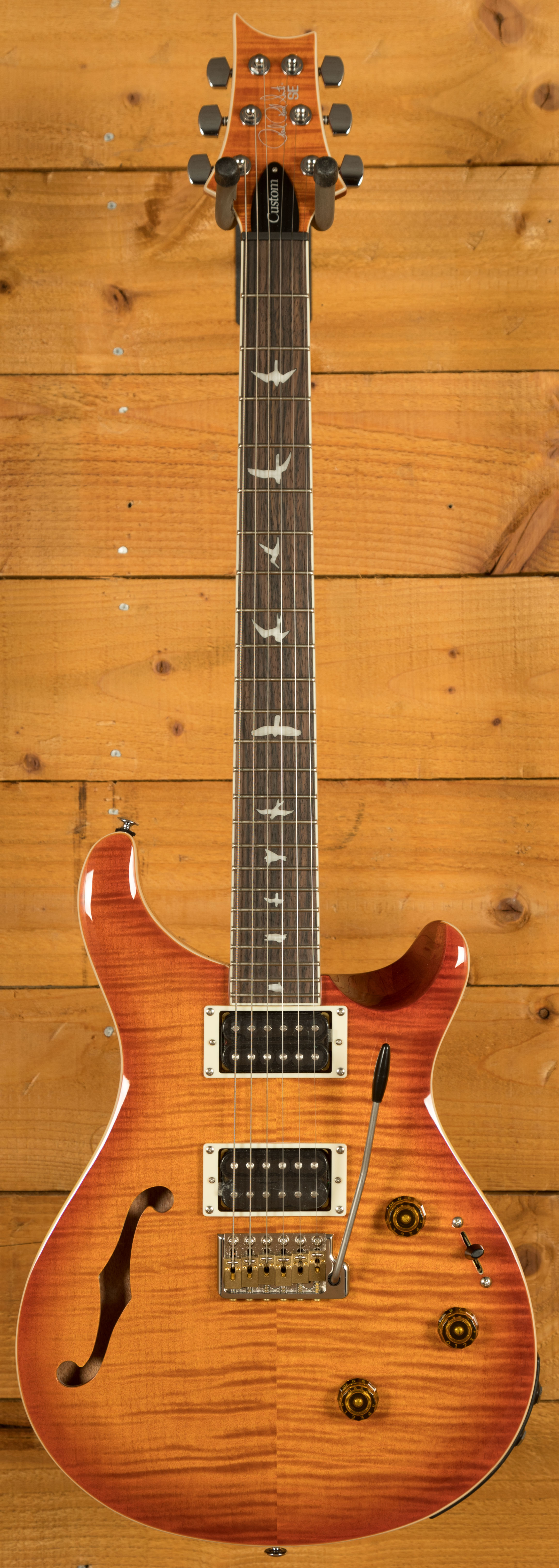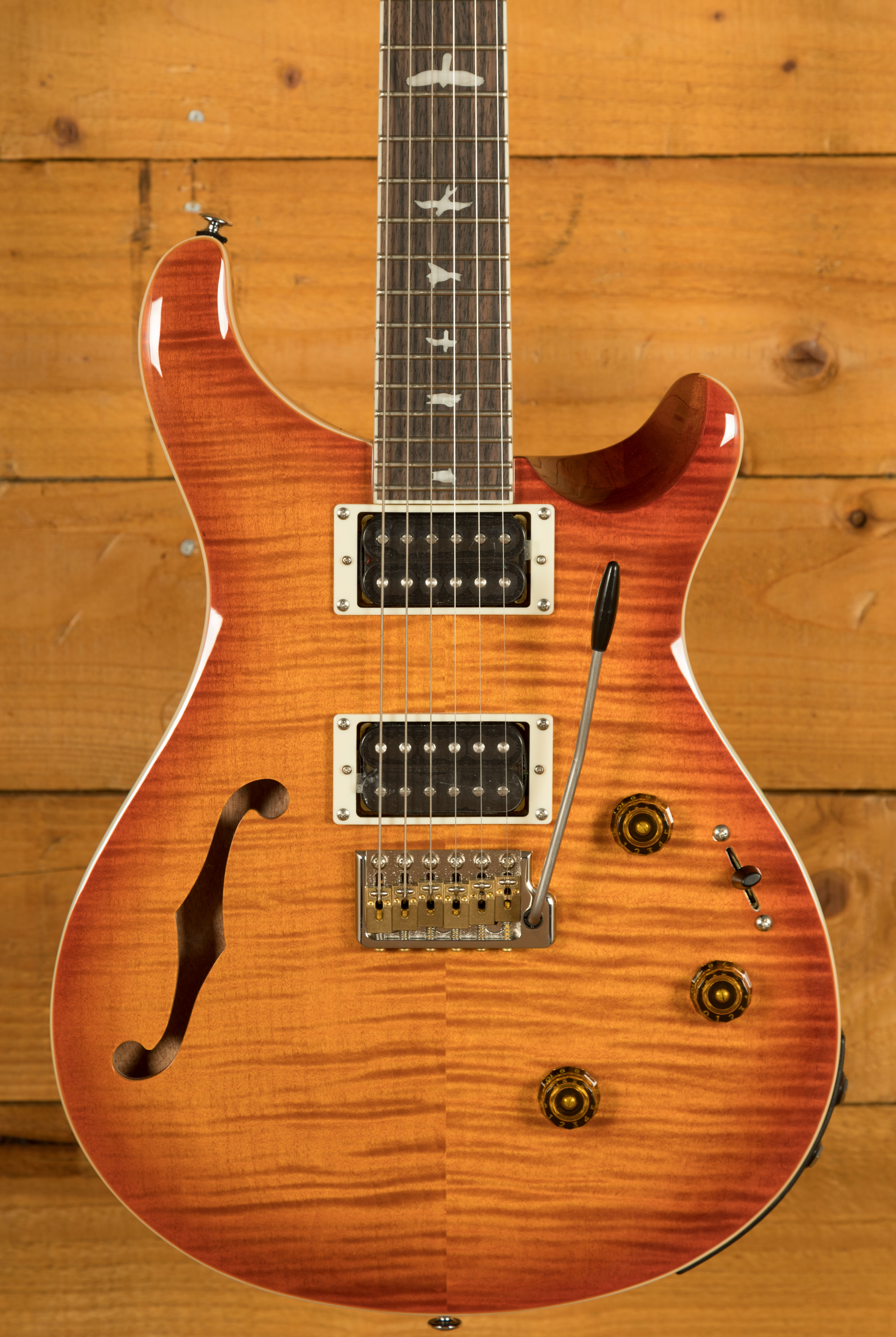 The PRS SE Custom 24 Semi-Hollow Piezo is a versatile and thoughtfully designed guitar that combines the best of electric and acoustic tones. Originally introduced in 1985, the Custom 24 is a cornerstone of PRS's lineup. This semi-hollow iteration takes the iconic design further, offering enhanced resonance and a more dynamic tonal range. Its semi-hollow body construction features a maple top with a flame maple veneer, a mahogany back, and a single F-hole, delivering a warm and articulate sound with a lightweight, comfortable feel.
