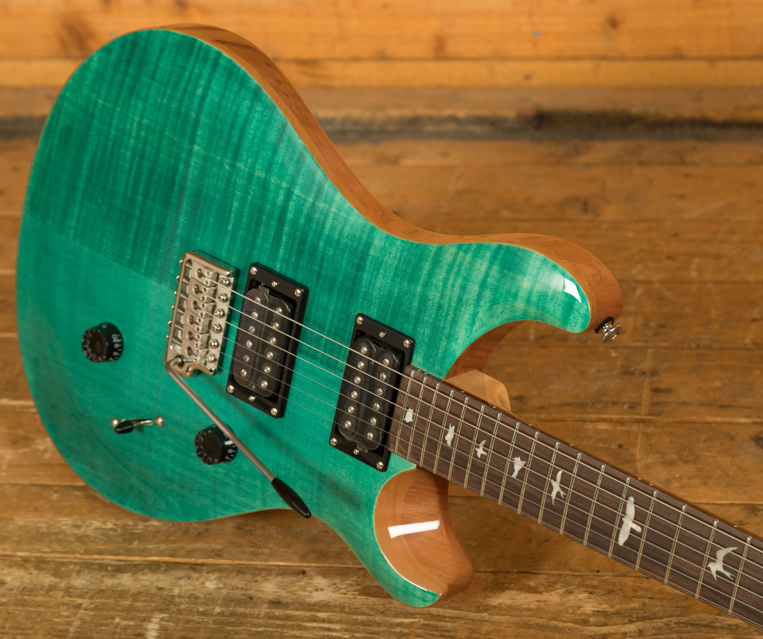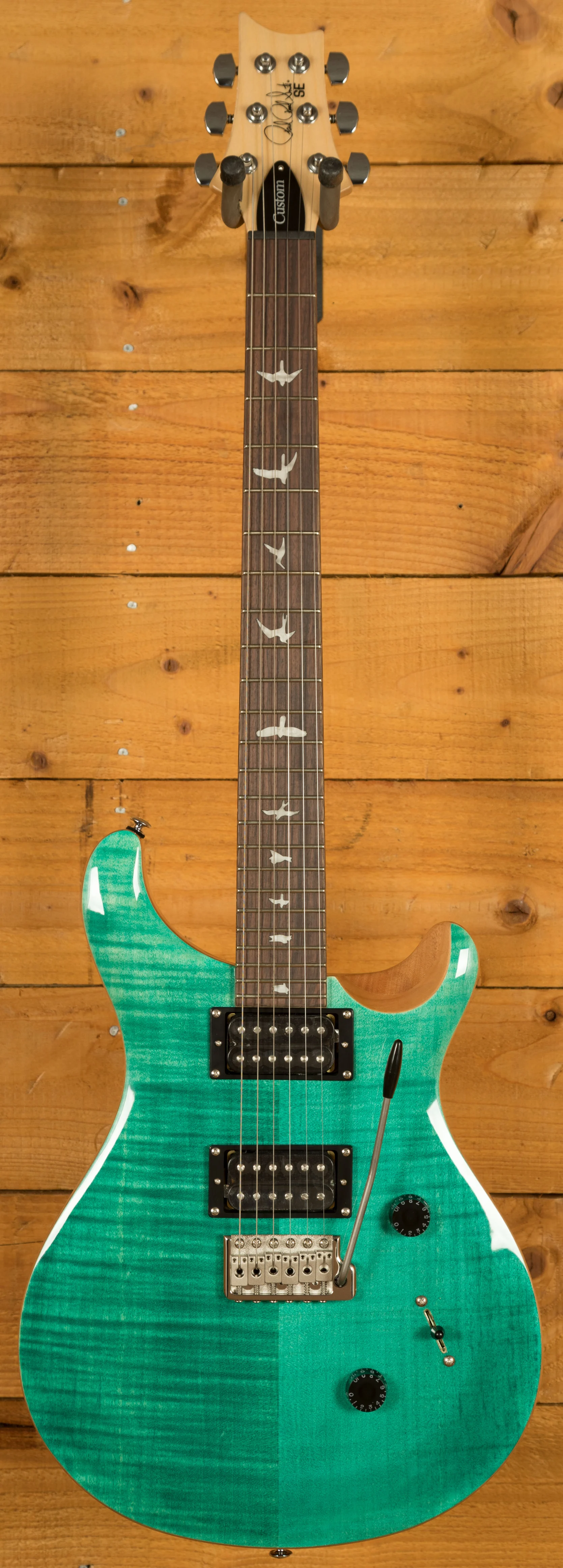 The PRS SE Custom 24 in Turquoise offers professional quality and classic PRS design at an incredibly competitive price. This guitar brings the original PRS design platform to the more affordable SE lineup, making it accessible to a wider range of players, from internationally touring artists to aspiring musicians. The SE Custom 24 features a maple top with a flame maple veneer, a mahogany back, and a comfortable wide thin maple neck. The rosewood fretboard is adorned with PRS's signature bird inlays, and the guitar is equipped with the PRS patented molded tremolo for smooth vibrato and excellent tuning stability.